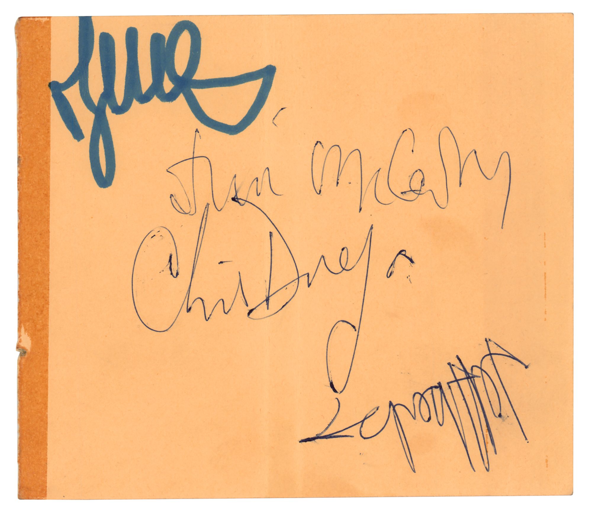 Vintage ballpoint signatures, "Jeff Beck," "Jim McCarty," and "Chris Dreja,” on a yellow 4.5 x 4 album page, which also bears an unknown felt tip signature. In fine condition, with a vertical fold and a couple of small stains.
