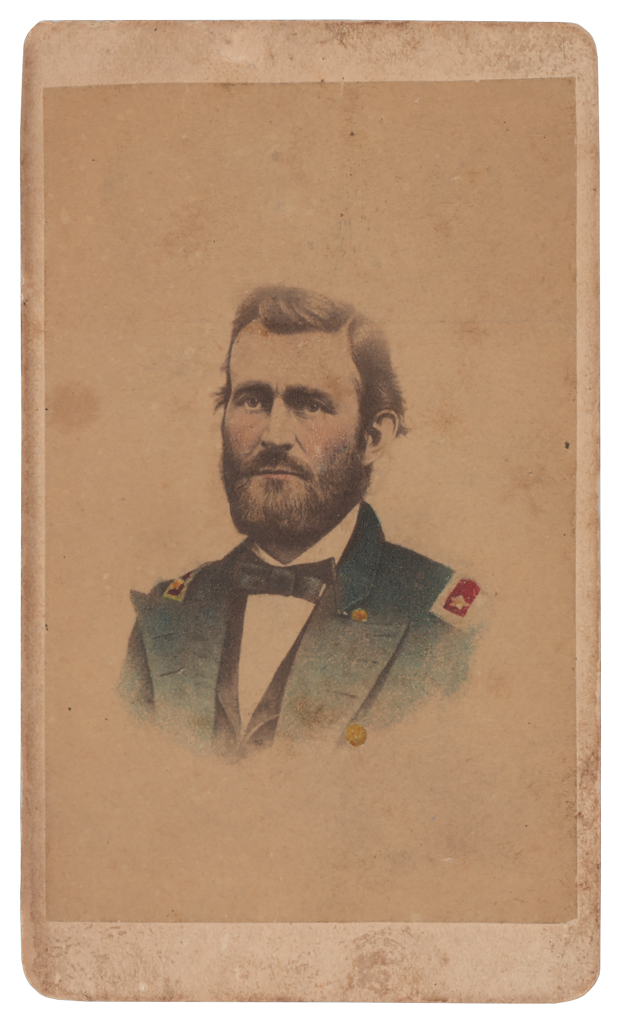 Appealing hand-colored 2.25 x 4 carte-de-visite portrait of U. S. Grant in his Union Army uniform. Reverse bears an ink stamp from the photo seller in New York. In very good to fine condition, with some light staining and soiling.