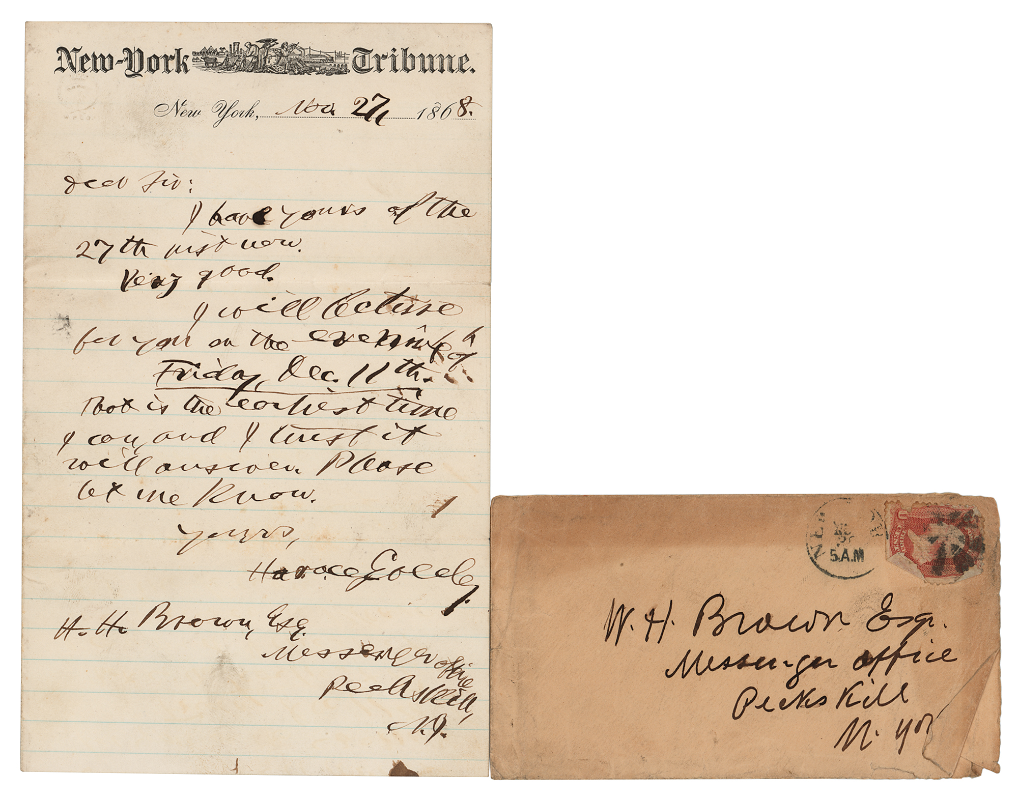 Founder and editor of the New York Tribune (1811-1872) who used the power of his newspaper to advocate for a variety of liberal causes, most importantly the call for emancipation of slaves during the Civil War. ALS, one page, 5 x 8, New-York Tribune letterhead, November 27, 1868. Handwritten letter to H. H. Brown in Peekskill, New York, in part: "I have yours of the 27th inst. now. Very good. I will lecture for you on the evening of Friday, Dec. 11th. That is the earliest time I can and I trust it will answer. Please let me know." In fine condition. Accompanied by the original mailing envelope.