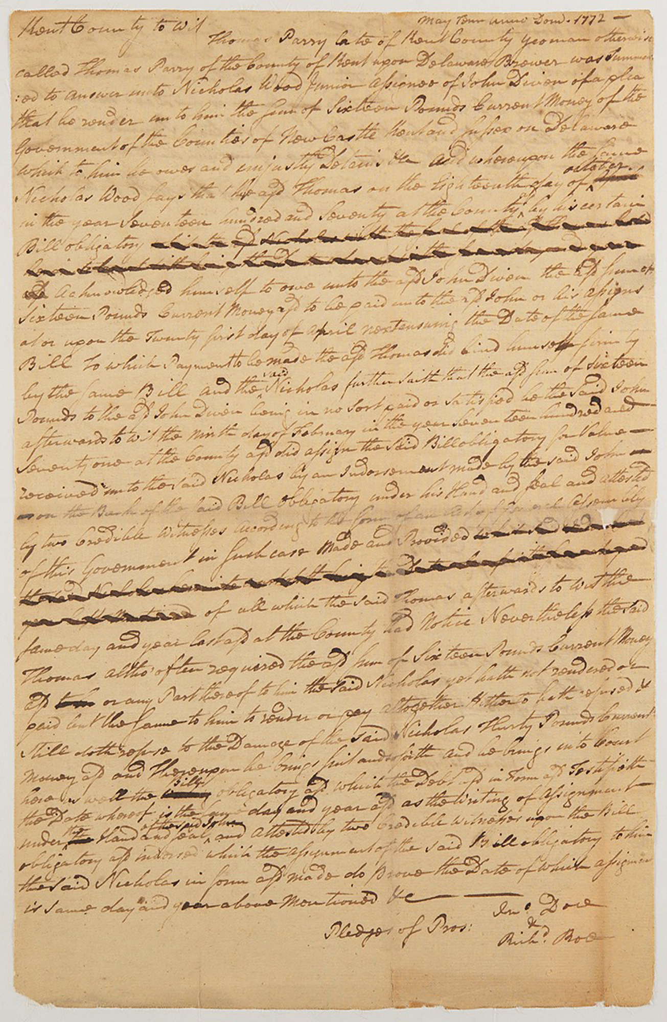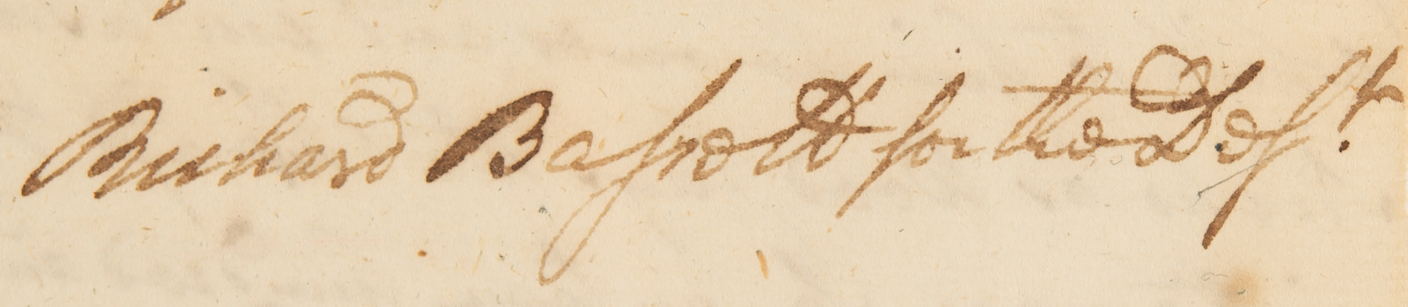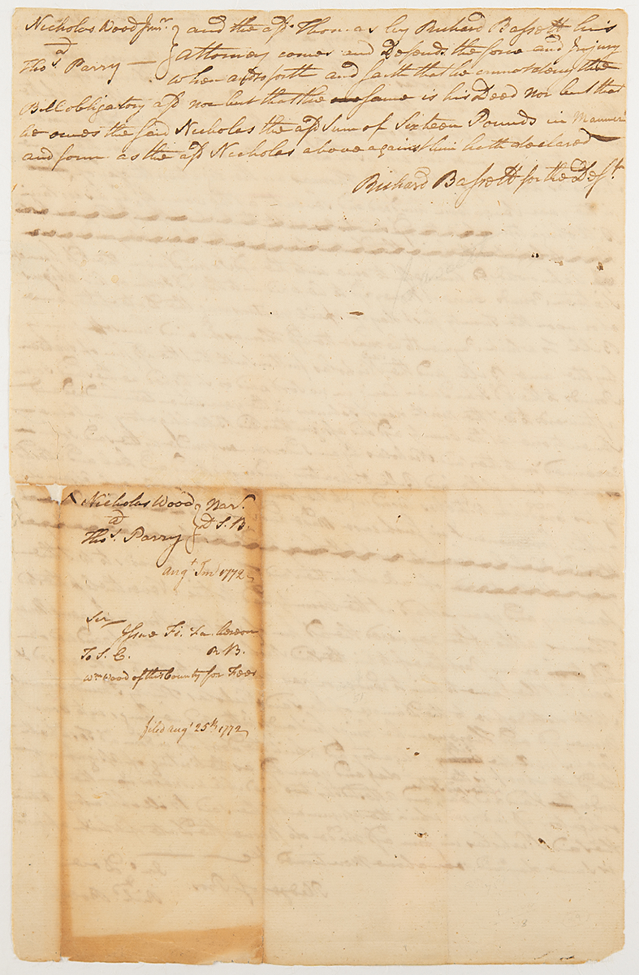 ADS signed twice as “Richd. Bas.” and “Richard Bassett,” one page, both sides, 8.25 x 13, August 1772. Lengthy handwritten legal document concerning a defendant involved in a civil non-payment case, signed in the text and at the end of the document, with an additional autographed note initialed "RB" on the lower half of the second page.