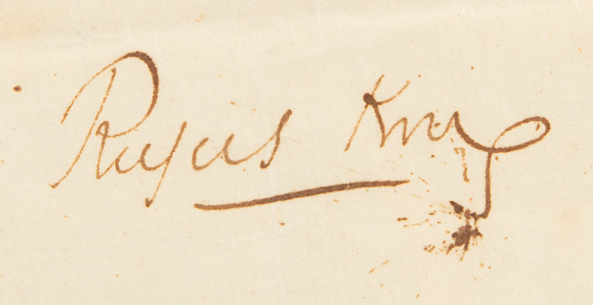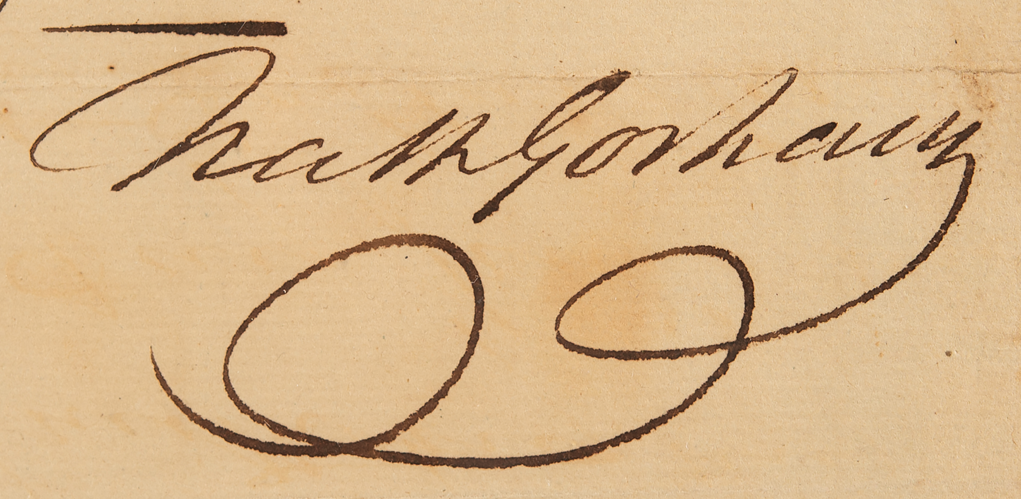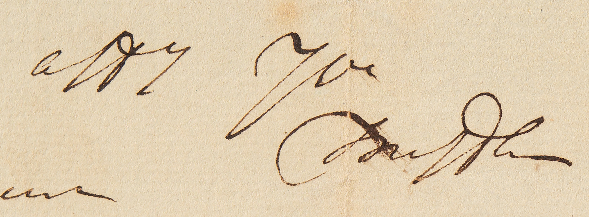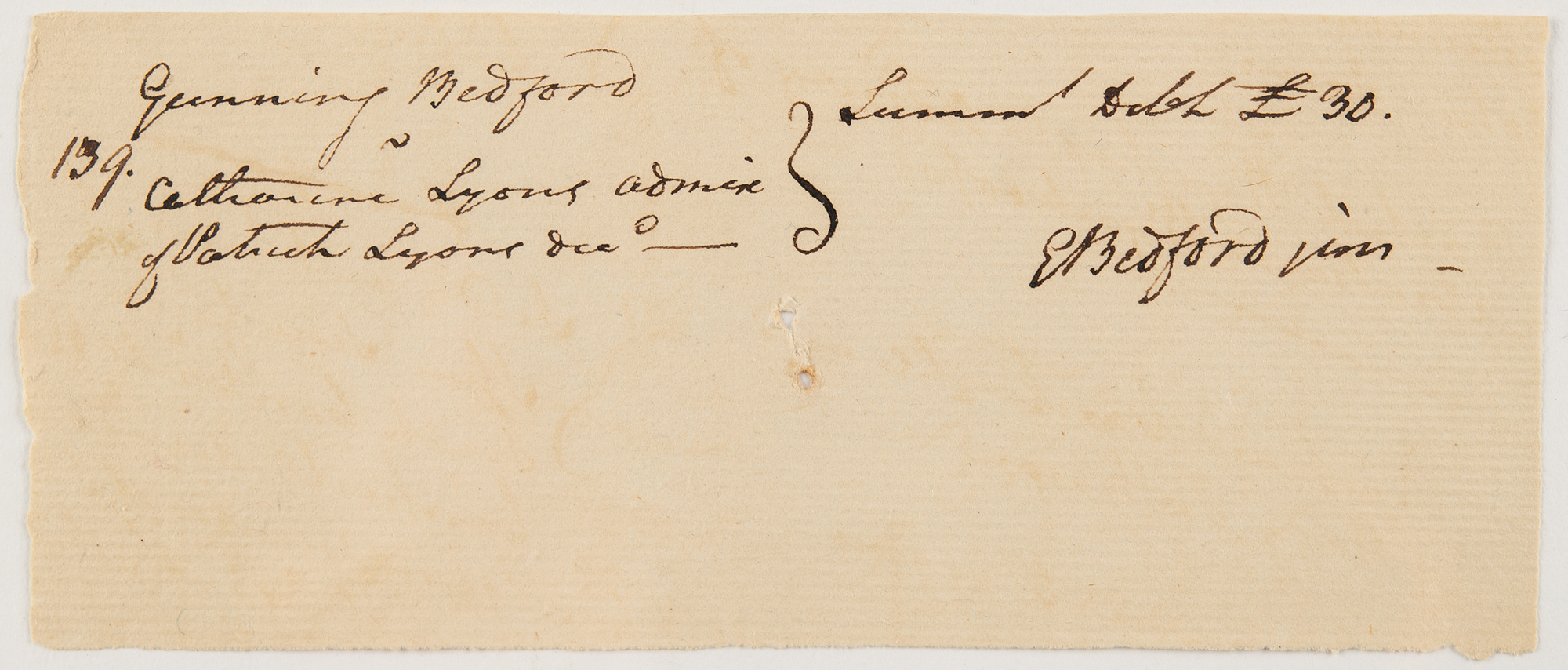 ADS signed twice as “Gunning Bedford” and “G. Bedford jun.,” one page, 5.5 x 2.25, no date. Short handwritten endorsement, clipped from a longer document, concerning fees for settling the estate of Patrick Lyons, signed "Gunning Bedford" at the beginning and "G. Bedford jun." at the end.