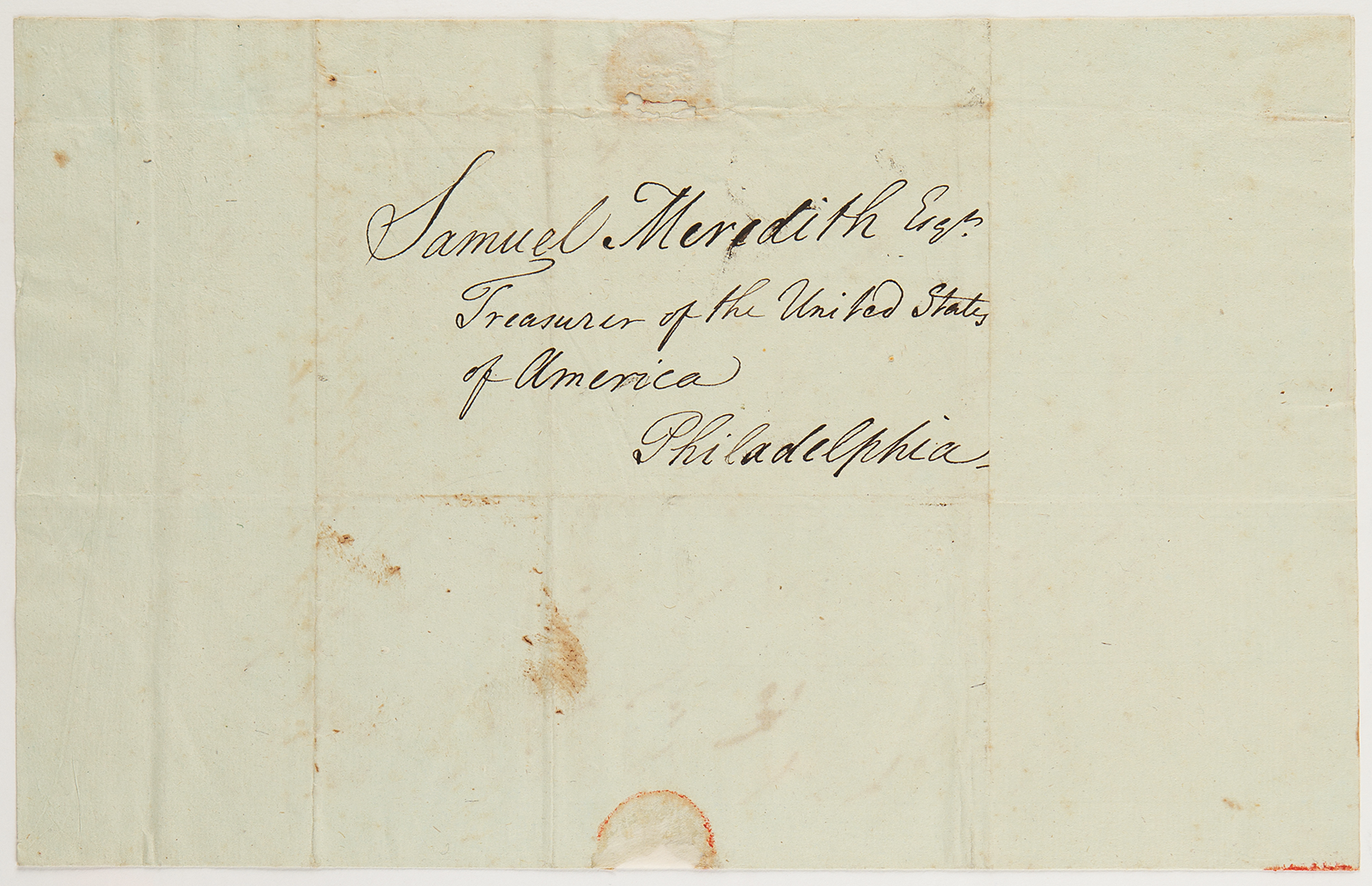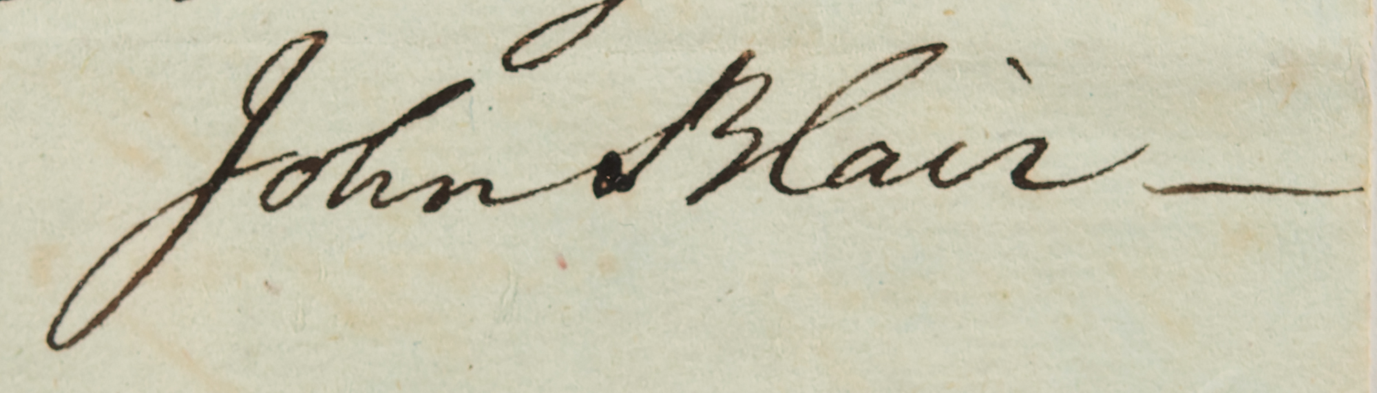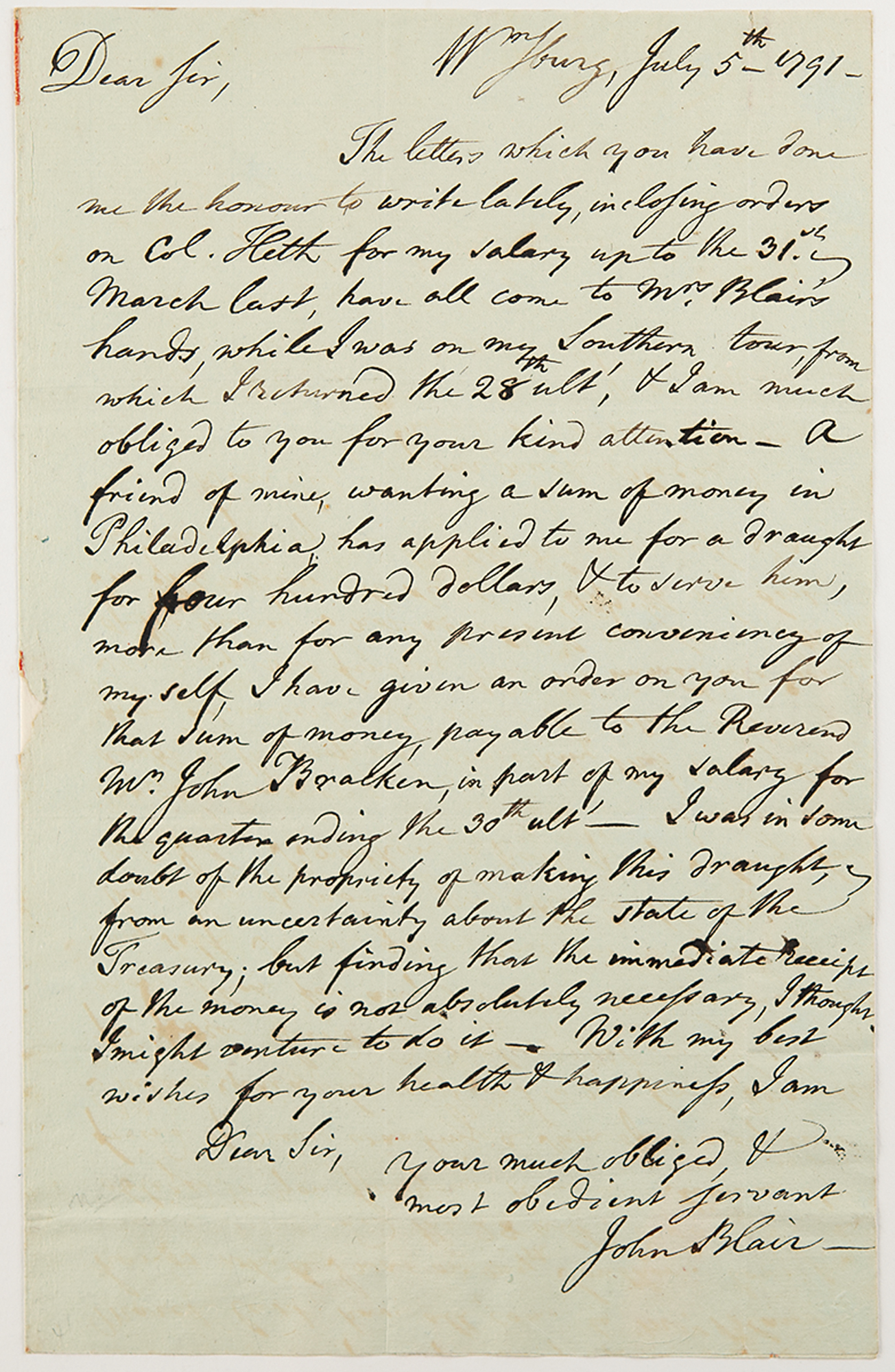 ALS signed “John Blair,” one page, 7 x 11.25, July 5, 1791. Addressed from Williamsburg, Virginia, a handwritten letter concerning the remittance of a portion of Blair's government salary to Rev. John Bracken. The address panel on integral leaf is addressed to “Samuel Meredith Esq., Treasurer of the United States of America, Philadelphia.”
