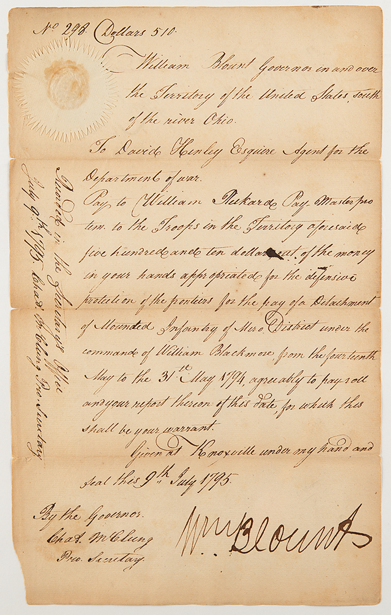 Manuscript document signed as “Wm. Blount,” one page, 8 x 12.75, July 9, 1795. Issued from Knoxville, Tennessee, a secretarial document concerning payment of troops for the defense of frontier territory, signed at the conclusion by Blount. The upper left corner retains the original paper seal. This document was signed by Blount as Governor of the Southwest Territory [later Tennessee], a position he held from mid-1791 to 1796.