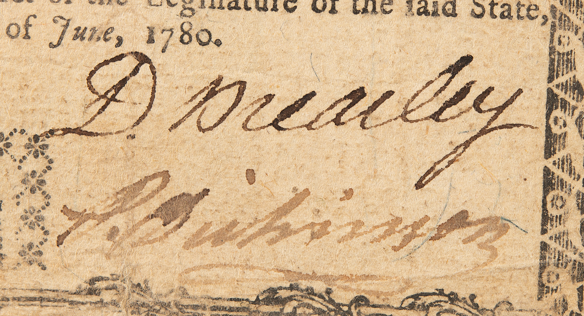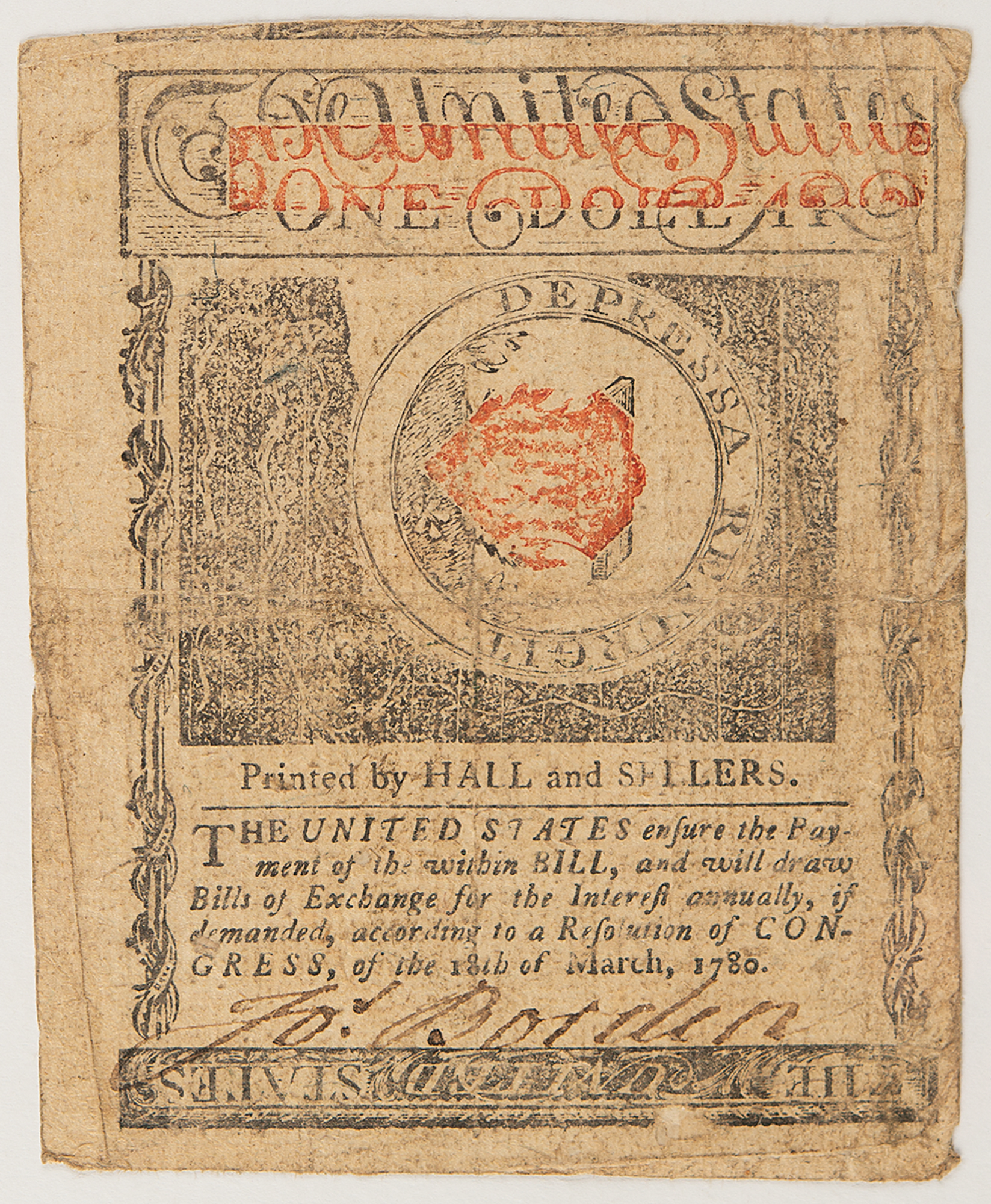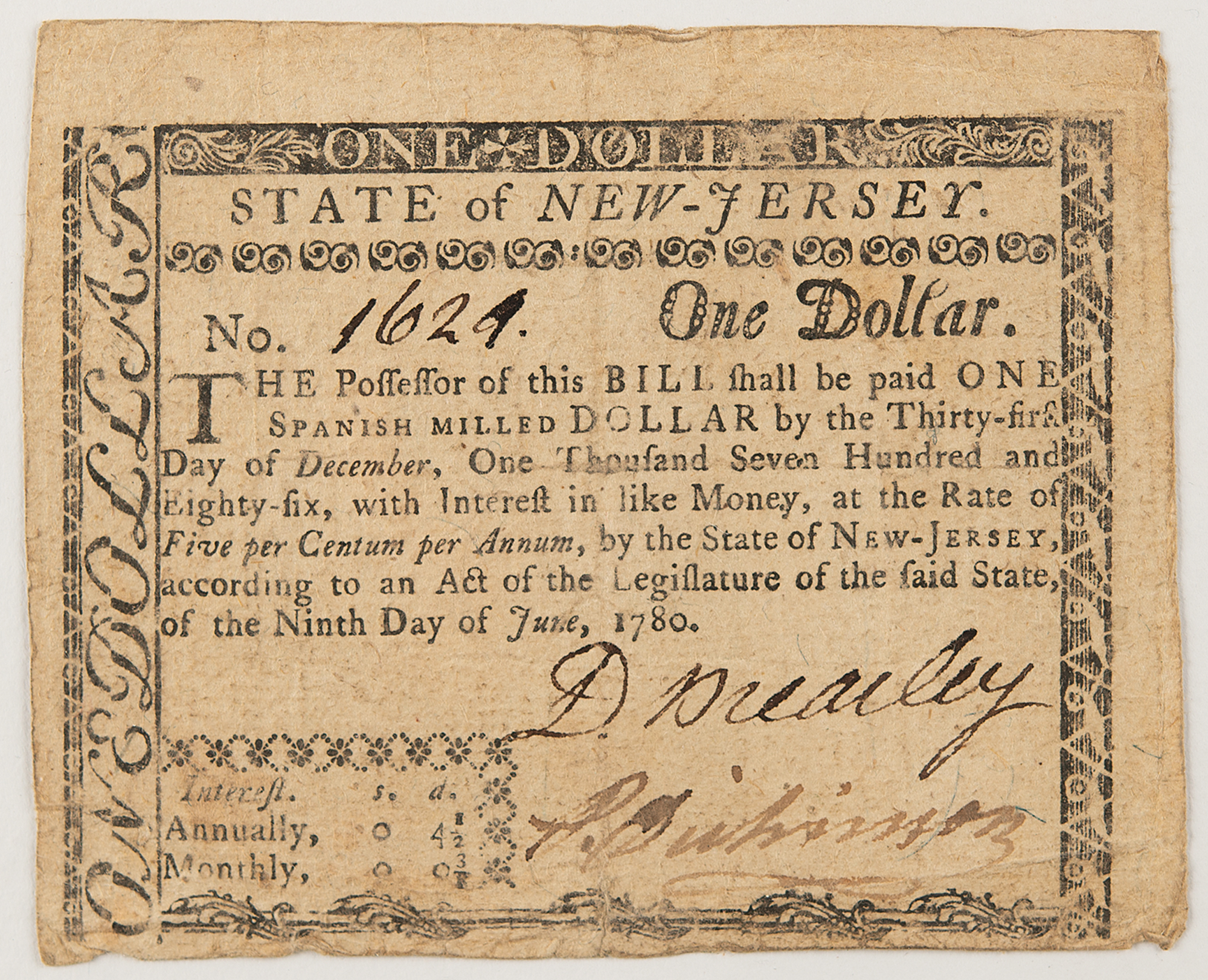 New Jersey engraved bank note for "One Dollar," 3.75 x 3, issued as No. 1629, and reading, in part: "The possessor of this bill shall be paid one Spanish milled dollar by the thirty-first day of December, one thousand seven hundred and eighty-six" Signed at the conclusion by David Brearley and countersigned by Philemon Dickinson (New Jersey, Continental Congress); the reverse signed by Joseph Borden (New Jersey, Stamp Act Congress, Judge). Printed by Hall and Sellers, 1786.
