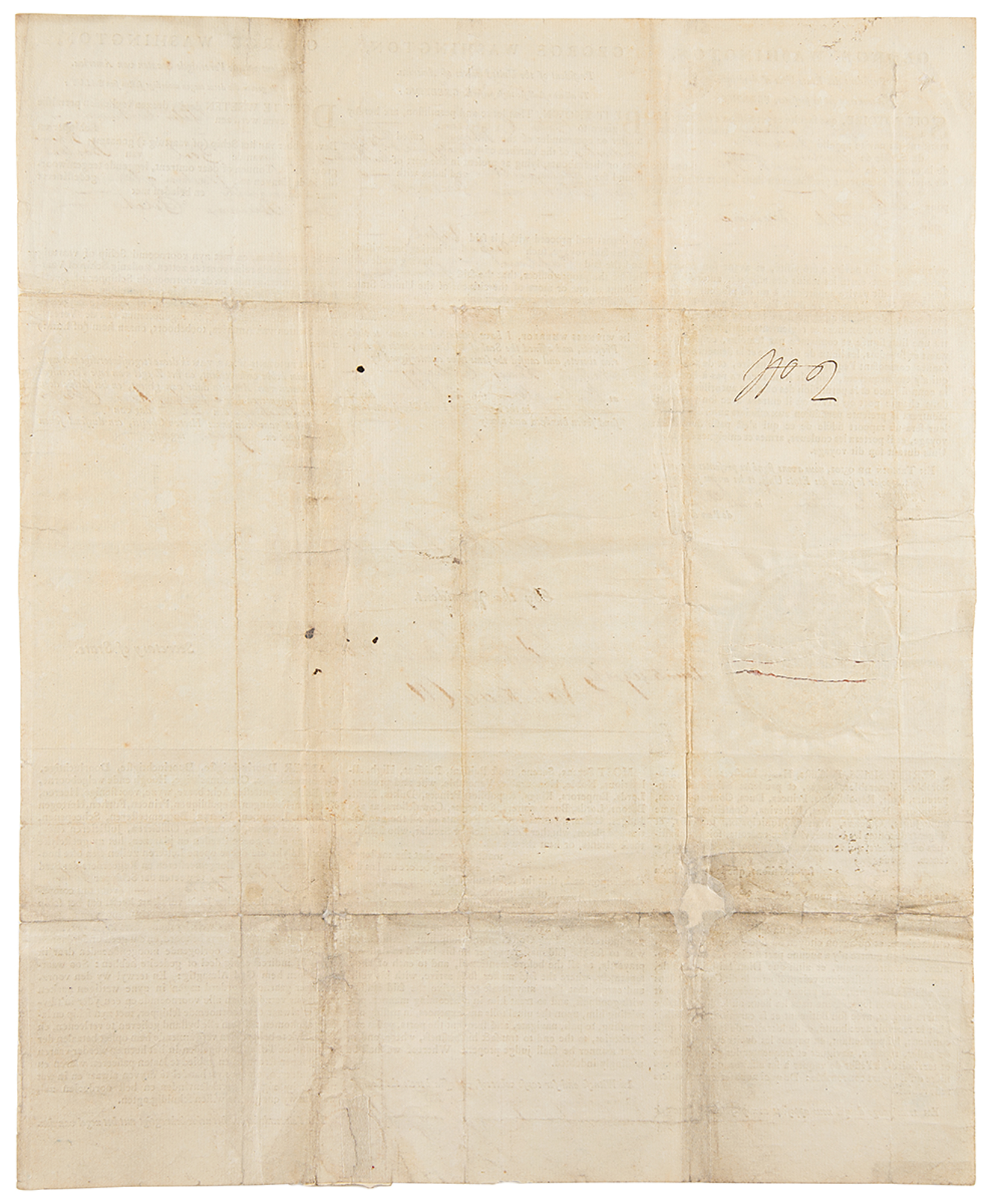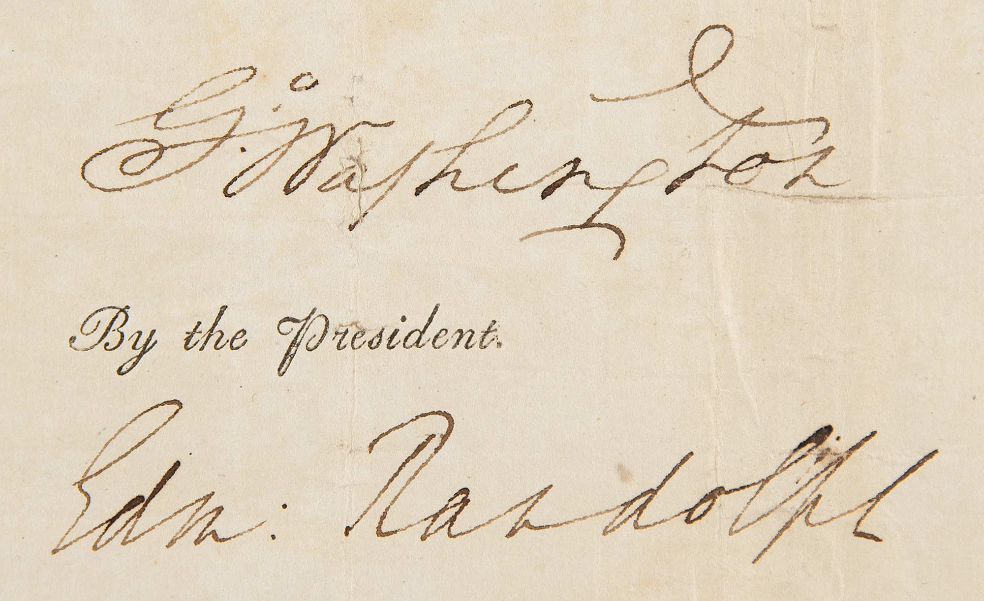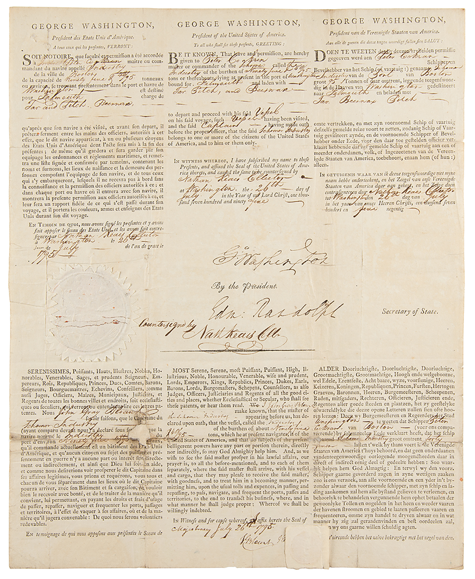 Partly-printed DS as president, “Go: Washington,” one page, 13 x 15.75, July 26, 1795. A three-language ship's passport printed in French, English, and Dutch, which authorizes the passage of "Peter Cockran master or commander of the schooner called the Industry of the burthen of Ninety five & 48/95 tons or thereabouts, lying at present in the port of Washington bound for Falmouth and laden with Tar, Pitch, and Beeswax.” Signed at the conclusion by George Washington and countersigned by Edmund Randolph as Secretary of State, Nathan Keais as Collector for the Port of Washington, North Carolina, and John Gray Blount as Notary. The left side retains the original embossed paper seal.