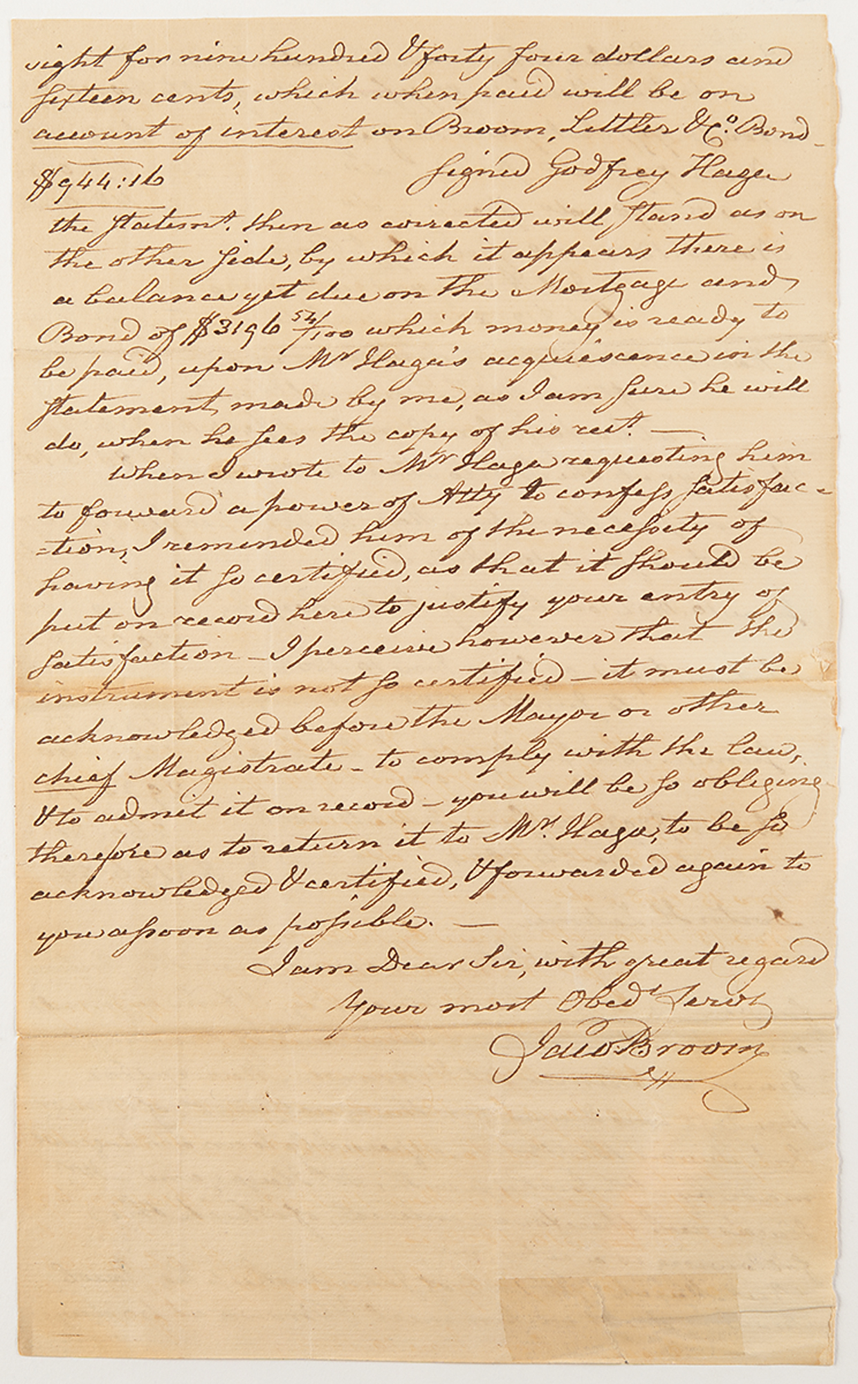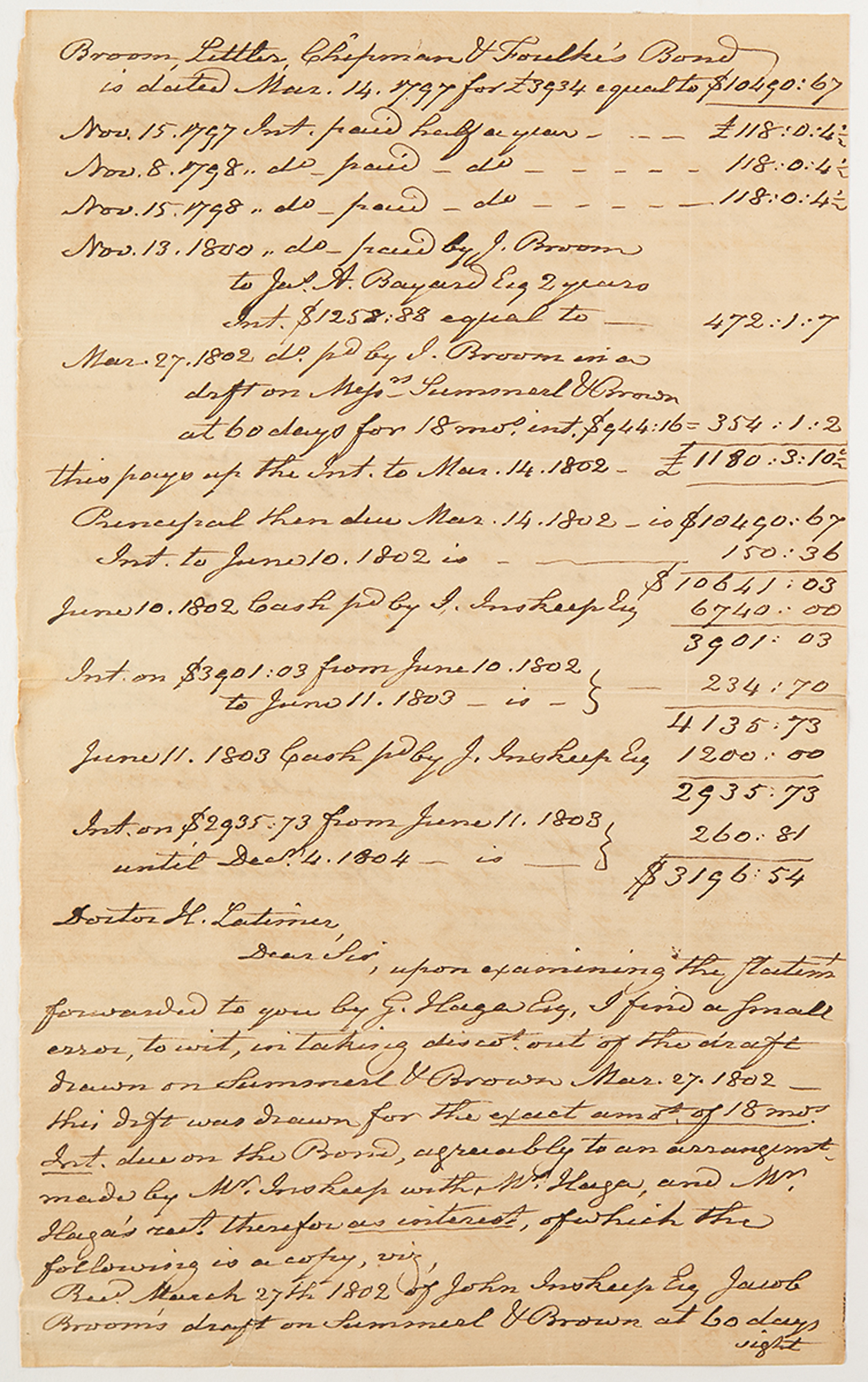 ALS signed “Jacob Broom,” one page both sides, 7.5 x 12.25, [Delaware], no date, [circa Spring 1802]. Handwritten letter to Dr. Latimer, concerning corrections to a previous financial statement and a request for certified power of attorney.