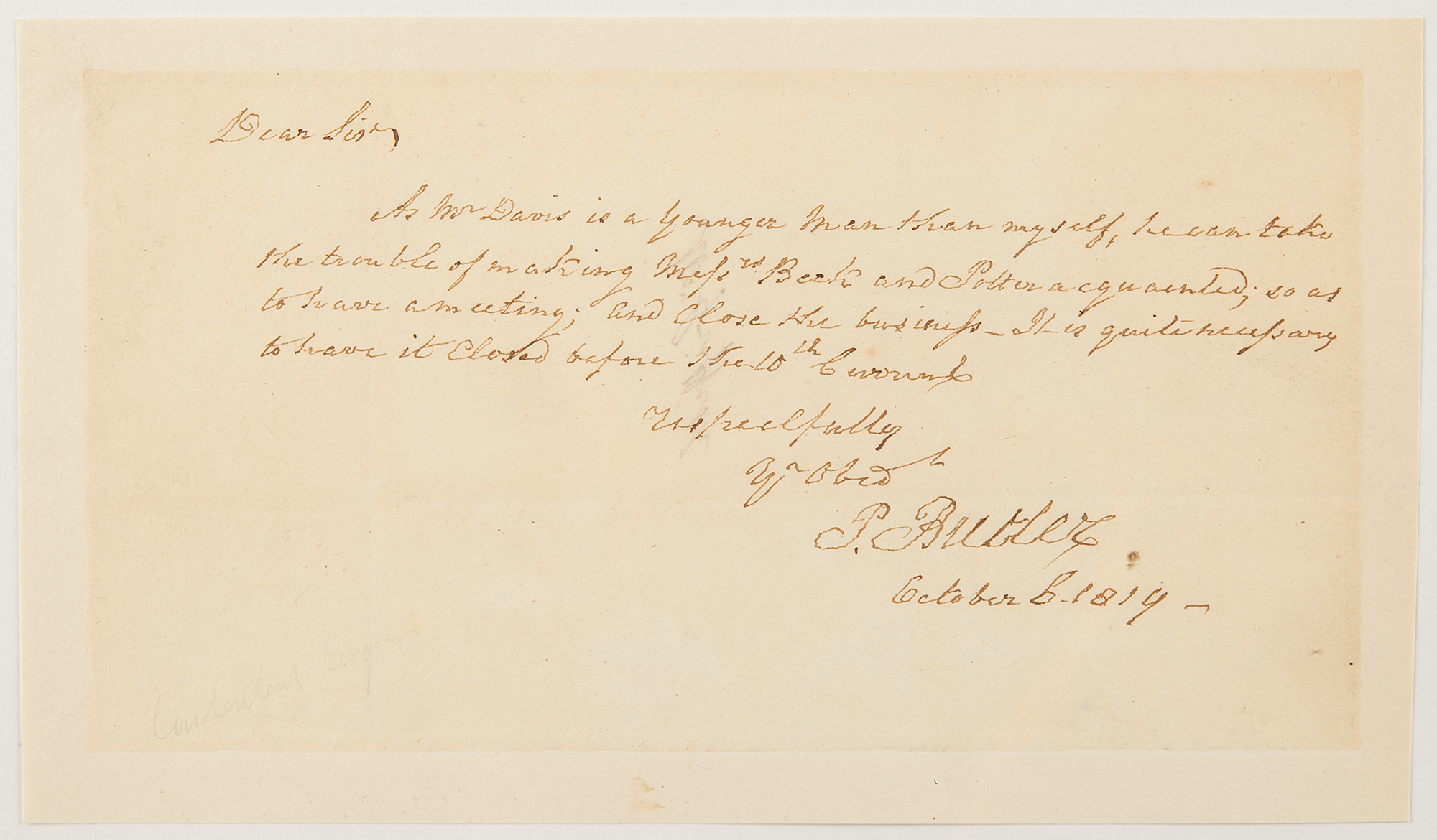 ALS signed “P. Butler,” one page, 7.5 x 4, October 6, 1814. Handwritten letter of introduction for "Mr. Davis.” Butler was later elected as the first senator from South Carolina. With accompanying engraved print of Butler. Professionally inlaid into a slightly larger sheet.
