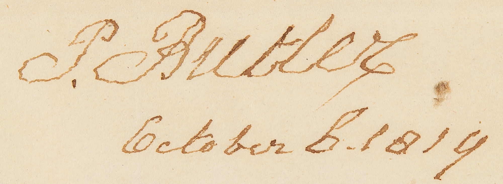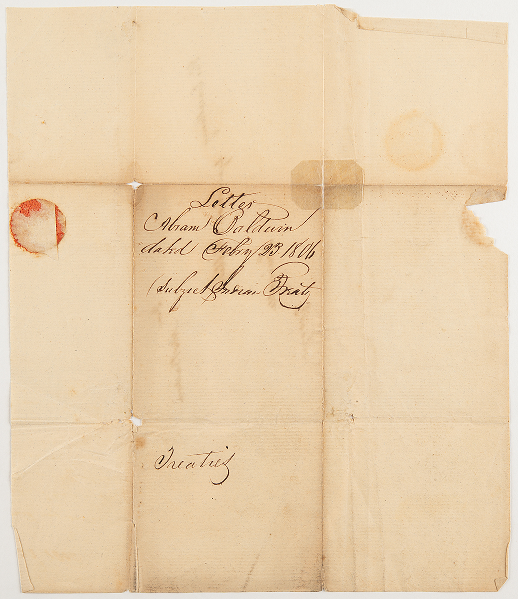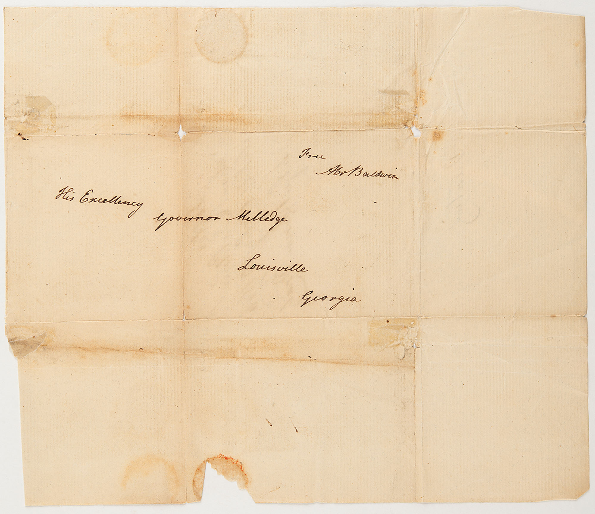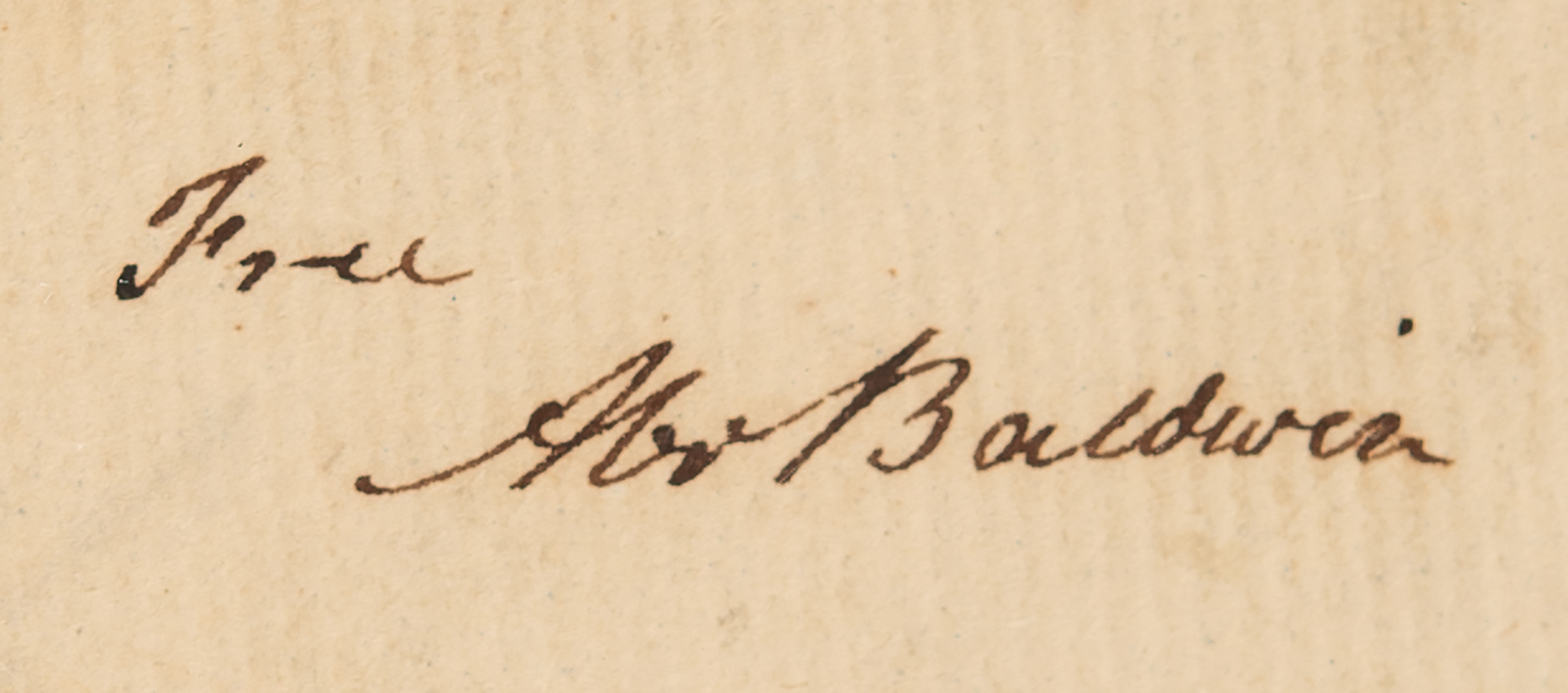 Free franked address leaf signed “Abr. Baldwin,” one page, 9.25 x 7.75, docketed February 23, 1806. An address leaf hand-addressed by Baldwin to “His Excellency, Governor Milledge, Louisville, Georgia,” franked in the upper right, “Free, Abr. Baldwin.” This leaf was free-franked by Baldwin as a U.S. Senator, a position he held from 1799 to 1807. Baldwin's autograph, in any form, is considered one of the rarest of the signers of the Constitution.
