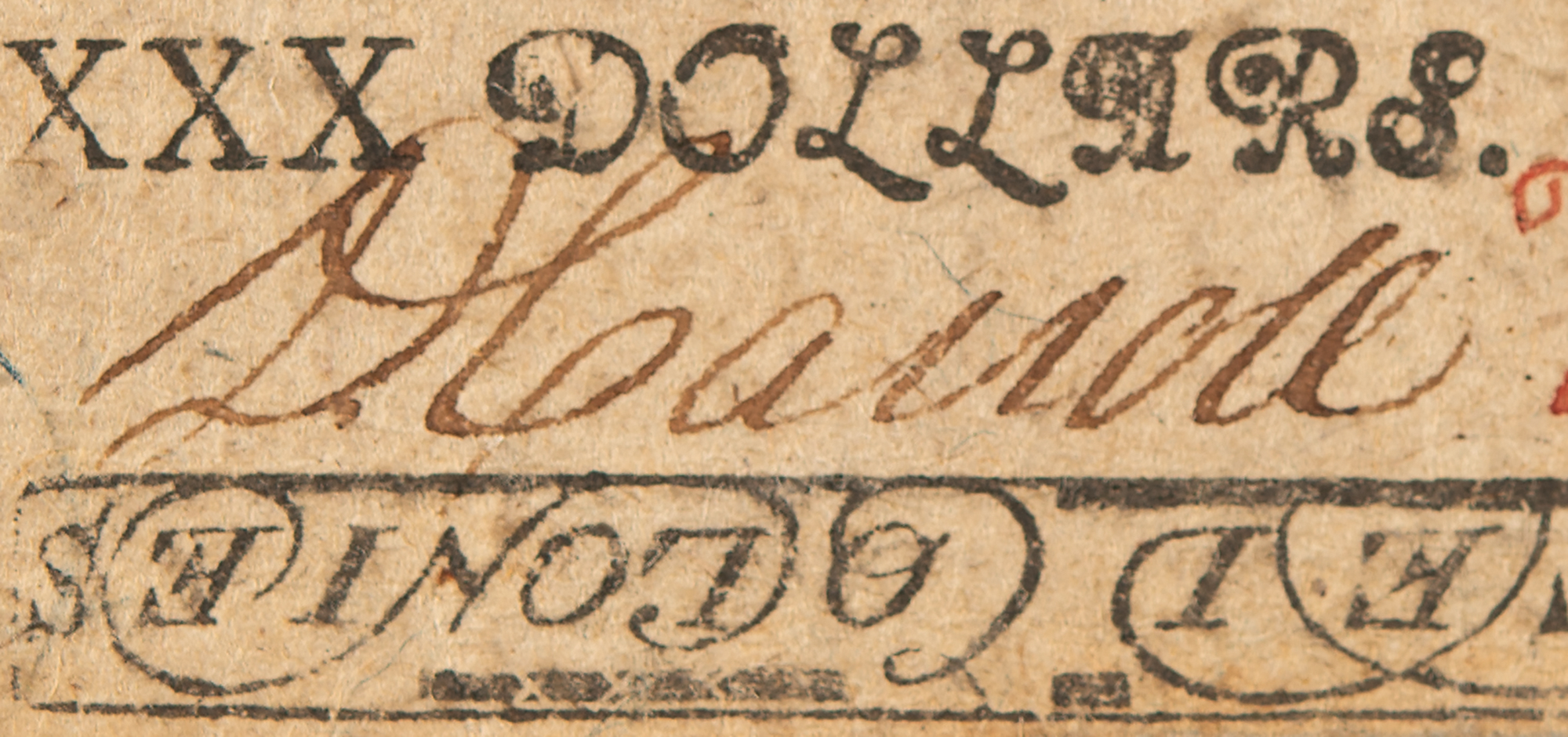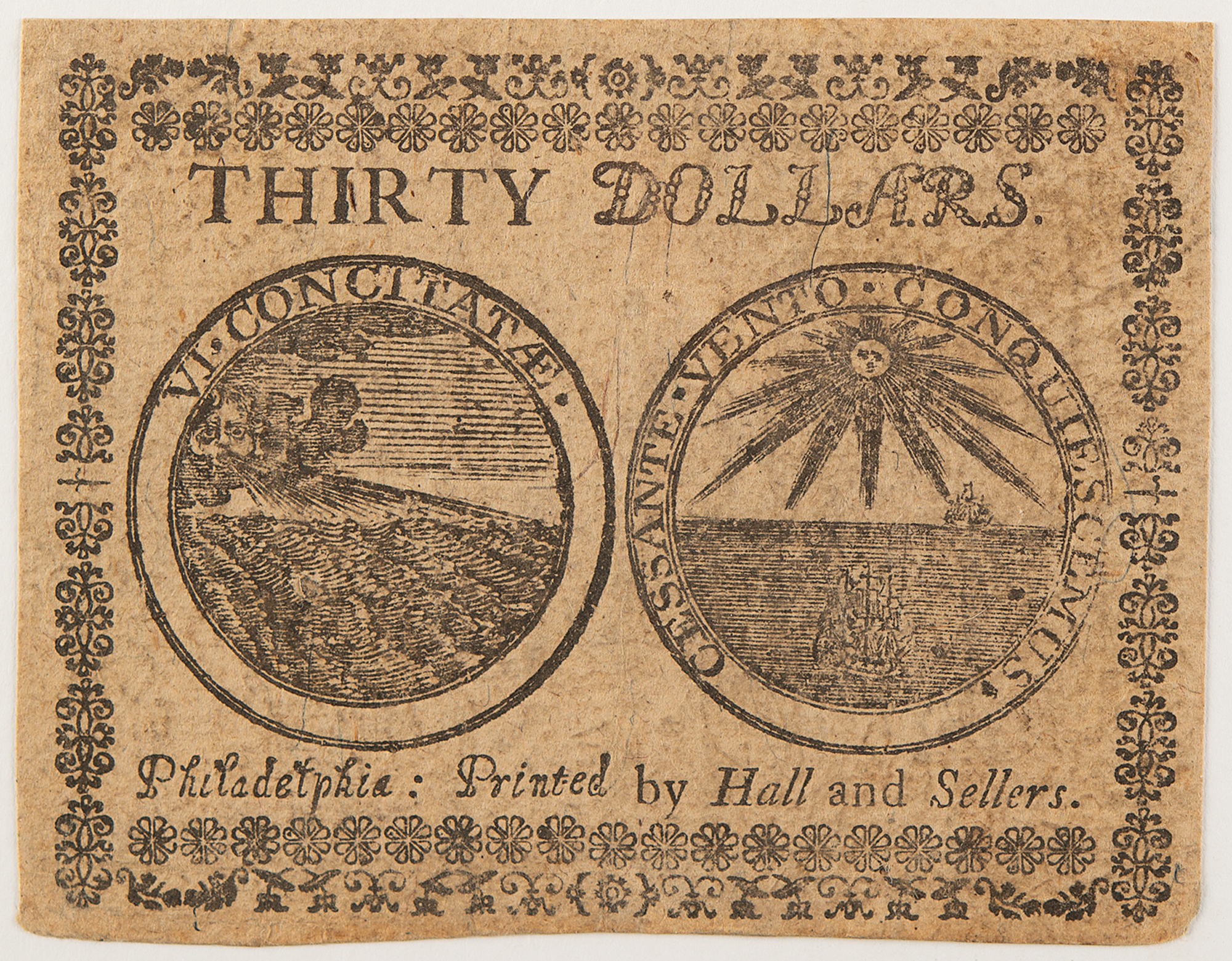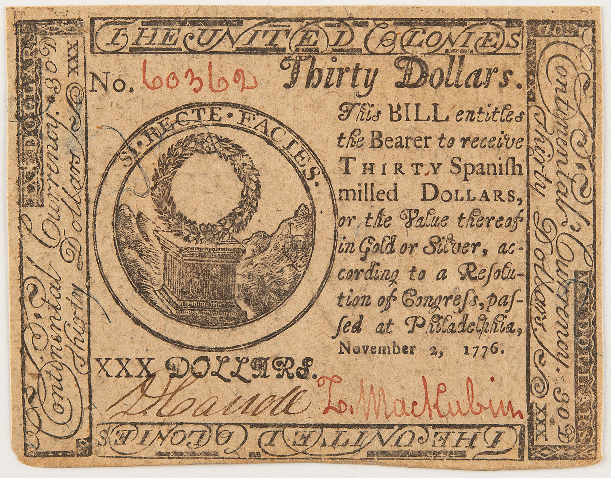 Revolutionary War–dated 'Continental Currency' note for "Thirty Dollars," signed "D. Carroll," 3.75 x 3, issued as No. 60362, reading: “This Bill entitles the Bearer to receive Thirty Spanish Milled Dollars, or the Value thereof in Gold or Silver, according to a Resolution of Congress, passed at Philadelphia, November 2, 1776." Signed at the conclusion by Carroll and Z. Mackubin. Printed by Hall and Sellers.