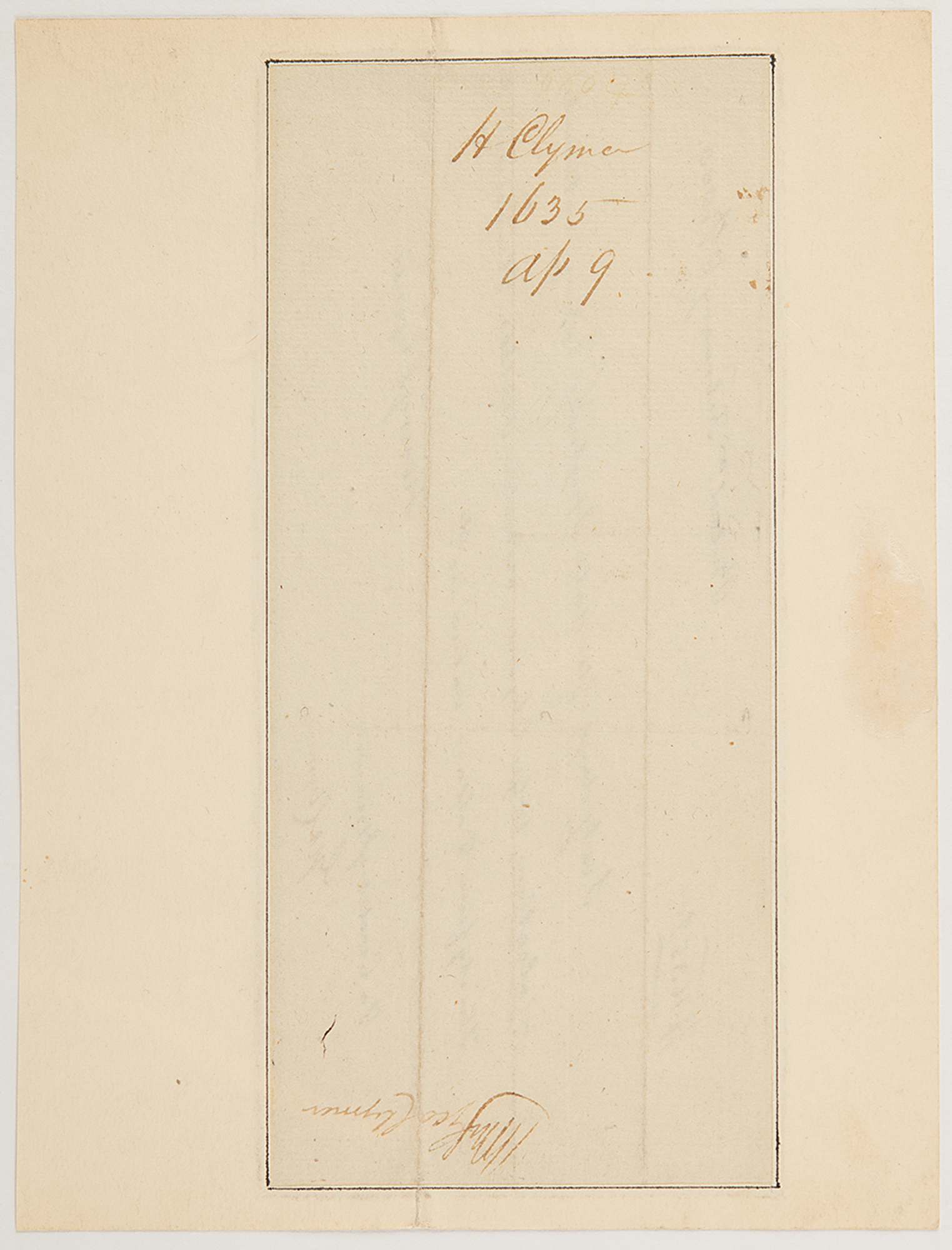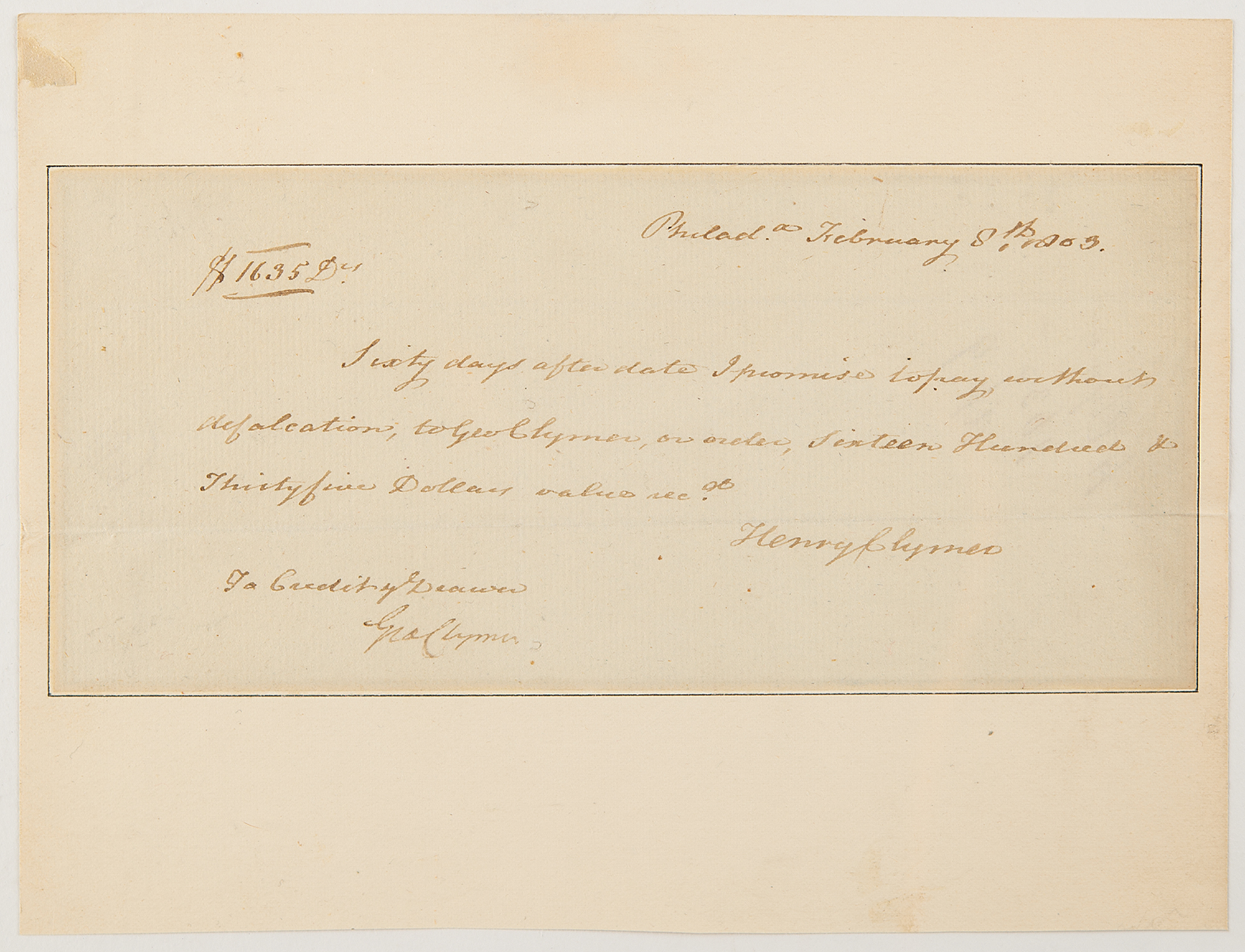 Manuscript document signed “Geo Clymer,” one page, 7.5 x 3.5, February 8, 1805. Brief contractual document in which Henry R. Clymer agrees to pay the sum of $1635 to George Clymer, signed at the conclusion by both men. Professionally inlaid into a slightly larger sheet. Prior to his participation in the Constitutional Convention, George Clymer chaired the ‘Philadelphia Tea Party,’ forcing the resignation of British-appointed tea consignees in the city, and went on to serve as one of the first two Continental treasurers.