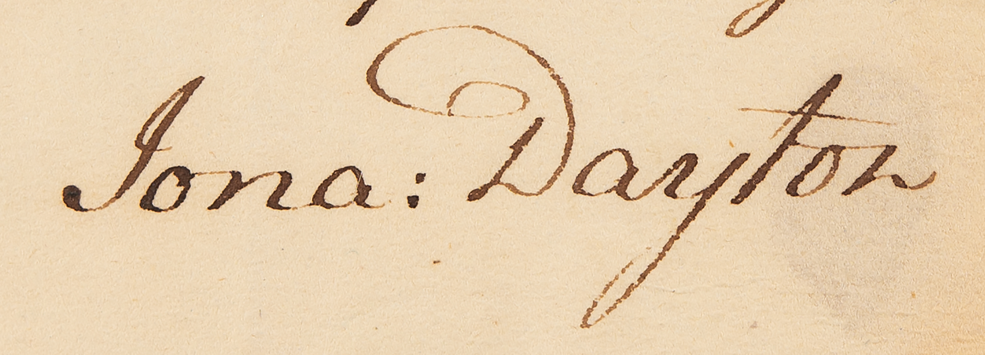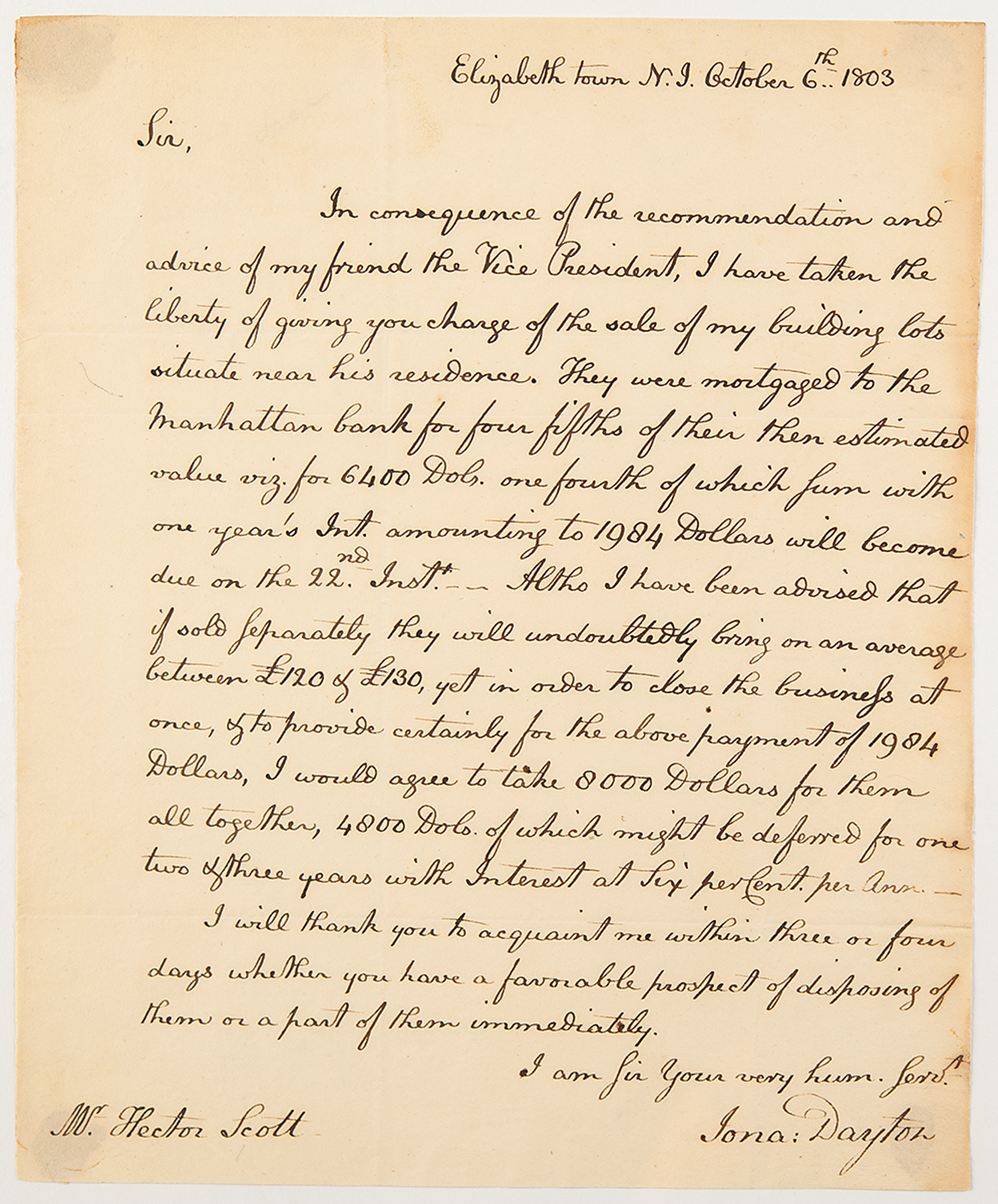 ALS signed “Jona: Dayton,” one page, 8 x 9.5, October 6, 1803. Addressed from Elizabeth Town, New Jersey, a handwritten letter requesting the assistance of Hector Scott in the sale of real estate holdings, on the advice of "my friend the Vice President [Aaron Burr].” Dayton was notably the youngest signer of the Constitution, just 26 years old at the time; he was later implicated in Aaron Burr's conspiracy to conquer lands in the Southwest but was never prosecuted.
