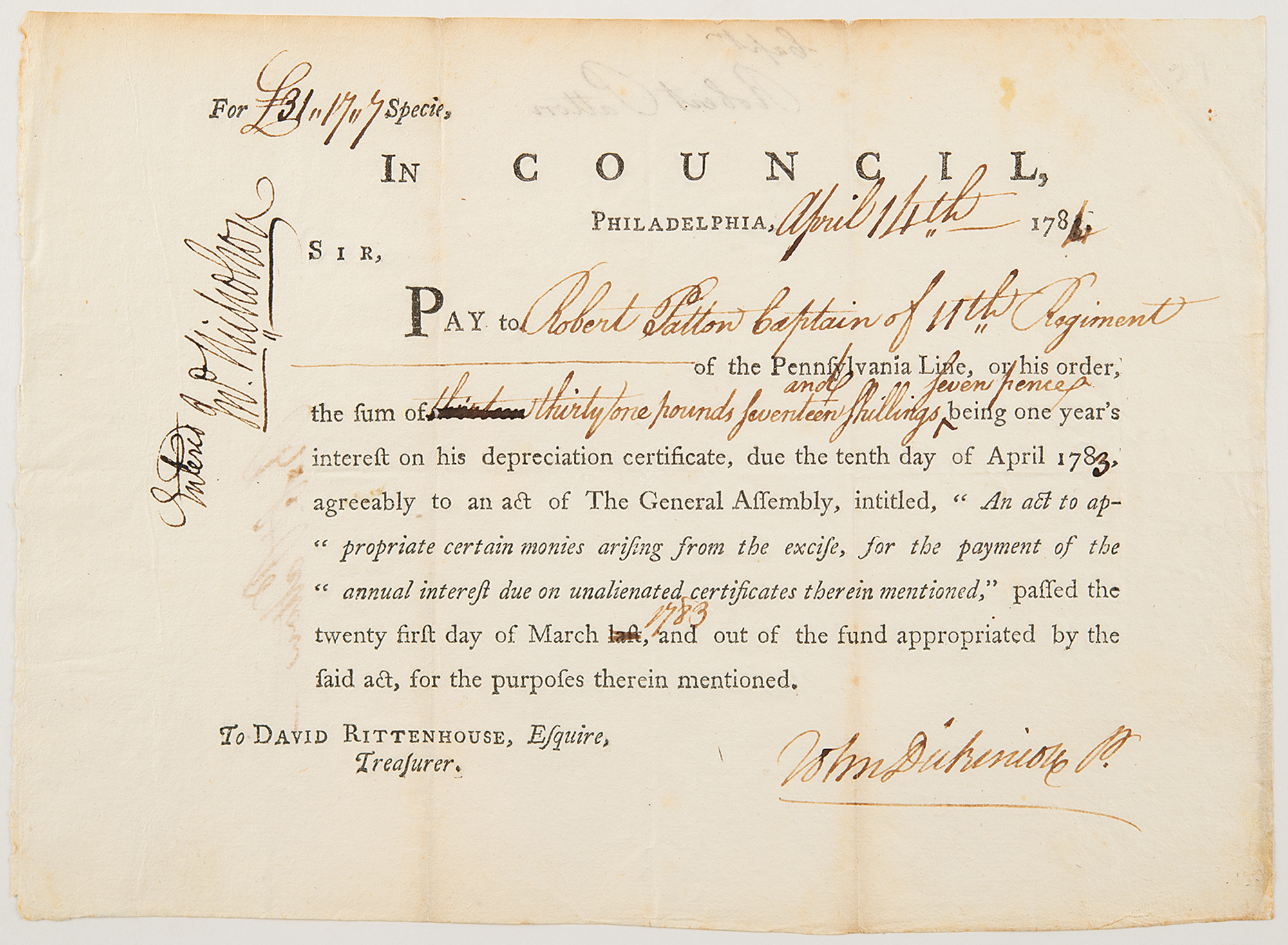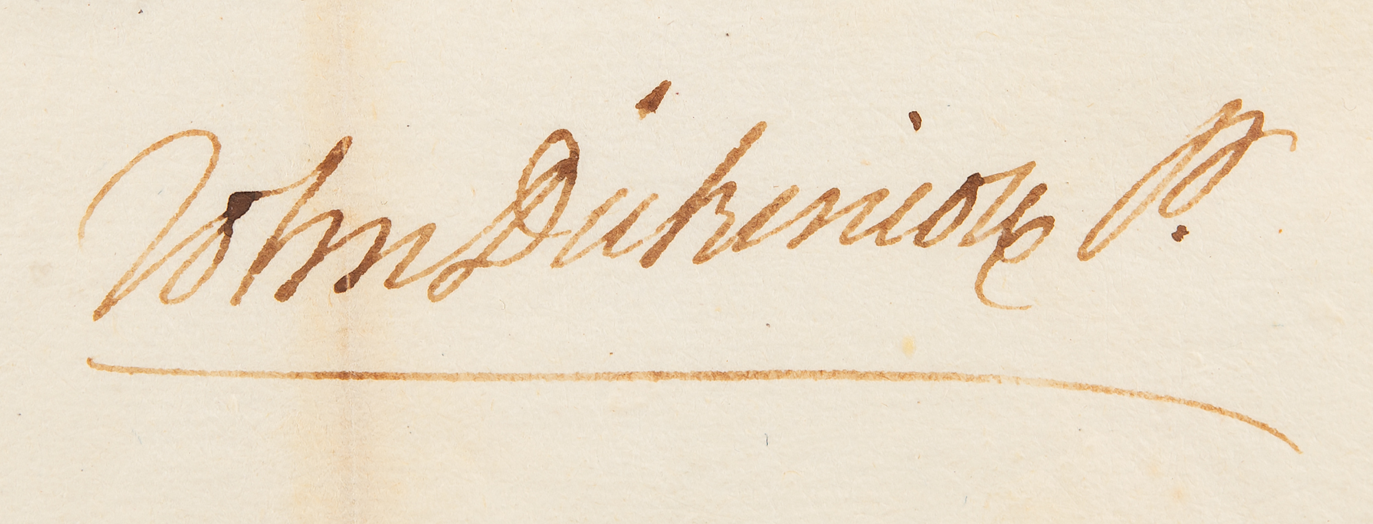 Partly-printed DS signed “John Dickinson P.,” one page, 8.25 x 6, April 14, 1784. Issued from Philadelphia, an interest certificate signed by Dickinson during his time as President of Pennsylvania, paid to the order of "Robert Patton Captain of the 11th Regiment." Countersigned by John Nicholson, as Comptroller of Pennsylvania. In addition to serving as the President of both Pennsylvania and Delaware (for a short while, simultaneously), Dickinson is known as the ‘Penman of the Revolution,’ responsible for the first draft of the Articles of Confederation among a number of other significant Revolutionary documents.