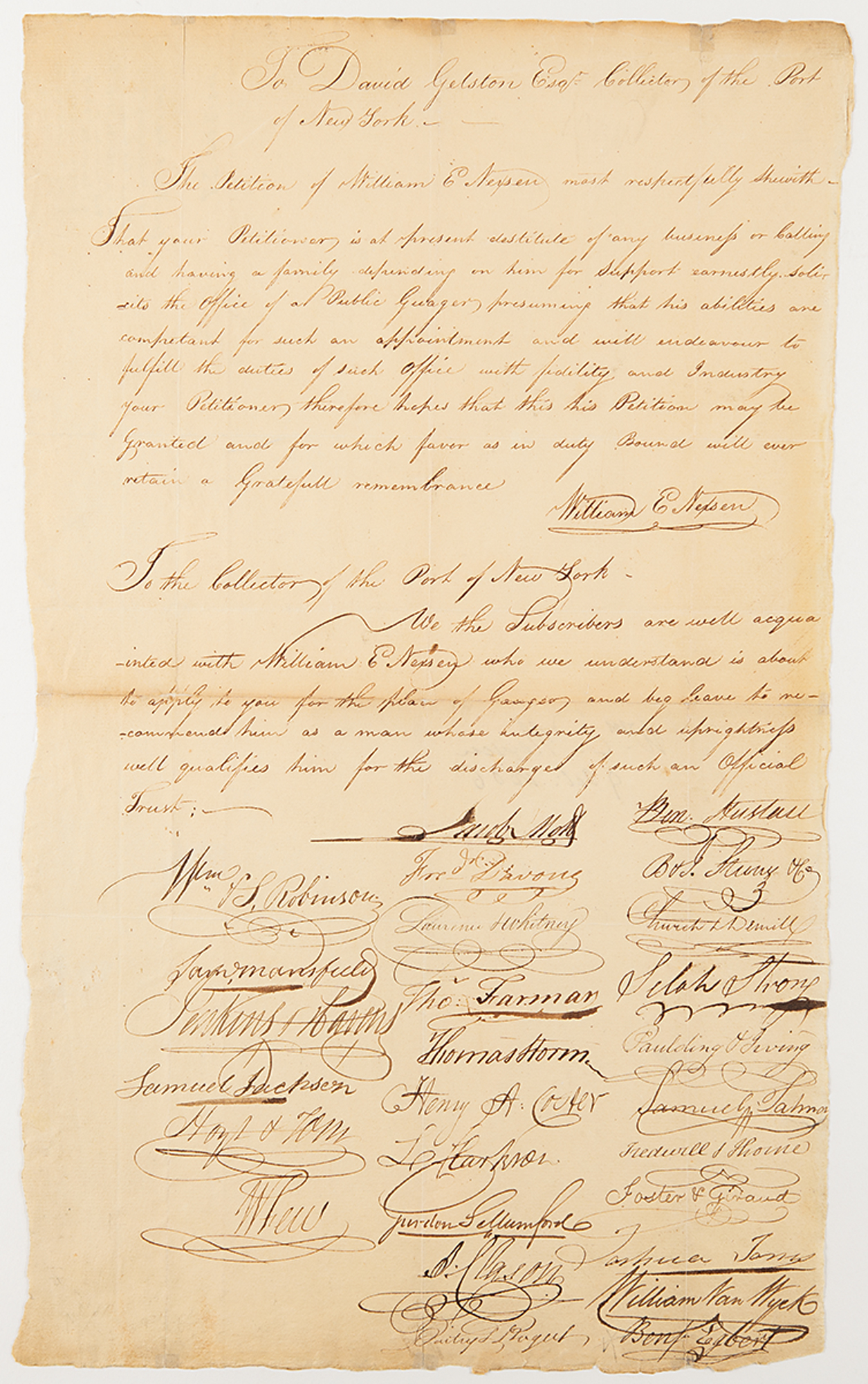 Manuscript DS signed “W Few,” one page, 9.75 x 16.5, docketed October 9, 1806. Petition to David Geltson, Collector of the Port of New York, from William E. Nexsen, seeking employment as a Public Gauger; the document has been signed by twenty-seven "subscribers,” which includes William Few, who signs in the lower left corner, attesting to Nexsen as "a man whose integrity and uprightness well qualifies him for the discharge of such an Official Trust."