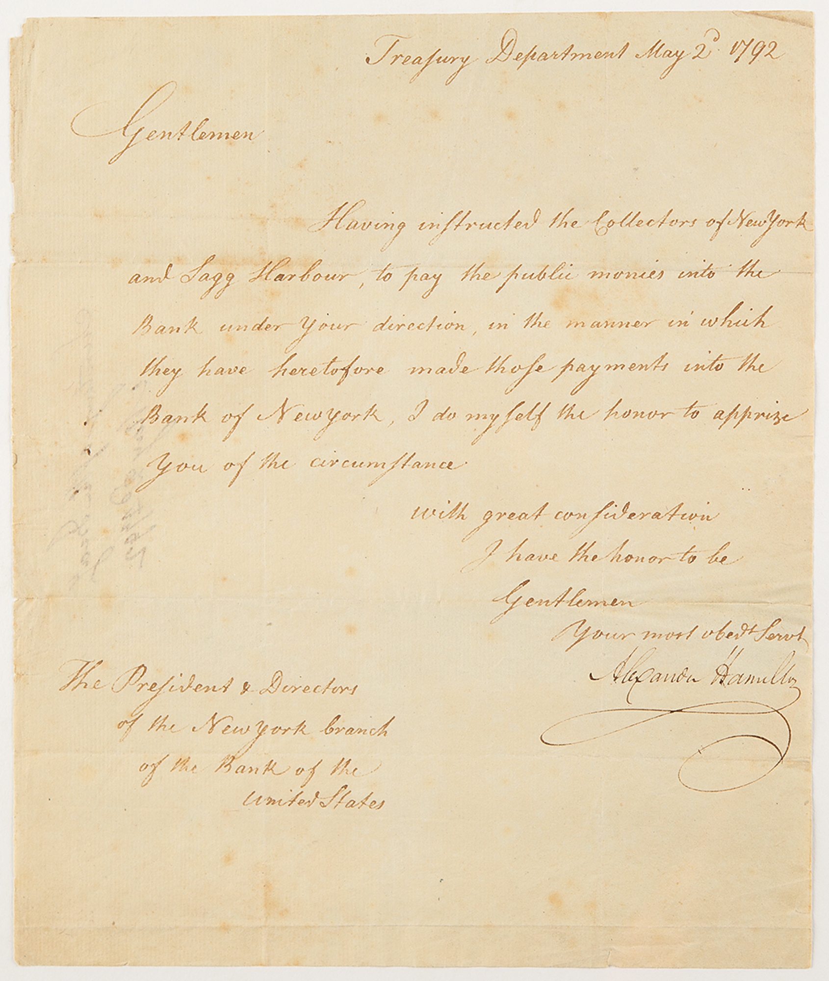LS as the first Secretary of the Treasury, signed "Alexander Hamilton,” one page, 7.5 x 9, May 2, 1792. Addressed from the Treasury Department, a manuscript letter to the President and Directors of the New York brand of the Bank of the United States, regarding pending payments.