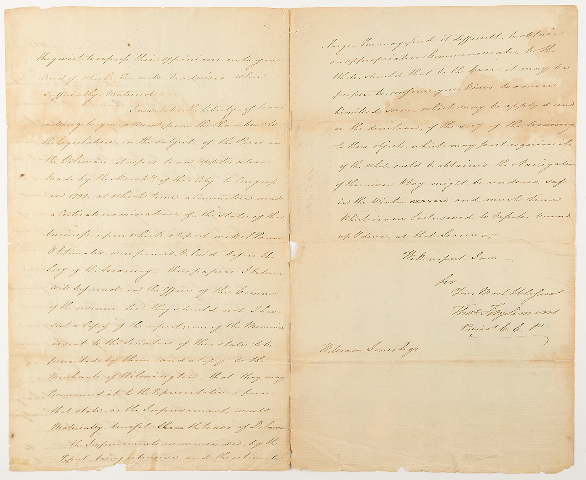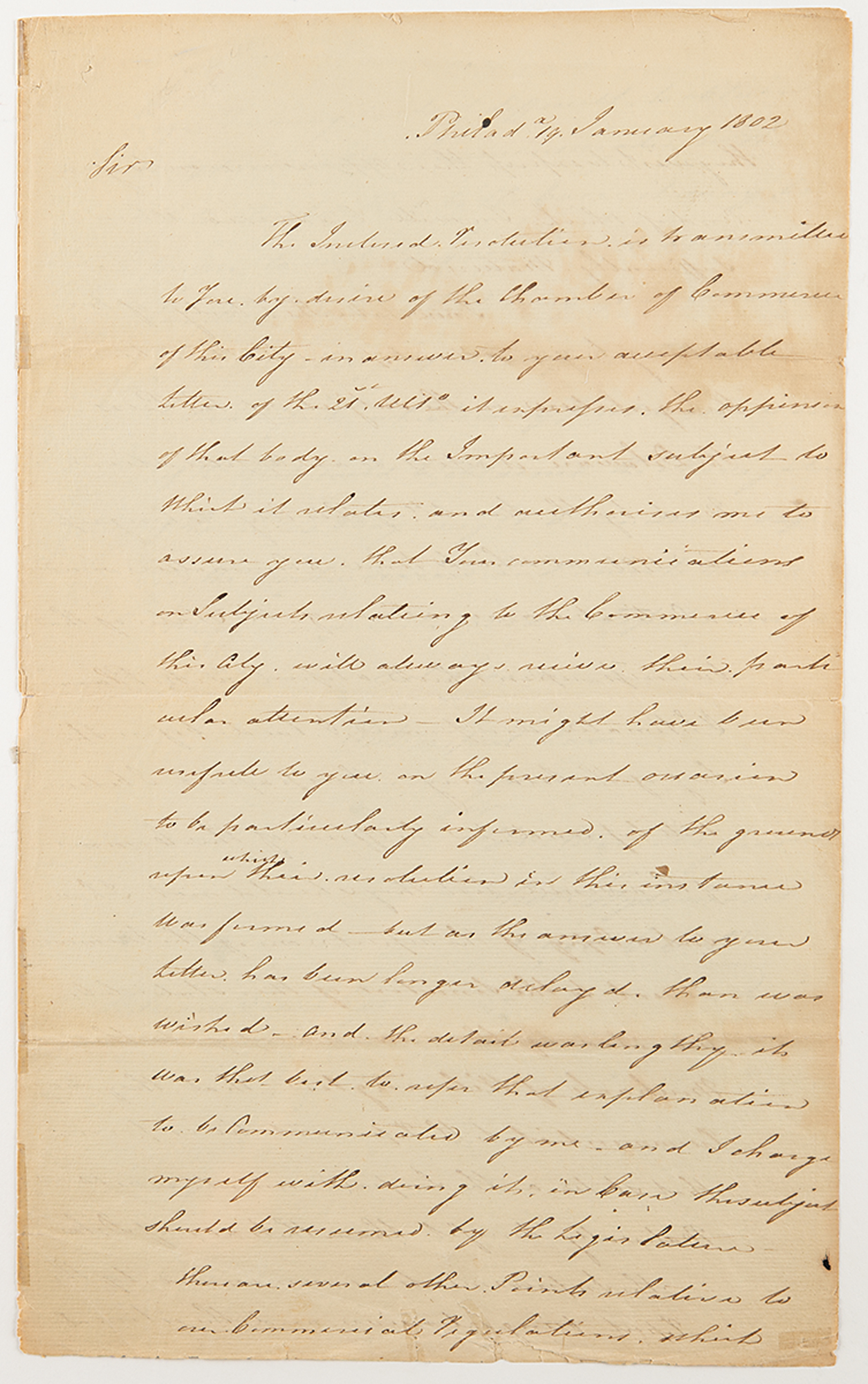 ALS signed “Thos. FitzSimons, Presidt. C. C. P.,” three pages, 7.75 x 12.75, January 19, 1802. Addressed from Philadelphia, a handwritten letter to "William Jones Esq.,” presumably of the merchants Jones & Clark (Philadelphia and Charleston), concerning financial affairs during his time as President of the Philadelphia Chamber of Commerce.