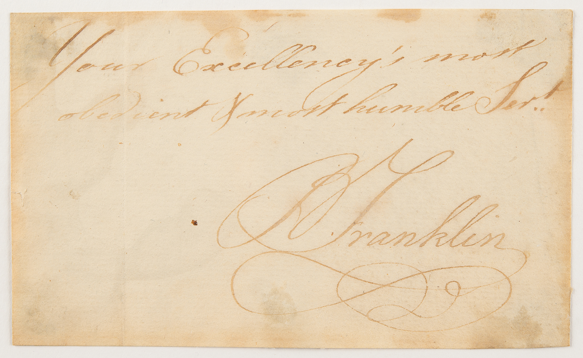 Ink signature, “Your Excellency's most obedient & humble sert., B. Franklin,” on an off-white 5 x 3 sheet clipped from a larger document.