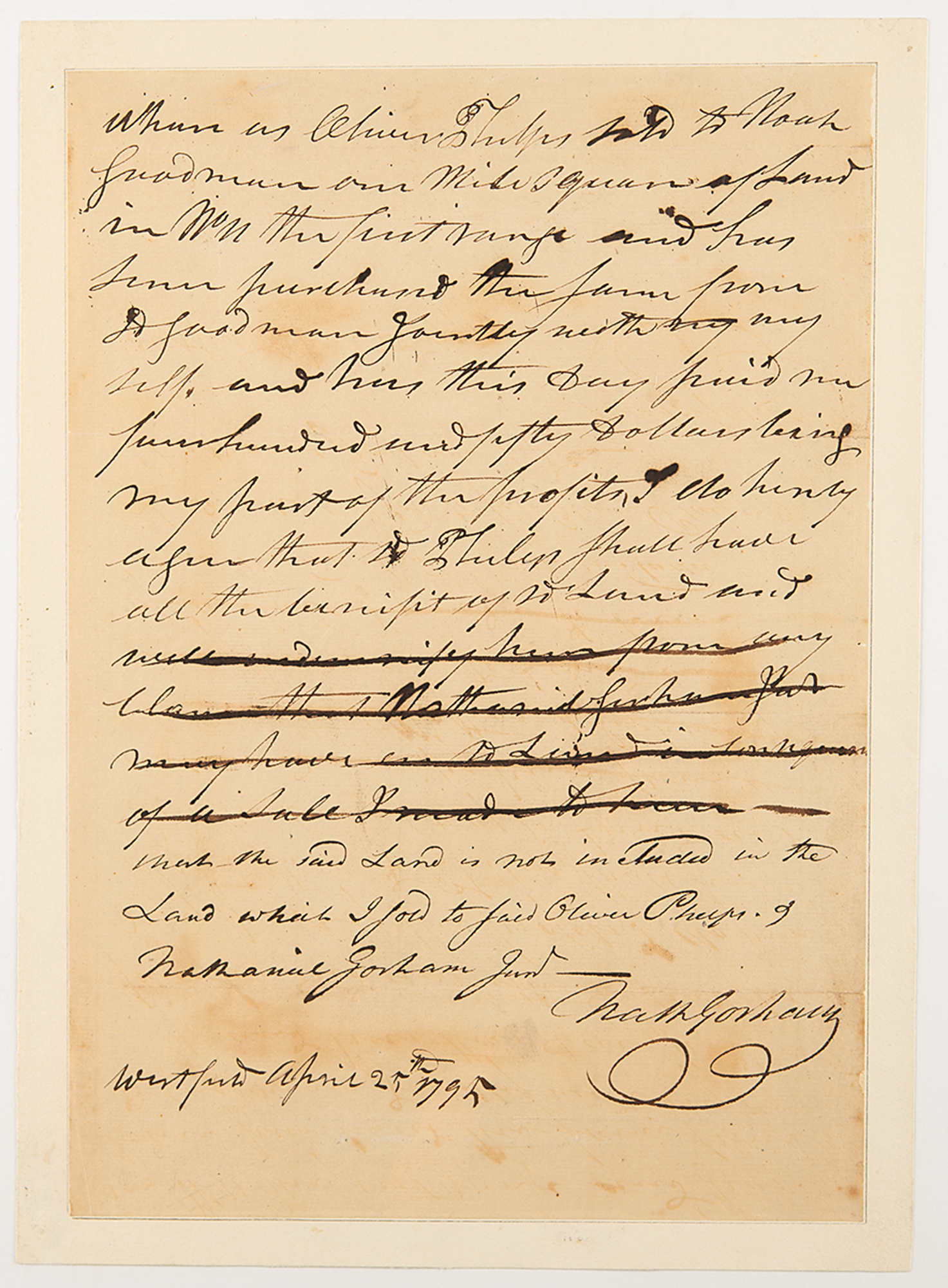ADS signed “Nath Gorham,” one page, 8 x 11.5, Westfield [Massachusetts], April 25, 1795. A manuscript document outlining legal details of real estate holdings between Nathanial Gorham, Oliver Phelps, Noah Goodman, and Nathaniel Gorham, Jr. This document is related to a larger real estate plan between Phelps and Gorham, Sr. to contract unimproved land in Western New York at a devalued price; the venture ultimately failed due to the subsequent rocketing value of Massachusetts scrip, leaving Gorham, Sr. insolvent and in poor reputation.