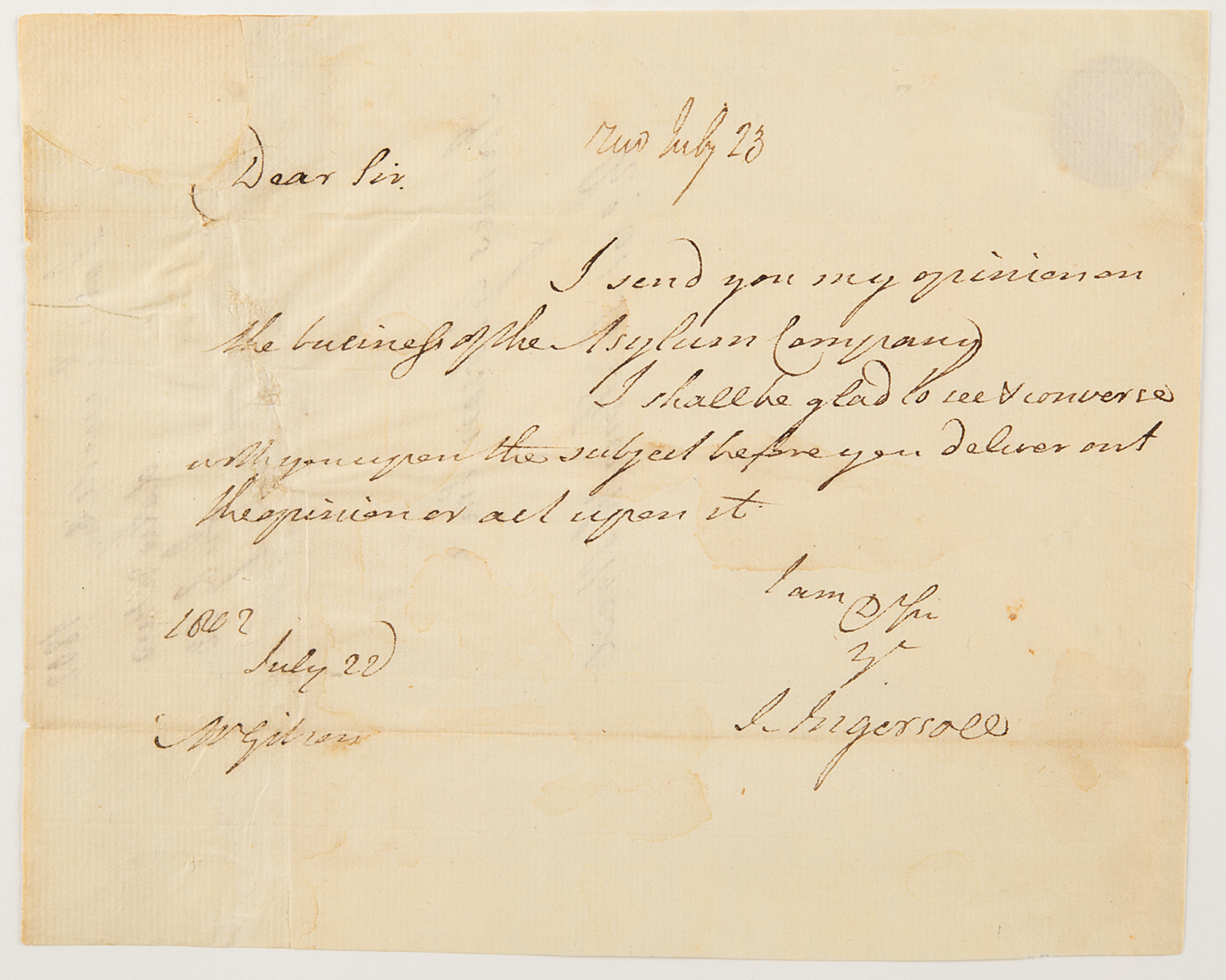 ALS signed “J. Ingersoll,” one page, 7.75 x 6.25, July 20, [1802]. Handwritten cover letter, noting Ingersoll's legal opinion on a business matter included in a secondary letter [not present].