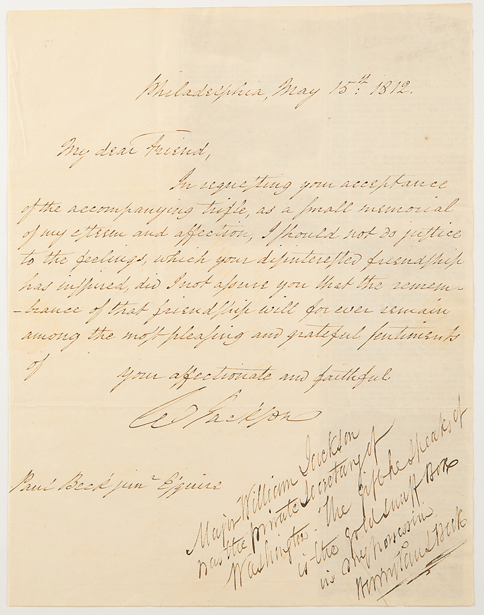 ALS signed “W. Jackson,” one page, 7.5 x 9.75, Philadelphia, May 15, 1812. Handwritten letter to "Paul Beck Junr. Esquire,” seemingly in an attempt to mend their friendship. Annotated and later signed by his son, Henry Paul Beck. Jackson served as secretary to the Constitutional Convention, and later, personal secretary to George Washington in the first two years of his presidency.