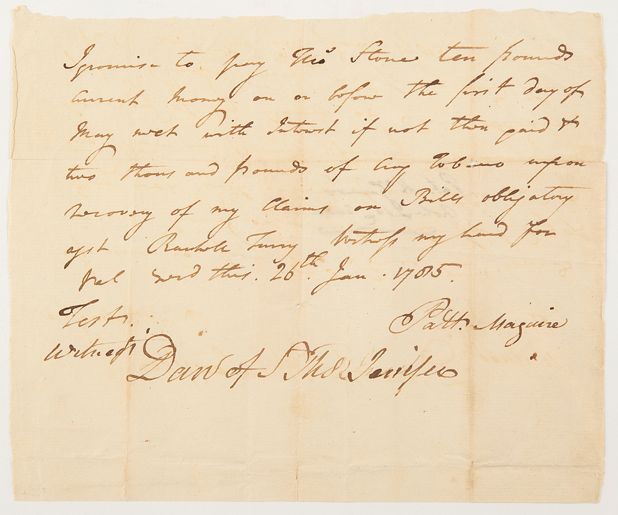 Manuscript DS signed “Dan of St. Thos. Jenifer,” one page, 7.25 x 6, January 26, 1785. Autograph contract of payment by Thomas Stone [Declaration of Independence Signer], who signs within the text, "Thos. Stone,” witnessed and signed at the conclusion by Jenifer, and countersigned by Patt. Maguire.