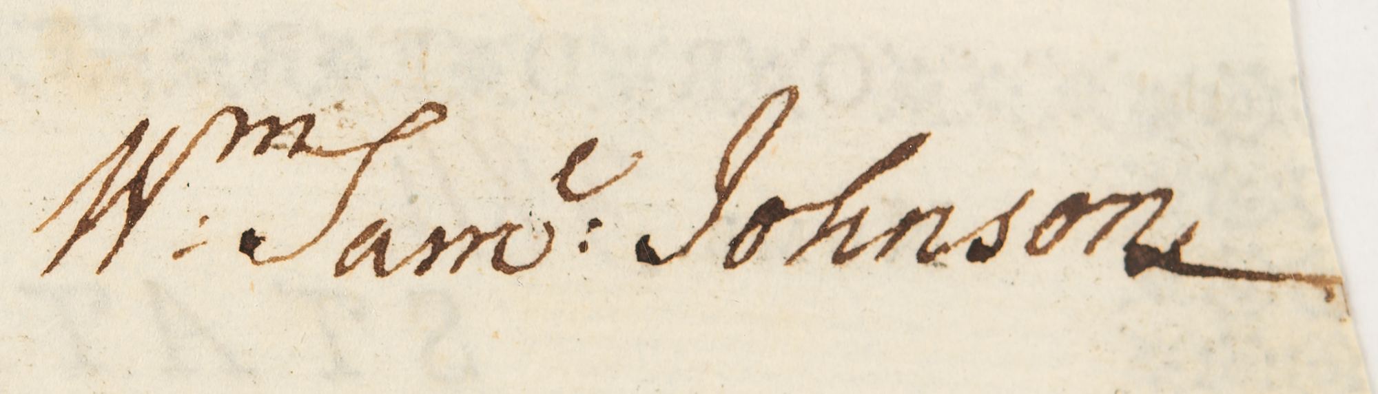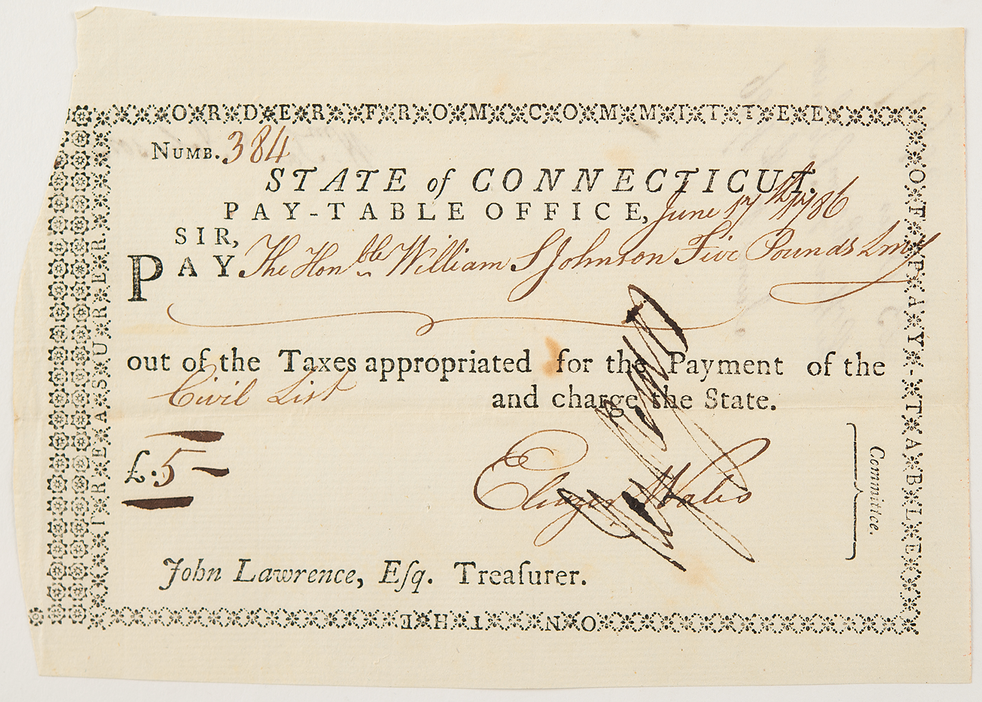 Partly-printed DS signed “W. Sam:l Johnson,” one page, 6.25 x 4.25, Connecticut, June 17, 1786. Document of payment (No. 384) to William Samuel Johnson, who adds his endorsement signature on the reverse.