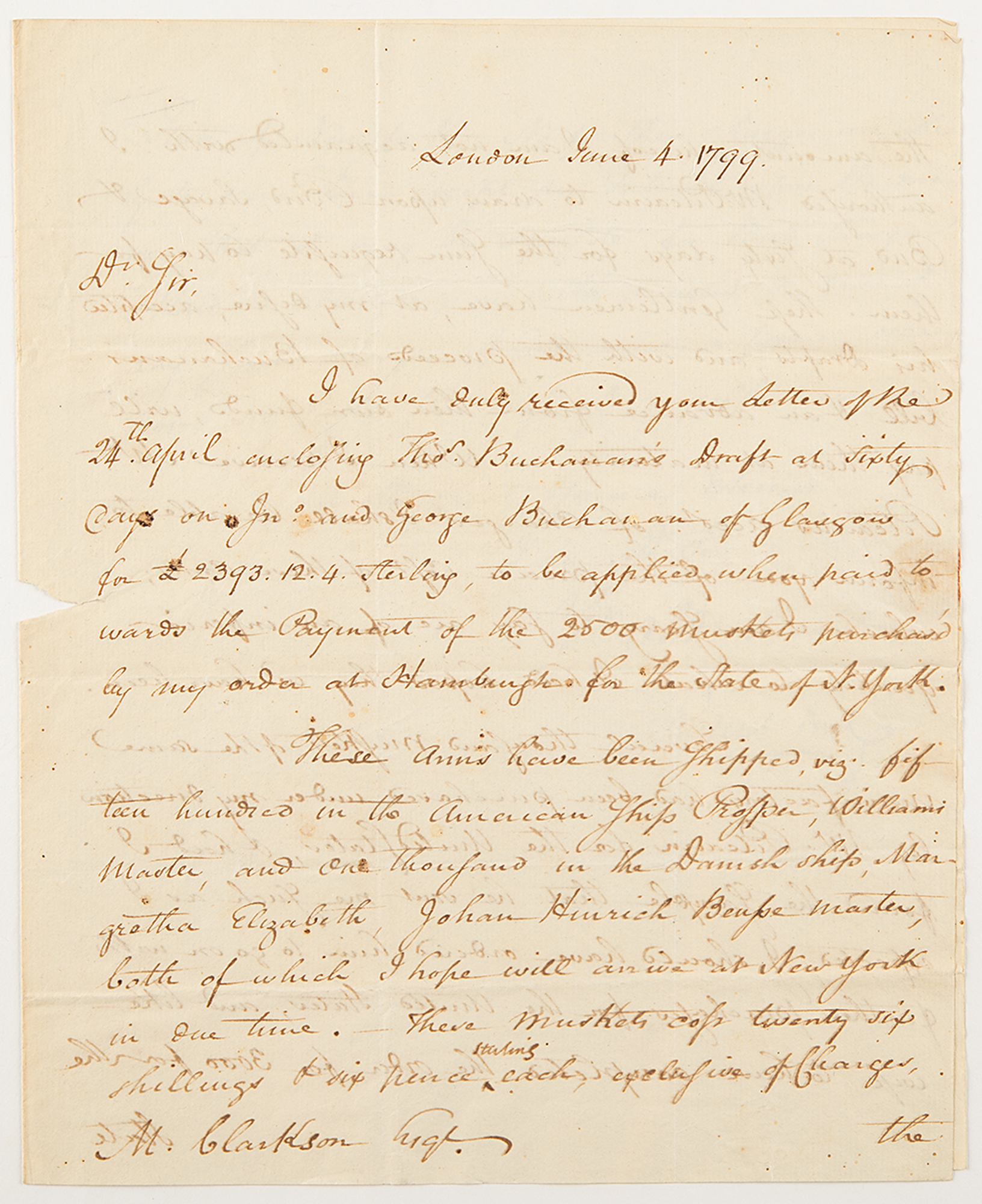 ALS as Minister to Great Britain, signed “Rufus King,” three pages, 8 x 9.75, June 4, 1799. Addressed from London, a handwritten letter to Matthew Clarkson, concerning an order of 2500 muskets from Hamburg for the State of New York and potential future purchases. The integral address leaf addressed "M. Clarkson Esq, New York,” and later docketed, purportedly in the hand of John Jay.