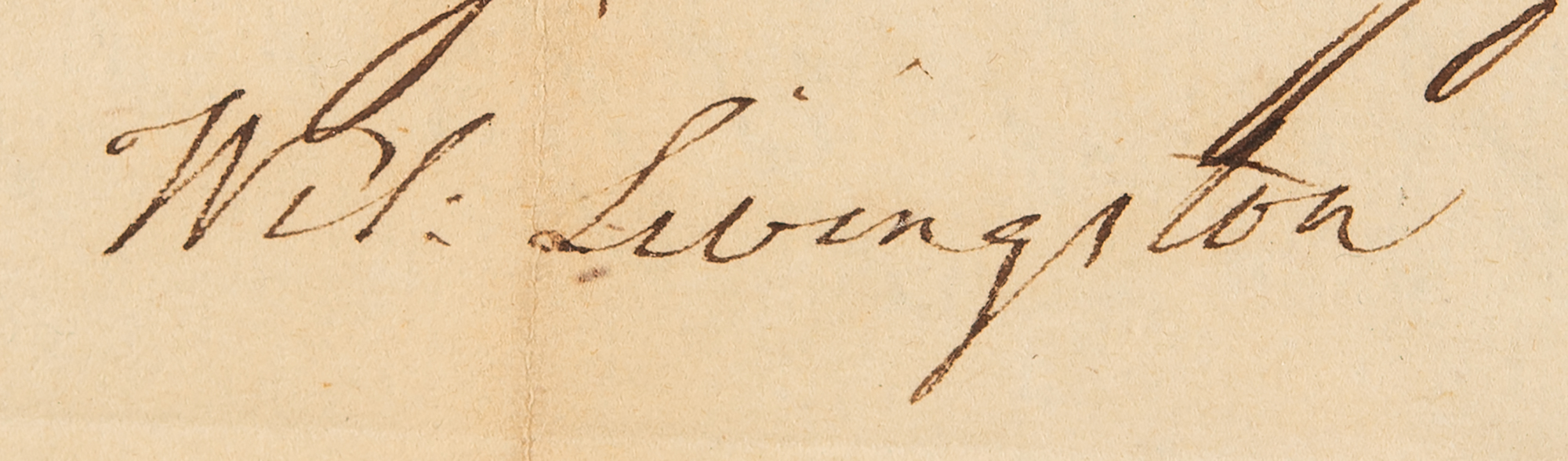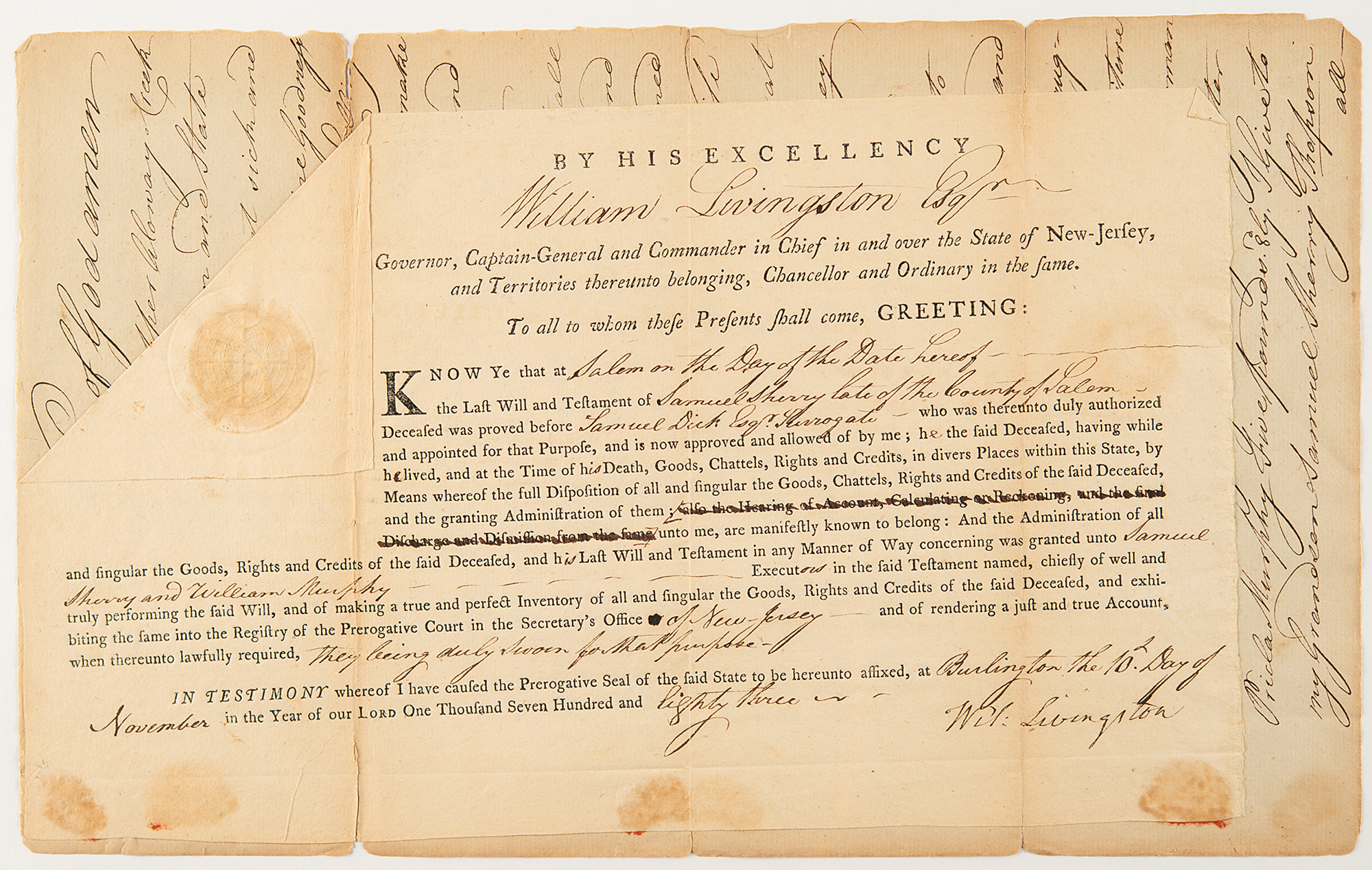 Partly-printed DS as Governor of New Jersey, signed “Wil: Livingston,” one page, 12 x 7.25, Burlington [New Jersey], November 10, 1783. Legal document appointing Samuel Sherry and William Murphy executors of a will. The embossed paper seal remains intact, and the document affixed to one leaf (two pages) of the will in question, in manuscript, with three wax seals.