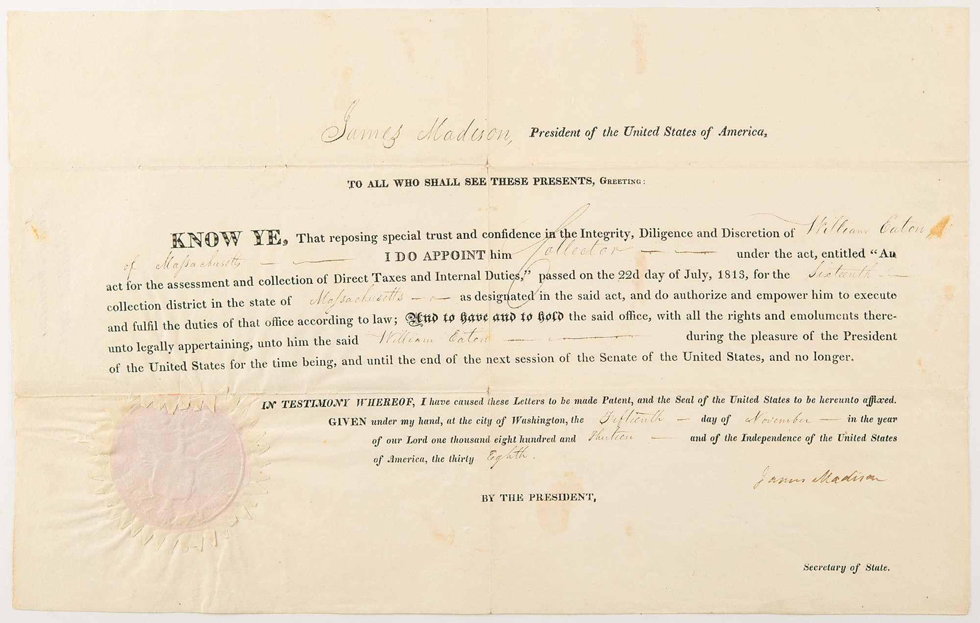 Partly-printed DS as president, signed “James Madison,” one page, 15.75 x 9.75, November 15, 1813. President Madison appoints William Eaton as a “Collector - under the act, entitled 'An act for the assessment and collection of direct taxes and internal duties'… for the sixteenth – collection district in the state of Massachusetts.” Signed at the conclusion by Madison. The lower left retains the original paper seal.