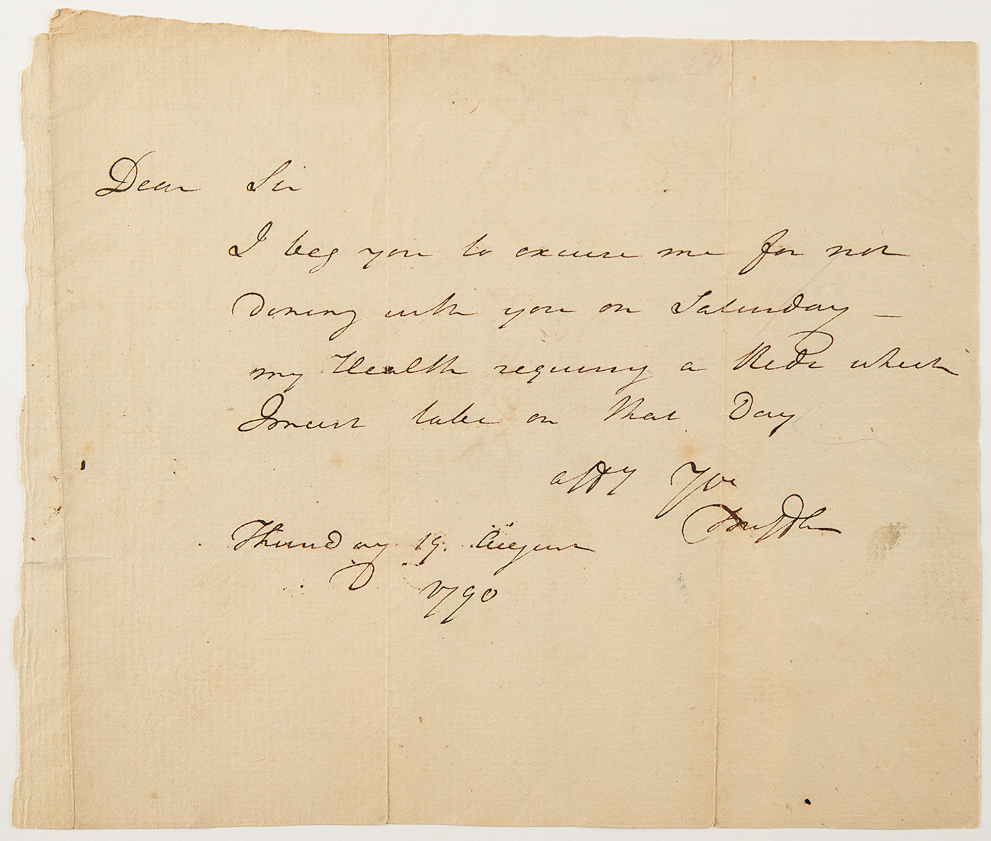 ALS as President of Pennsylvania, signed “T. Mifflin,” one page, 7.75 x 6.5, August 19, 1790. Handwritten letter to Mifflin's colleague in the American Philosophical Society, "Edward Burd Esq.,” regarding a missed social visit due to ill health.