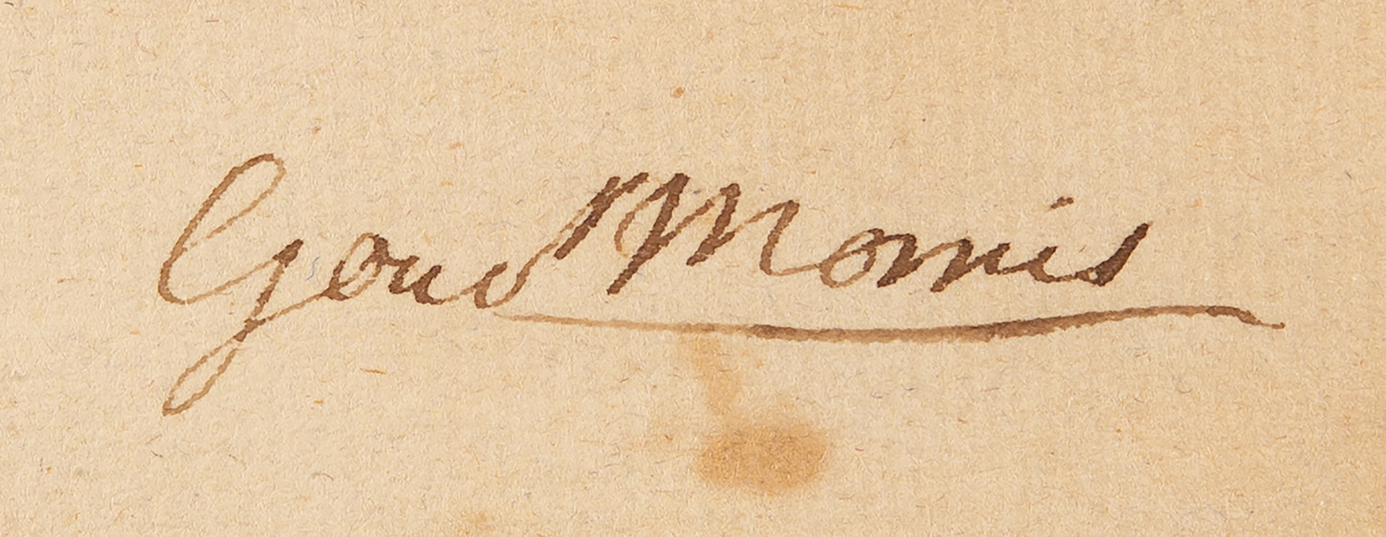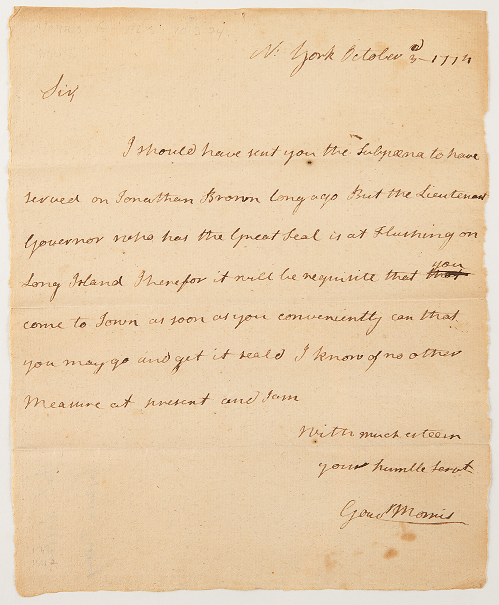 ALS signed “Gouv Morris,” one page, 6.25 x 7.5, October 3, 1774. Handwritten letter to Joshua Purdy concerning sealing a subpoena on one Jonathan Brown.