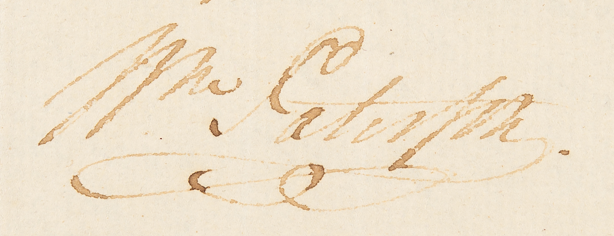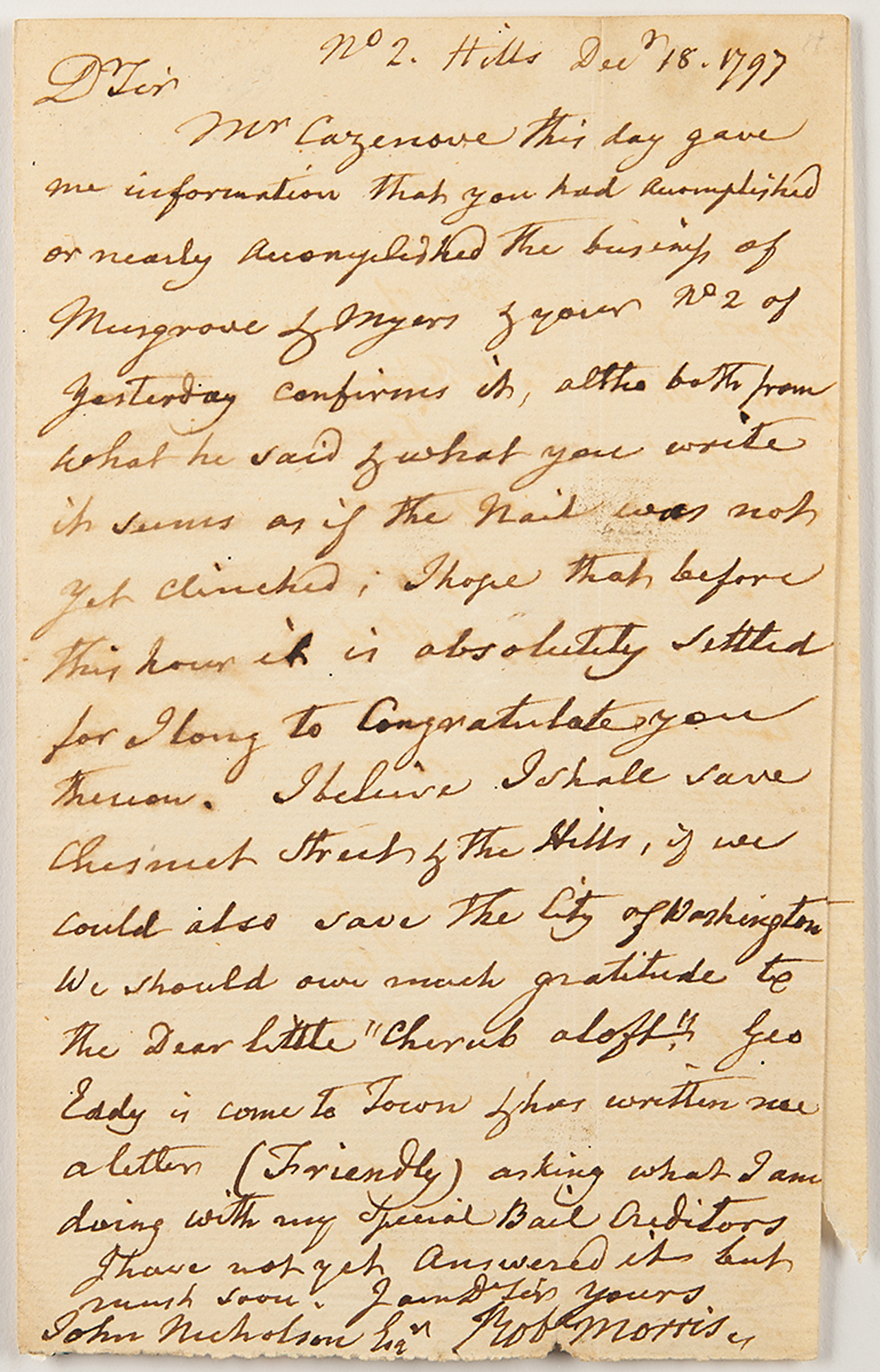 ALS signed “Robt. Morris,” one page, 4.75 x 7.5, December 18, 1797. Addressed from The Hills [Philadelphia], a handwritten letter to John Nicholson, former Comptroller General of Pennsylvania, concerning their real estate business dealings and specifically mentioning "Chestnut Street,” an unfinished (and ultimately never finished) mansion later known as "Morris' Folly."