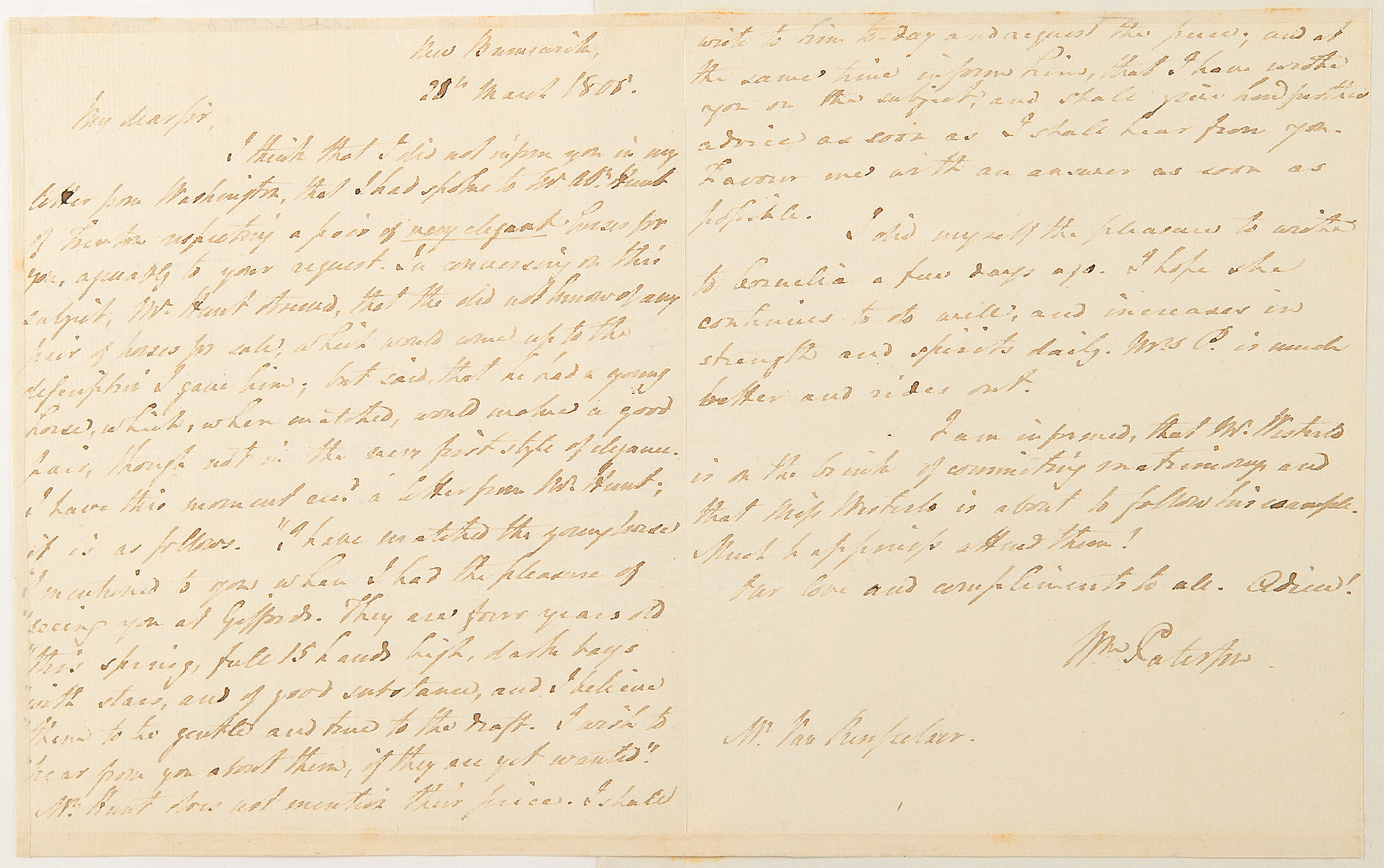 ALS signed twice as “Wm. Paterson,” three pages, 6.25 x 7.75, New Brunswick [New Jersey], March 20, 1805. Handwritten letter signed twice – in the body of the text and again at the end – addressed to one Mr. Hunt, concerning the purchase and sale of horses and including an autograph transcript of a letter to S. Van Rensselaer of the same date.