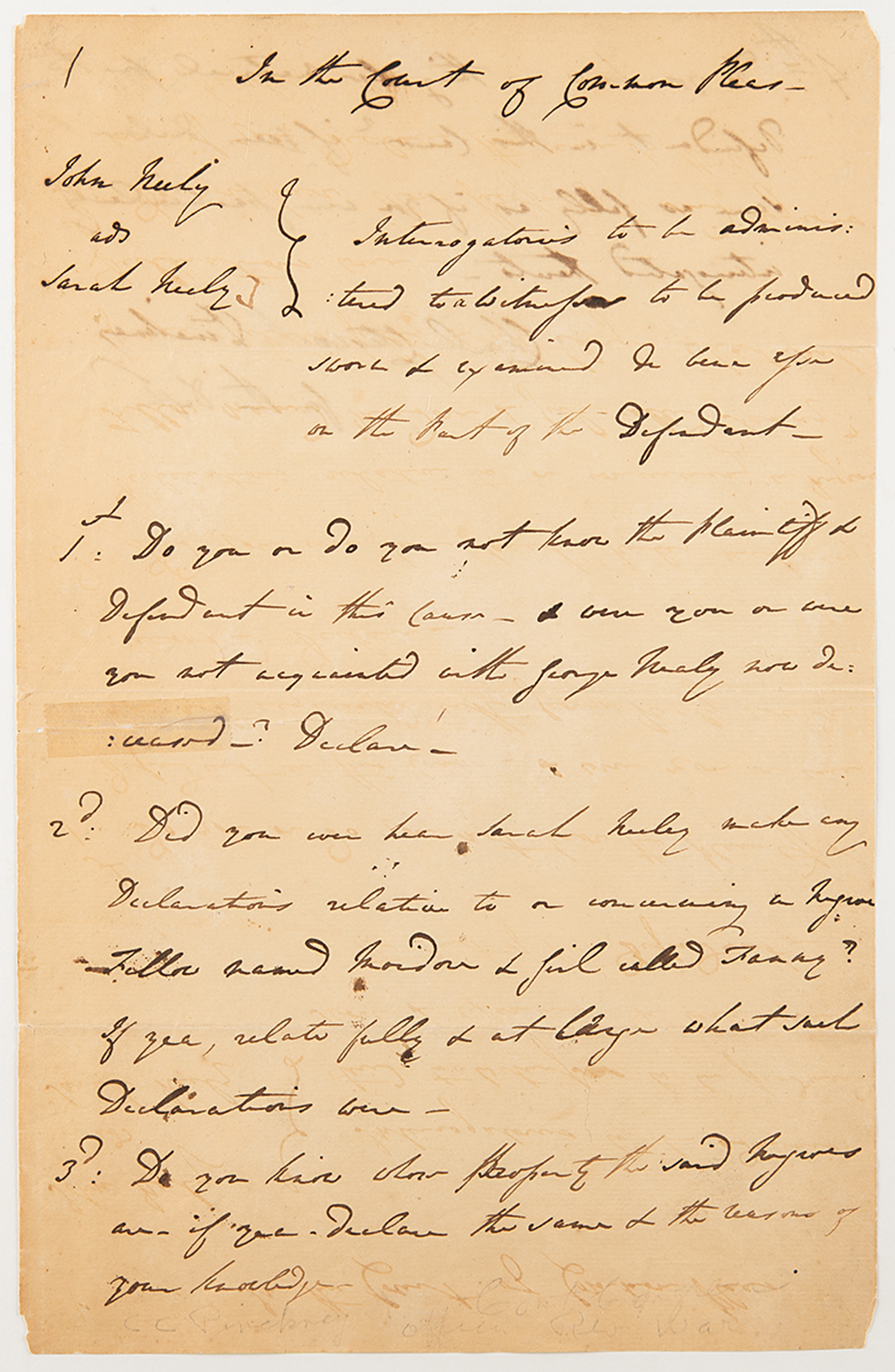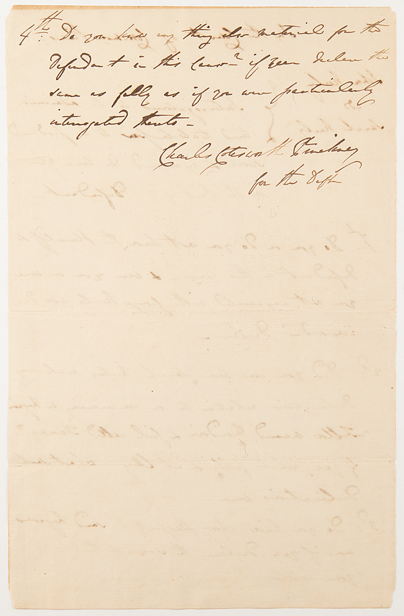 ADS signed “Charles Cotesworth Pinckney,” two pages, 8.25 x 12.75, docketed September 13, 1786. Handwritten legal document concerning a list of four "Interrogatories to be administered to a witness to be produced, sworn, and examined &c. hereafter on the part of the Defendant."