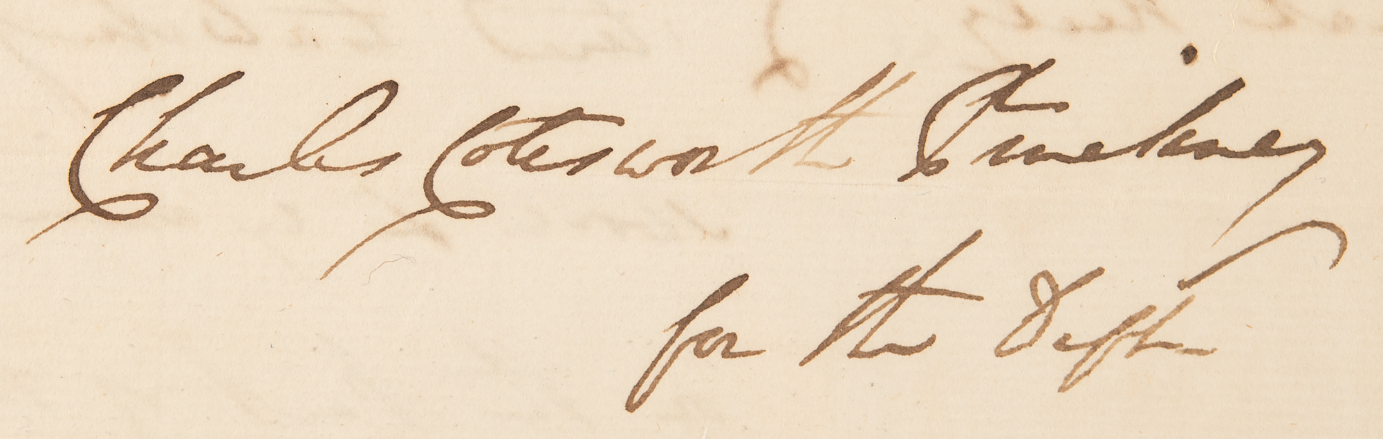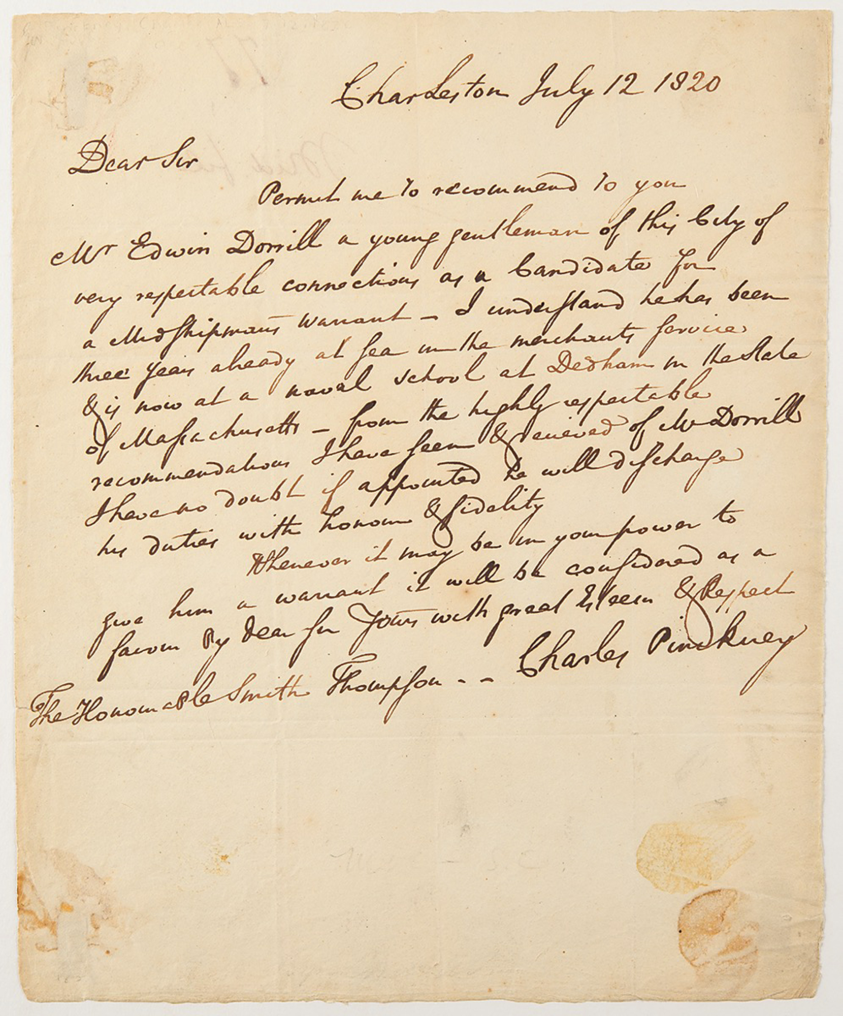 ALS signed “Charles Pinckney,” one page, 7.75 x 9.25, Charleston [South Carolina], July 12, 1820. Handwritten letter of introduction recommending Mr. Edwin Dorrill to Smith Thompson for a midshipman's warrant.