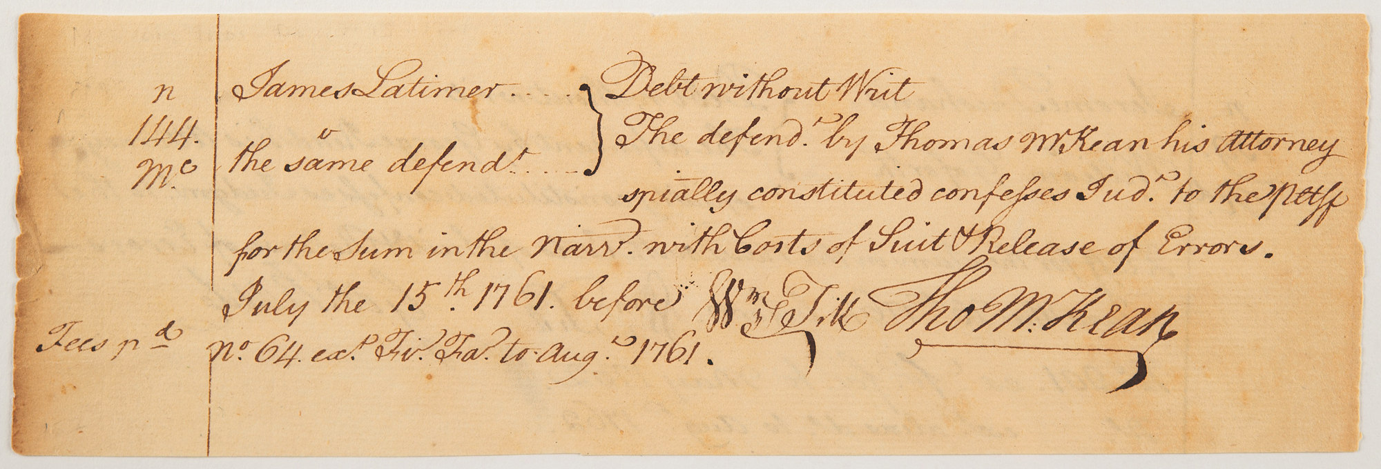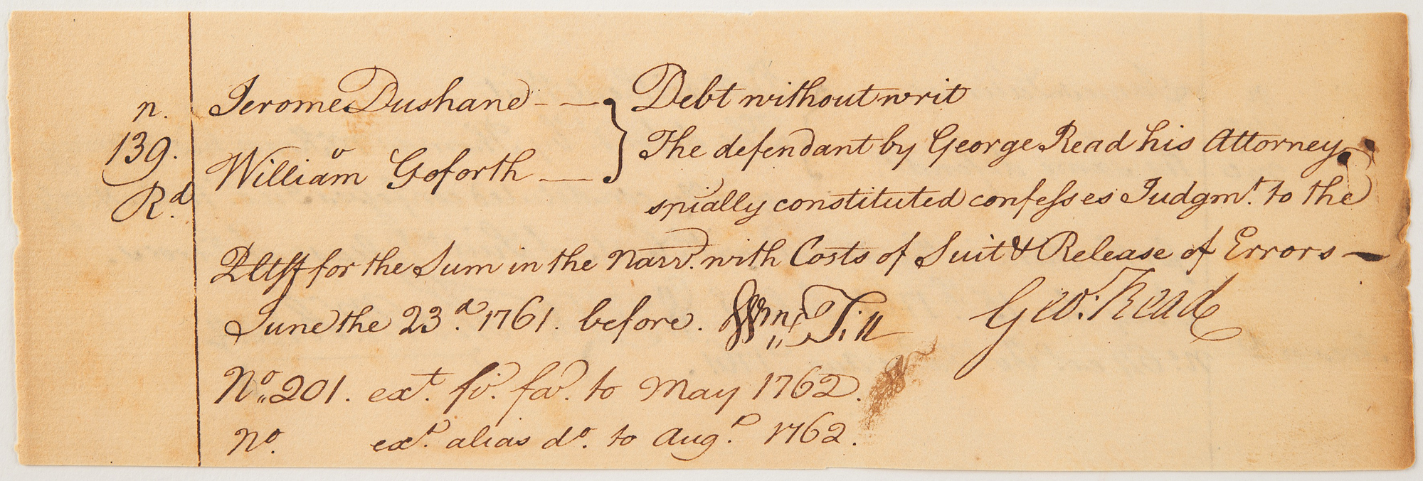 Manuscript DS signed “Geo: Read,” one page both sides, 7.75 x 2.5, June 23, 1761. Legal leger document numbered 139, reading, in part: "The defendant by George Reed his Attorney spially [specifically] constituted confesses judgm[en]t to the Deft.” Read also signed the Declaration of Independence, the only signer to do so even after voting against the initiative. The verso contains a similar ledger entry, numbered 144 and dated July 15, 1761, and is signed by Thomas McKean, who also signed the Declaration of Independence and the Articles of Confederation.