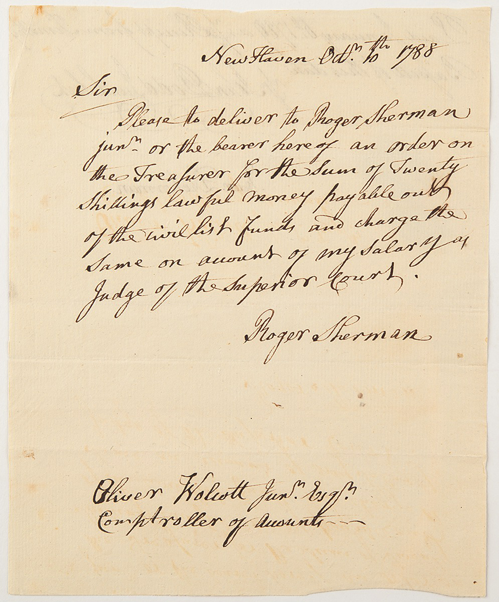 ALS signed “Roger Sherman,” one page, 6 x 7.25, New Haven [Connecticut], October 10, 1788. Handwritten letter to Oliver Wolcott Jr., Comptroller of Accounts, concerning the dispensing of payment to Robert Sherman Jr.