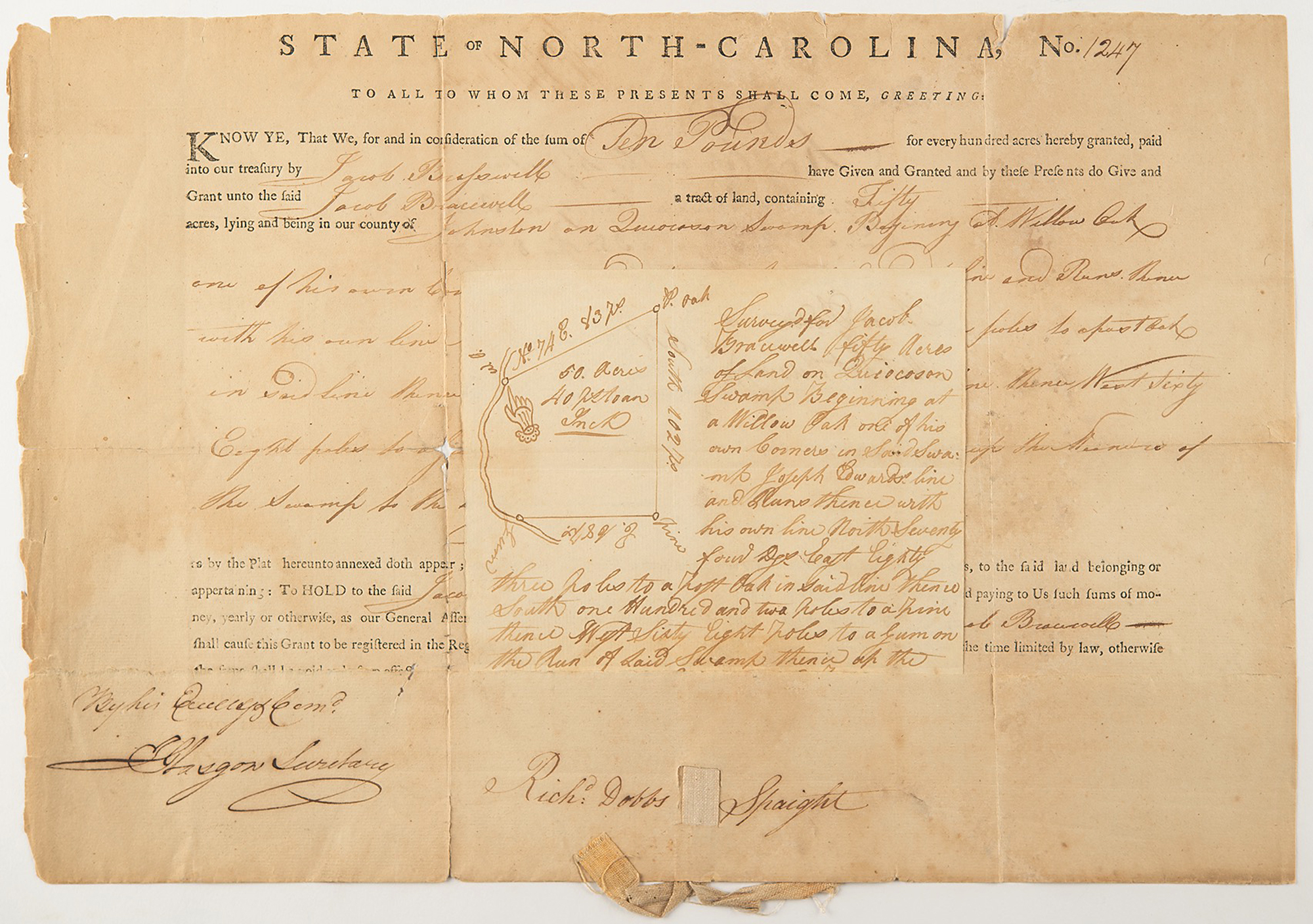 Partly-printed DS as Governor of North Carolina, signed "Richd: Dobbs Spaight,” one page, 15.5 x 10.75, New Bern [North Carolina], December 17, 1794. Land grant document for Jacob Bracewell for property in Johnston County, witnessed and signed by Spaight as Governor of North Carolina. Together with manuscript land surveyor's notes, including a rough drawn map of the property, with the ribbon seal intact.