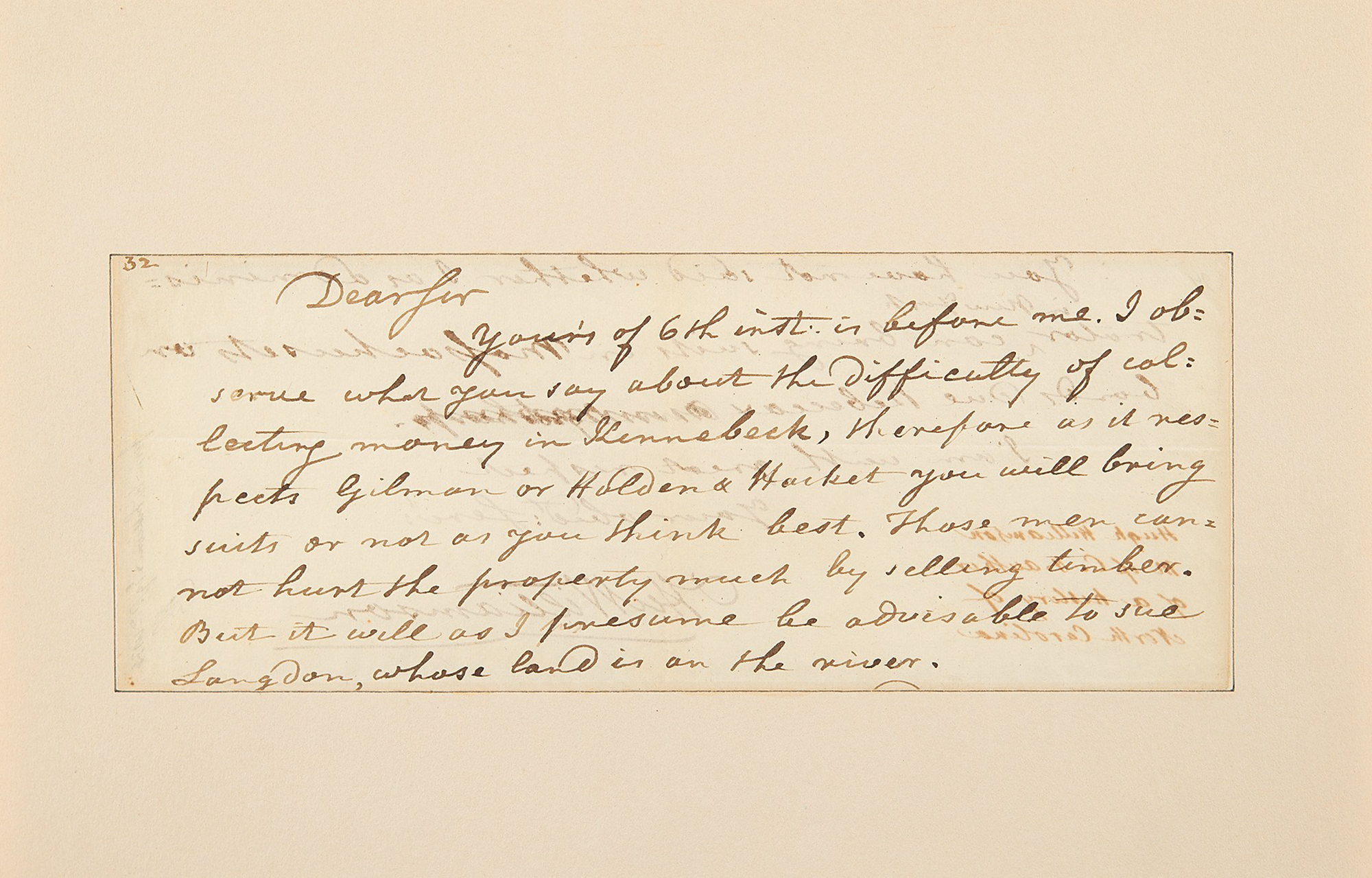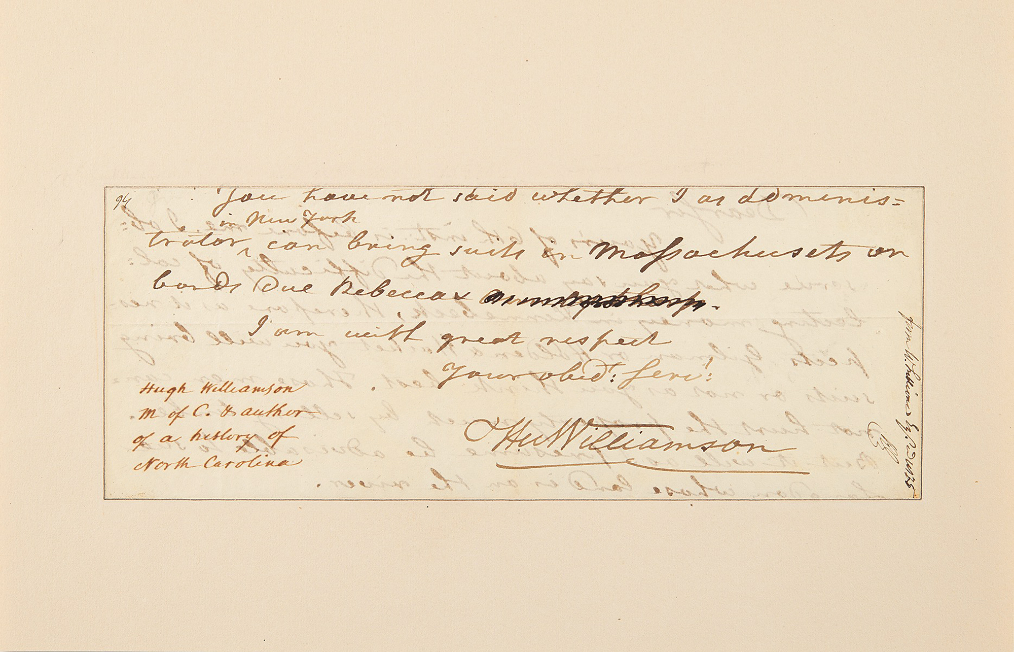 Partial ALS signed "Hu Williamson,” one page, 8 x 3, no date. Partial handwritten letter threatening suit against "Gilman or Holden & Hacket…" and "Langdon,” possibly referring in part to Williamson's fellow Constitutional signers, Nicholas Gilman and John Langdon, of New Hampshire.