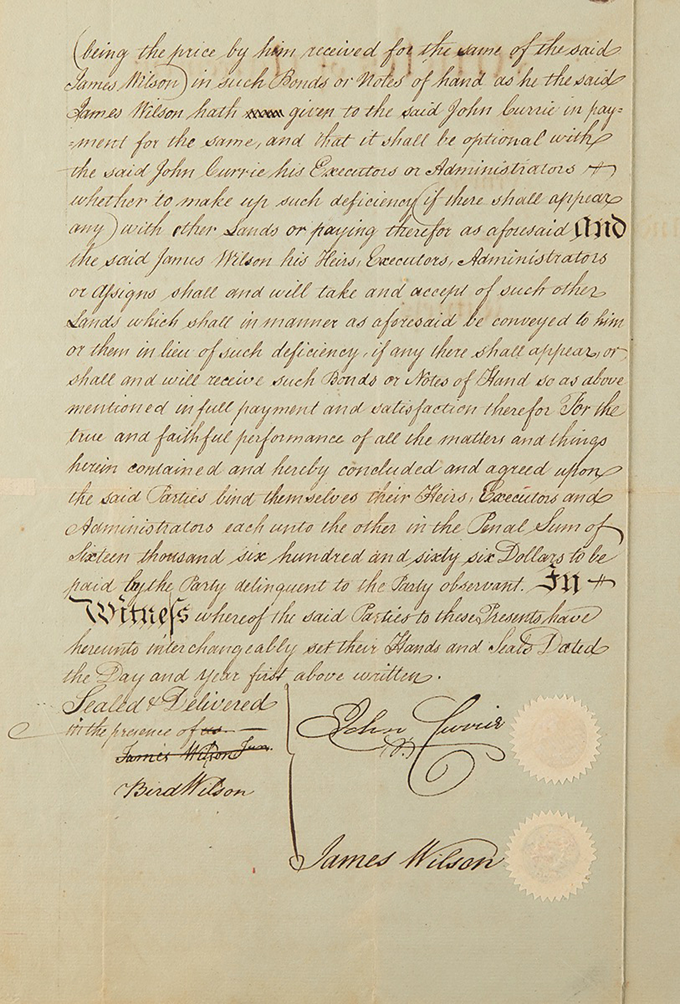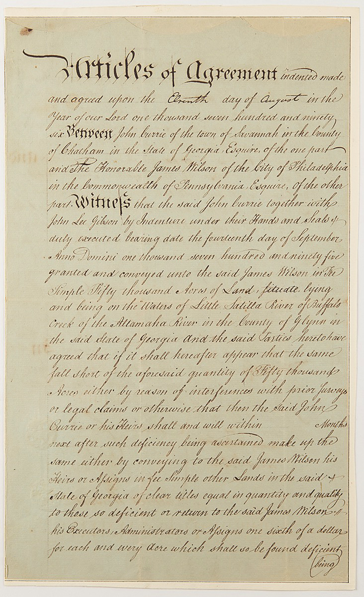 Manuscript DS signed “James Wilson,” two pages, 7.5 x 12.5, Savannah, Georgia, August 11, 1790. Articles of agreement concerning the sale of 50,000 acres in Georgia along Buffalo Creek by John Currie of Savannah to James Wilson of Philadelphia, PA. Signed at the conclusion by Wilson and countersigned by John Currie.