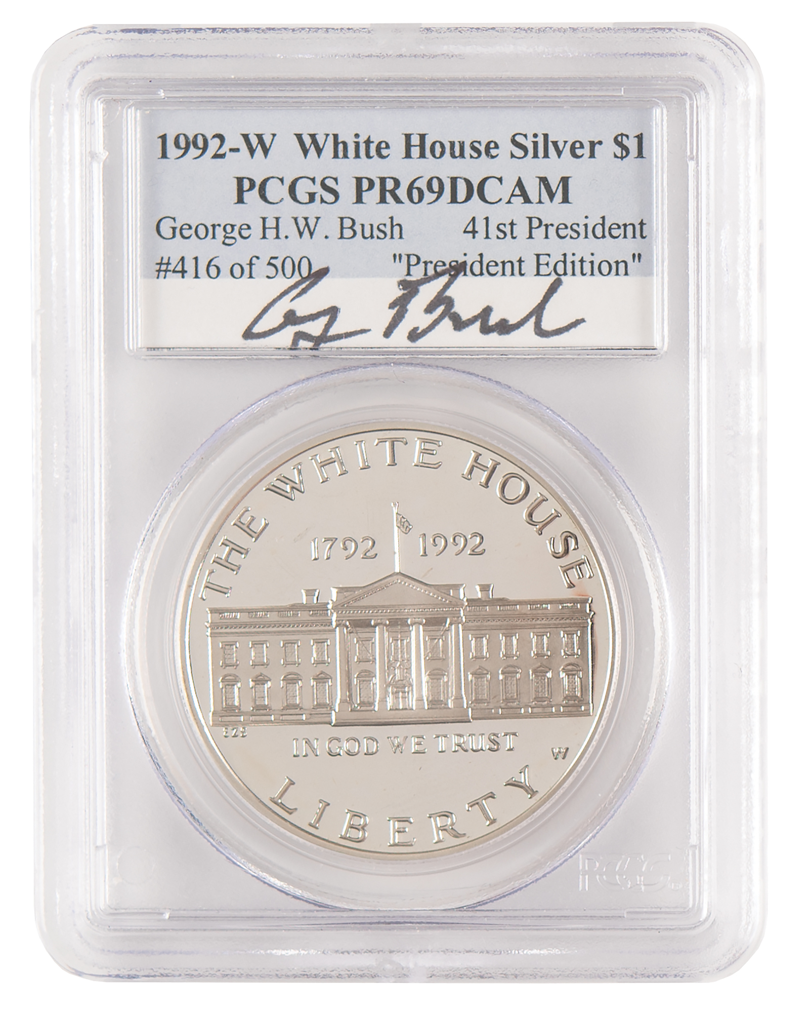 Appealing encapsulated 'President Edition' of the 1992-W $1 White House silver dollar coin, encapsulated and graded by PCGS PR69DCAM [Deep Cameo], numbered 416/500 and signed on the label in black felt tip, "George Bush." In very fine condition.