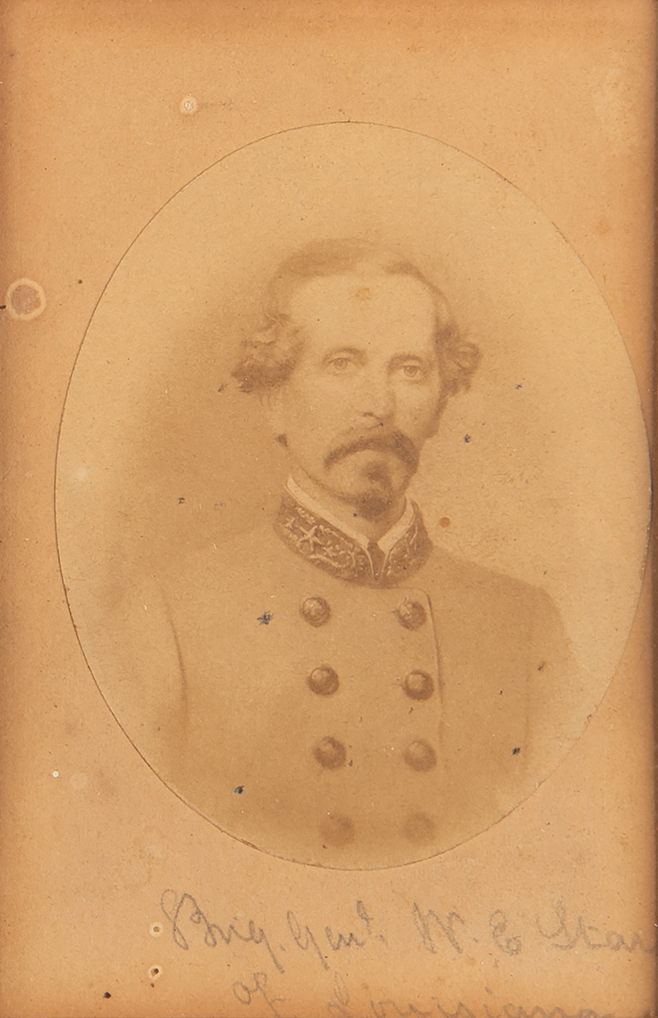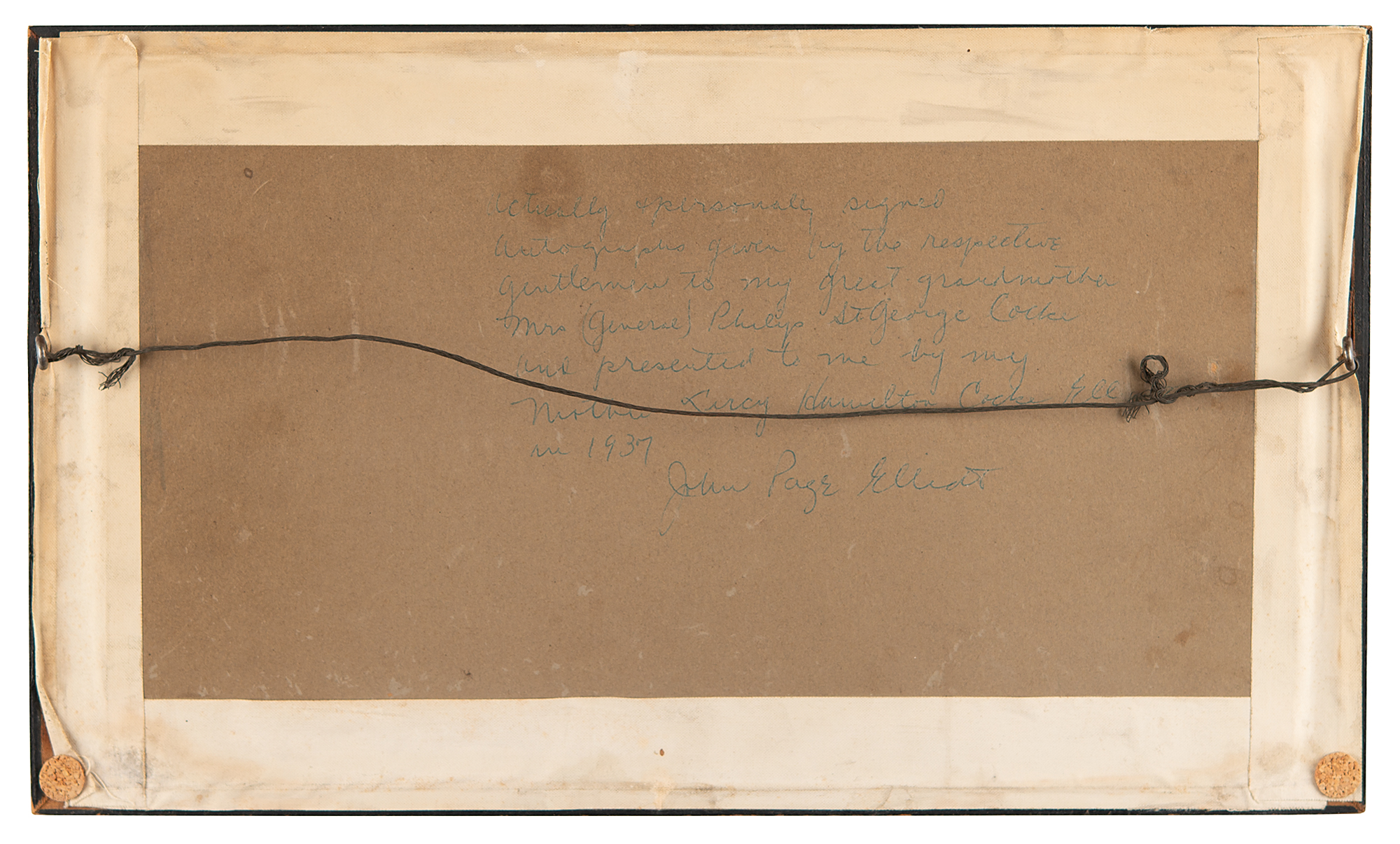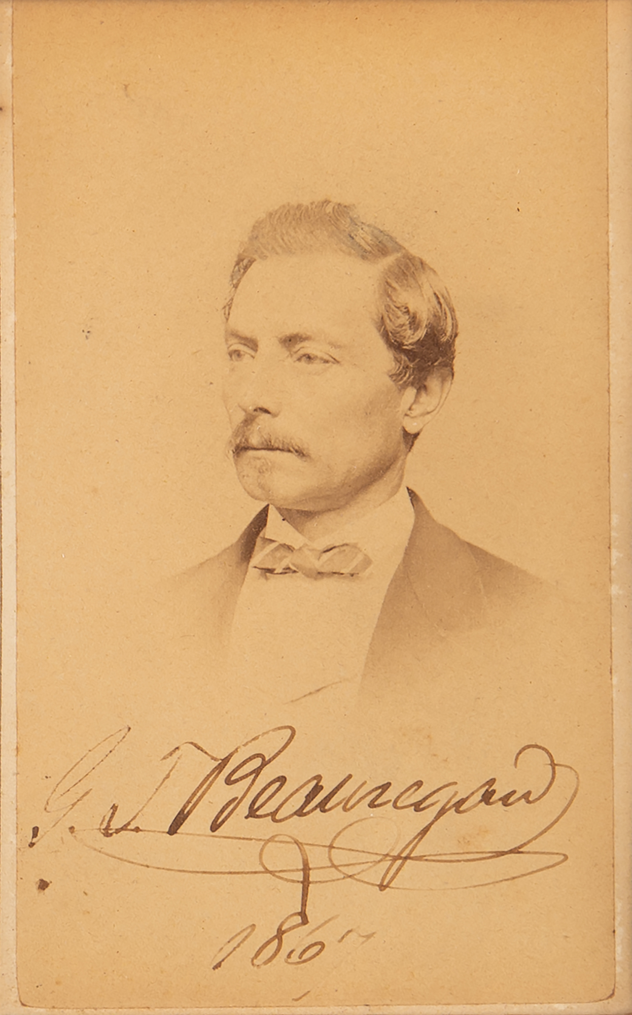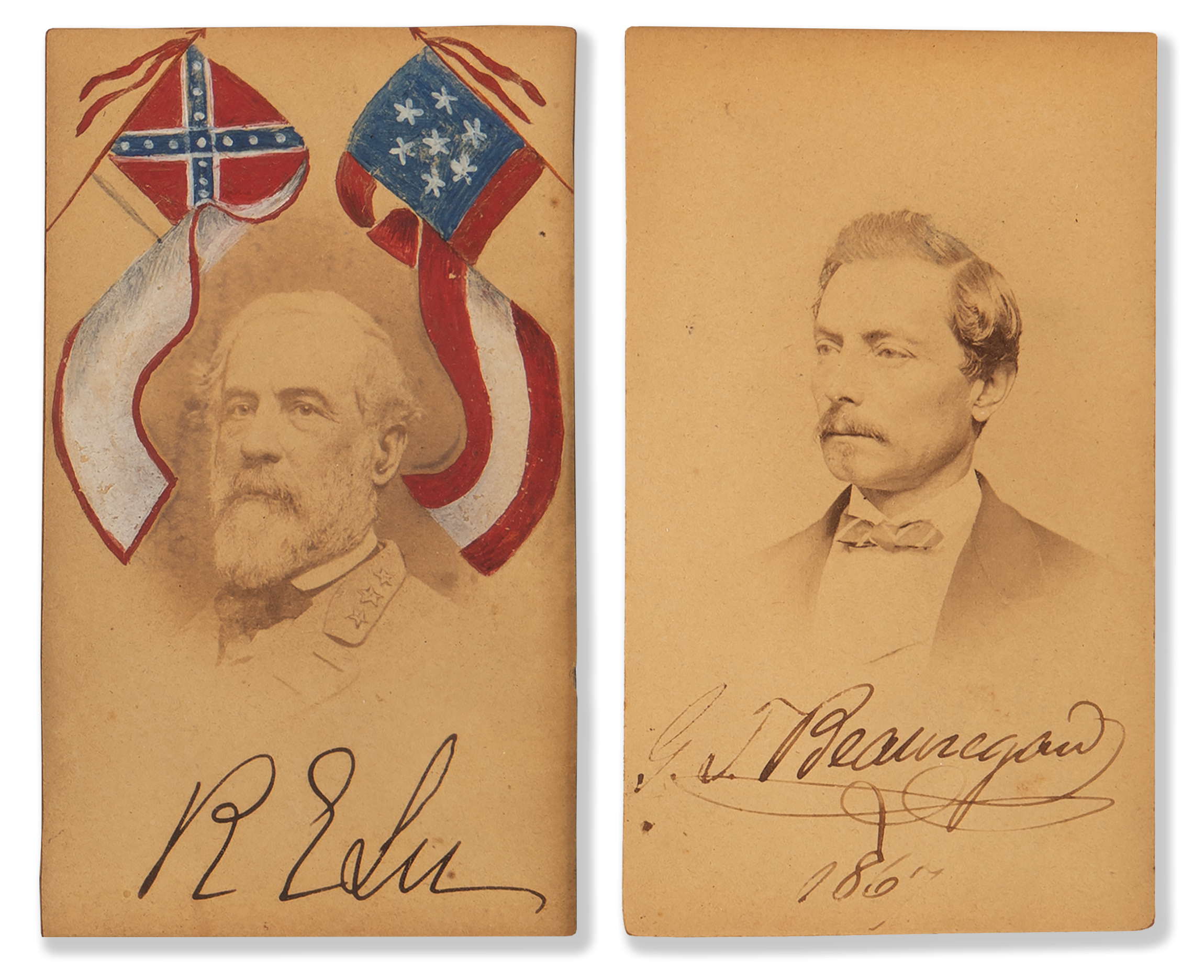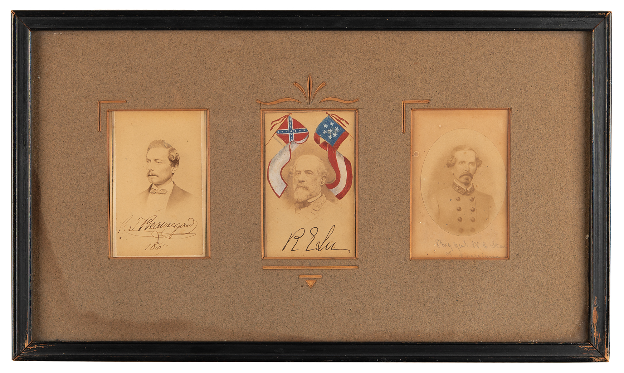 Unique display featuring three carte-de-visite portraits of Confederate generals, with two signed by their subjects: at center is a 2.25 x 3.75 carte-de-visite portraying Robert E. Lee in uniform, colorfully embellished by hand with an illustration of two flags, boldly signed in the lower border in ink, "R. E. Lee"; to the left is a 2.5 x 3.75 carte-de-visite of P. G. T. Beauregeard wearing a bow tie, neatly signed below the image in ink, "G. T. Beauregard, 1867"; and to the right is a rare 2.5 x 3.75 carte-de-visite portrait of William E. Starke, who was killed in action at the Battle of Antietam while commanding the famed 'Stonewall Division,' identified in pencil in another hand. Matted and framed together to an overall size of 14.75 x 8.75; on the reverse is an interesting provenance note: "Actually personally signed autographs give by the respective gentlemen to my great grandmother Mrs. (General) Philip St. George Cocke and presented to me by my mother Lucy Hamilton Cocke Elliott in 1937, John Page Elliott." In overall fine condition, with dampstaining to the mat.