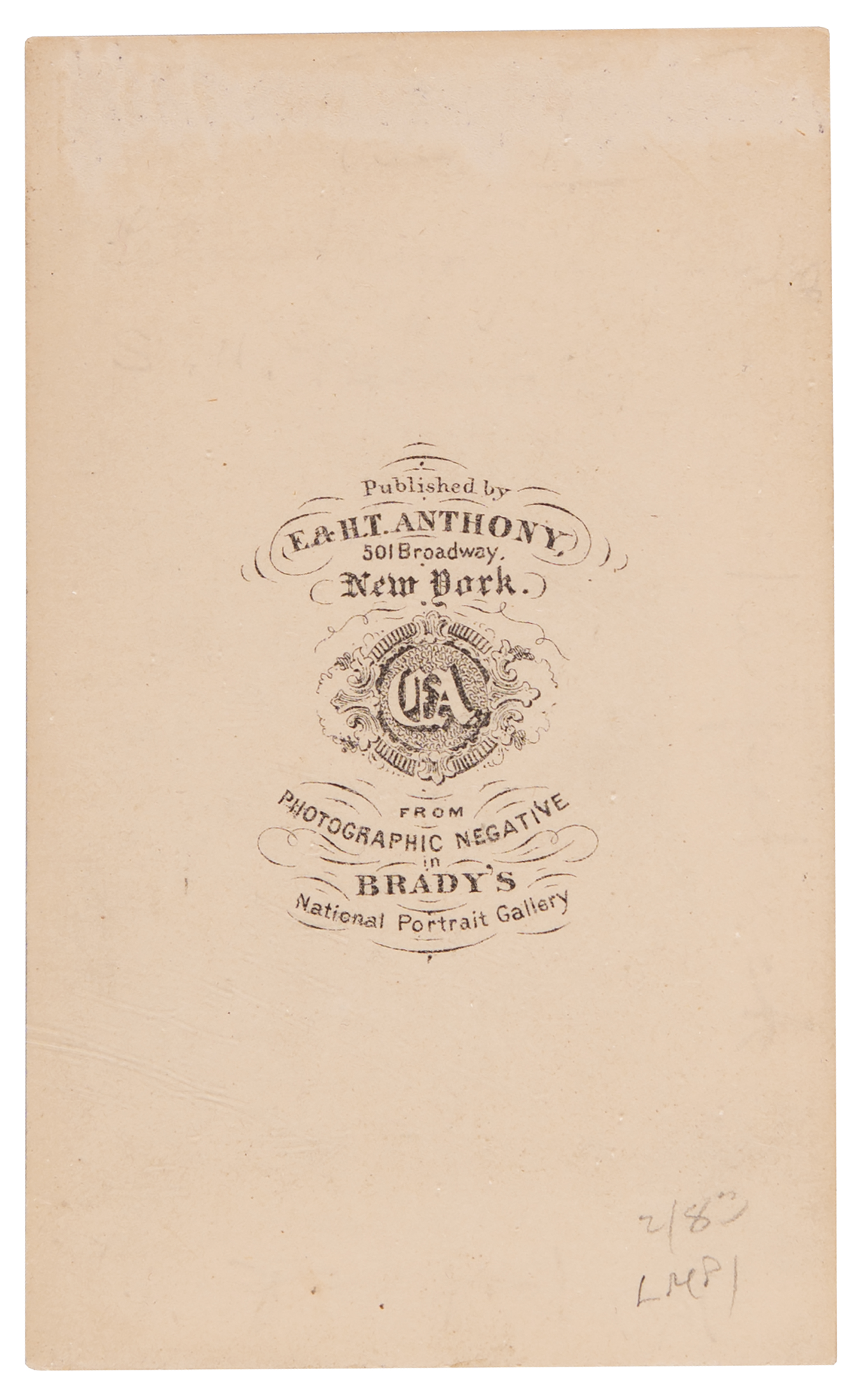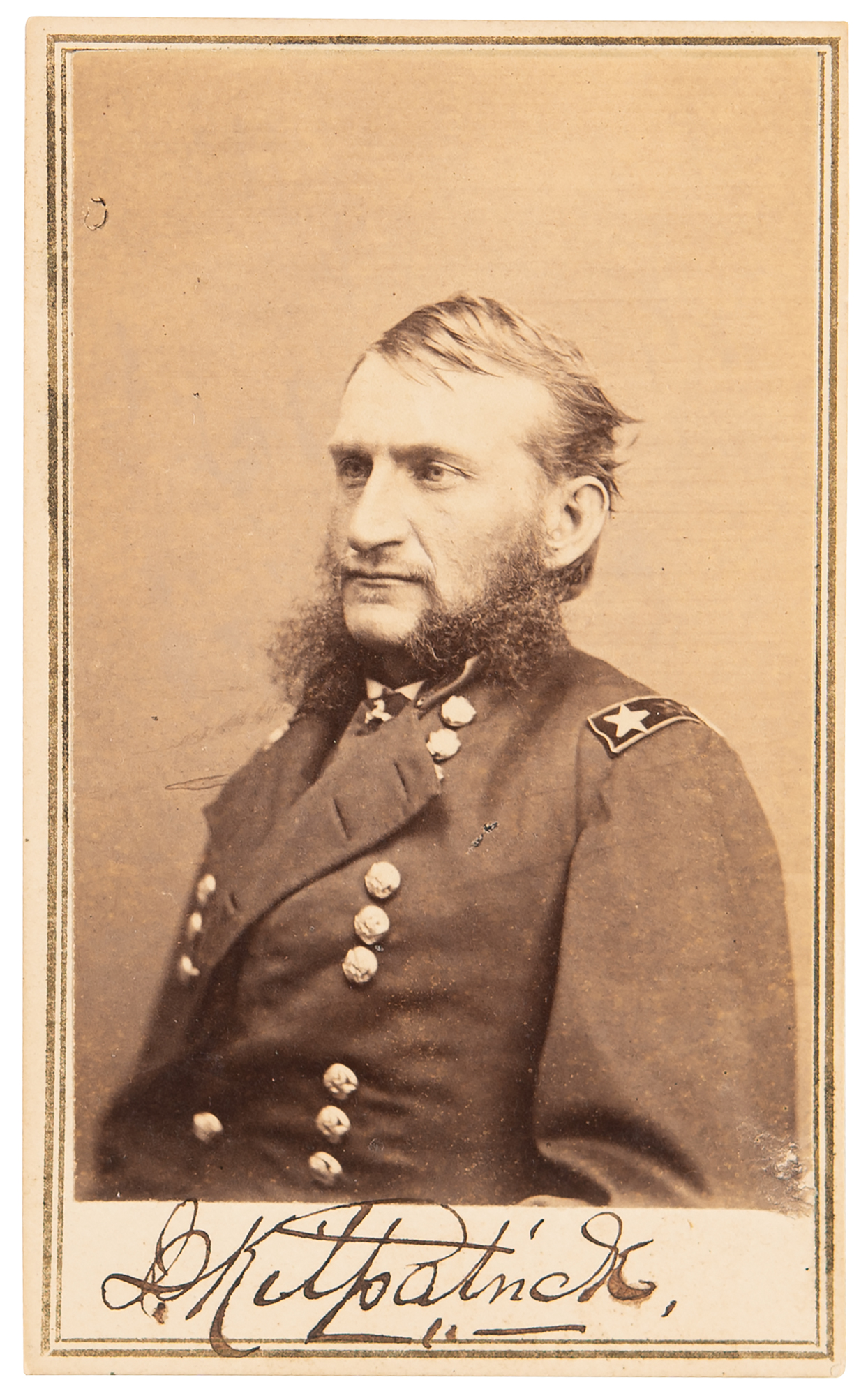 American military officer (1836–1881), who, as a general in the Civil War, earned the sobriquet ‘Kill-Cavalry’ for his gung-ho disregard for the lives of the soldiers under his command. Following the Civil War he served as the American Minister to Chile in the Johnson and Grant administrations; after a decade long hiatus, he was reappointed to that post by Garfield but died shortly after arriving at the Chilean capital. Uncommon 2.5 x 4 carte-de-visite photo of Hugh Judson Kilpatrick in uniform, boldly signed on the mount in ink, "J. Kilpatrick." Published by E. & H. T. Anthony of New York, from a photographic negative in Brady's National Portrait Gallery. In fine condition.