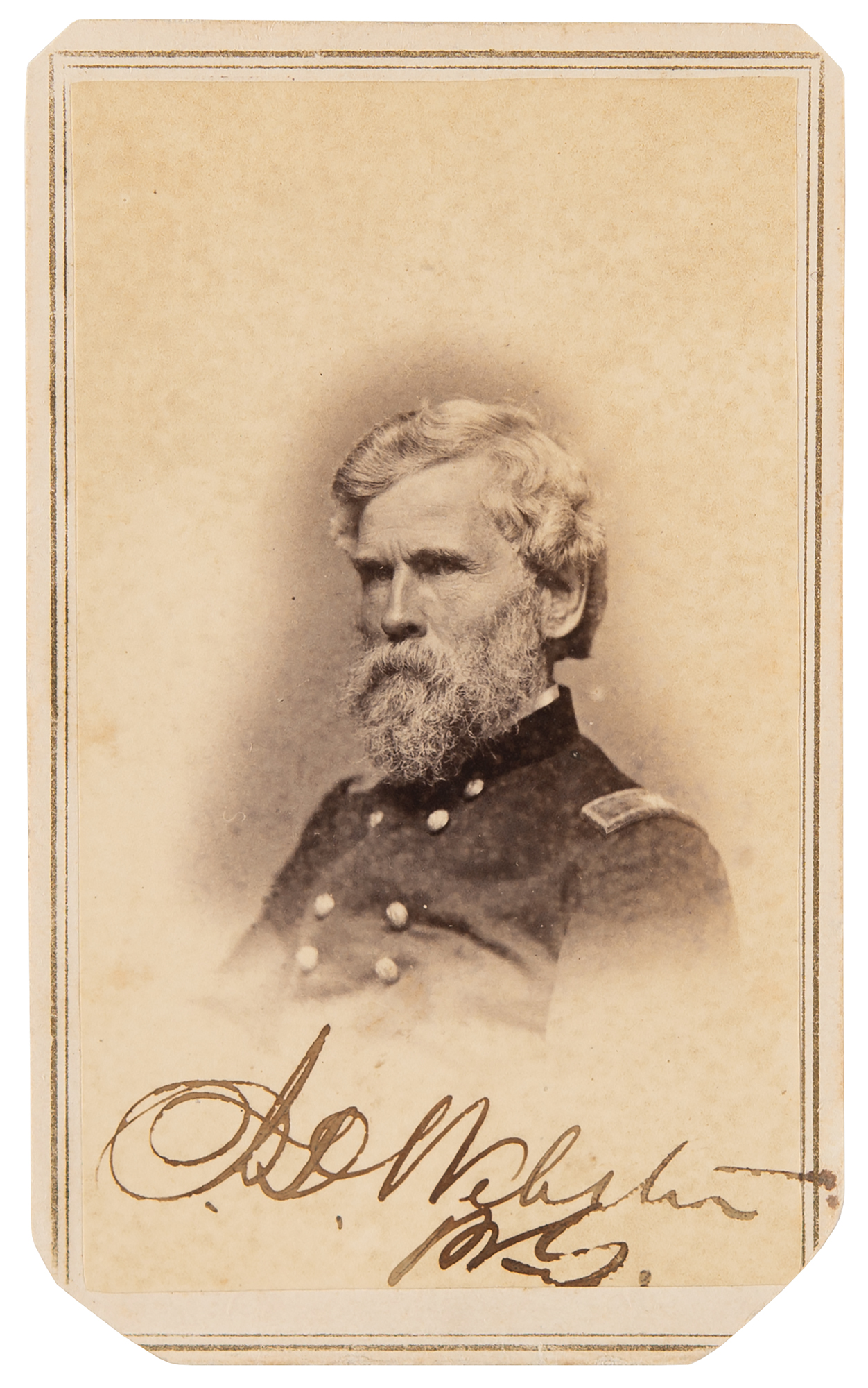 Civil engineer and Union soldier (1811–1876) who served as chief of staff to both Ulysses S. Grant and William T. Sherman. Scarce 2.5 x 4 carte-de-visite photo of the grizzled veteran Joseph Dana Wheeler in uniform, signed in ink, "J. D. Webster, Br. G." In very good to fine condition, with clipped corners.
