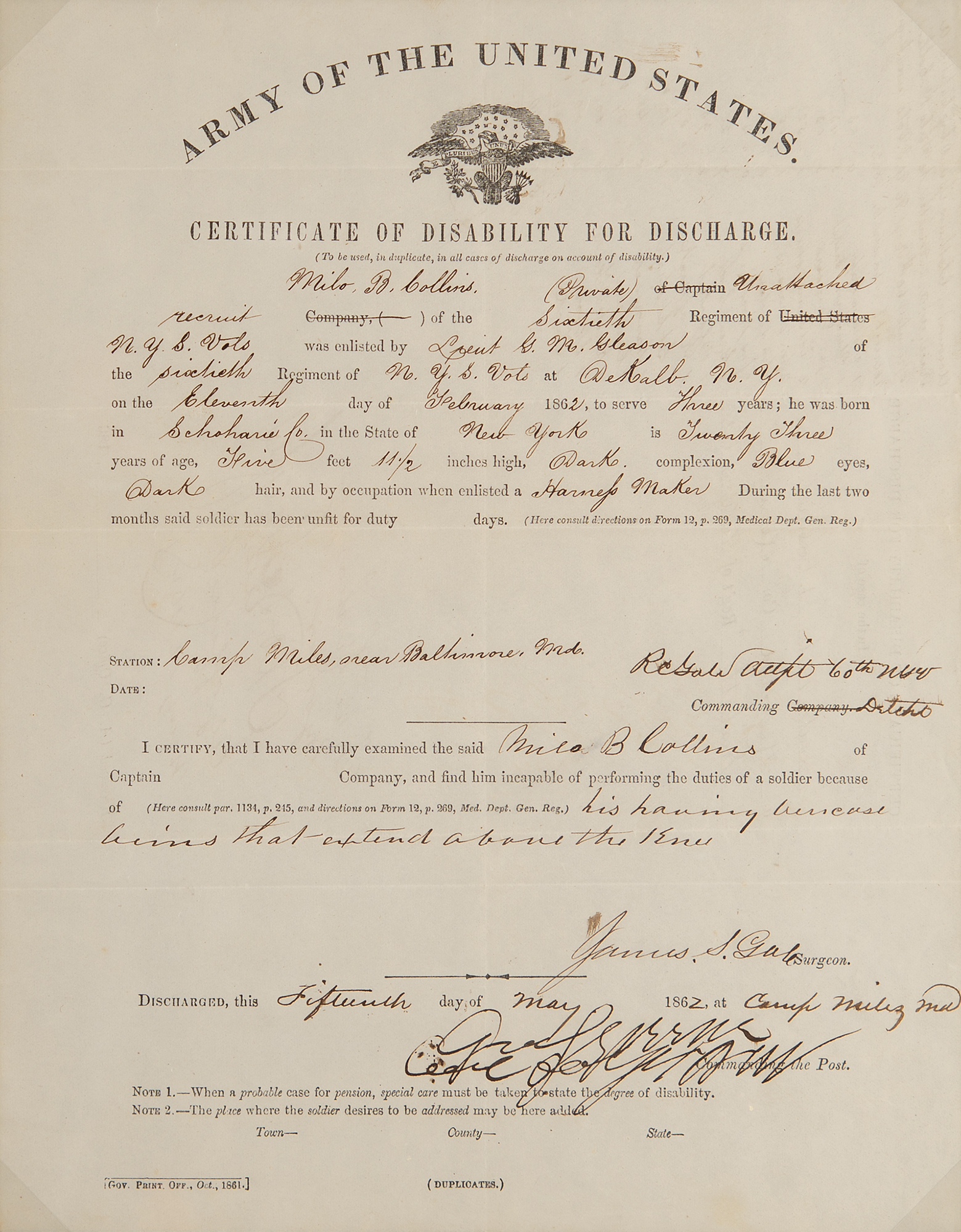 Civil engineer and Union general (1801–1899) known for his defense of the Union right flank at Culp's Hill during the Battle of Gettysburg. Civil War–dated partly-printed DS, signed “Geo. S. Greene,” one page, 8 x 10, May 15, 1862. Army of the United States document headed "Certificate of Disability for Discharge," in part: "Milo B. Collins (Private), Unattached recruit of the Sixtieth Regiment of N.Y.S. Vols. was enlisted by Lieut. G. M. Gleason of the sixtieth Regiment of N. Y. S. Vols. at DeKalb, N.Y., on the Eleventh Day of February 1862, to serve three years…I have carefully examined the said Milo B. Collins…and find him incapable of performing the duties of a soldier because of…his having varicose veins that extend above the knee." Corner-mounted, matted, and framed with a portrait to an overall size of 28 x 24. In fine condition.
