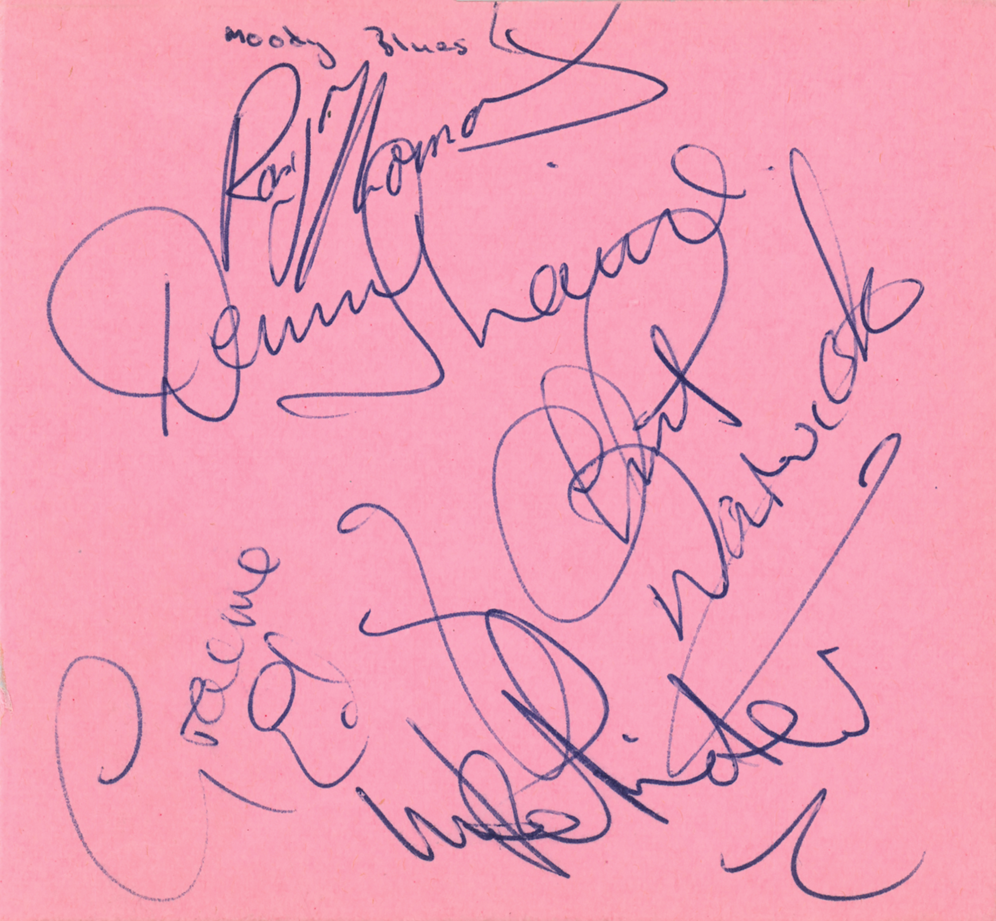Vintage ballpoint signatures of the original lineup of the Moody Blues — Graeme Edge, Mike Pinder, Ray Thomas, Clint Warwick, and Denny Laine — on a pink 4.25 x 4 album page. The consignor notes that the autographs were obtained in Bristol, England in the 1960s. In fine condition. Accompanied by a certificate of authenticity from Tracks and a Moody Blues Decca Records promotional card.