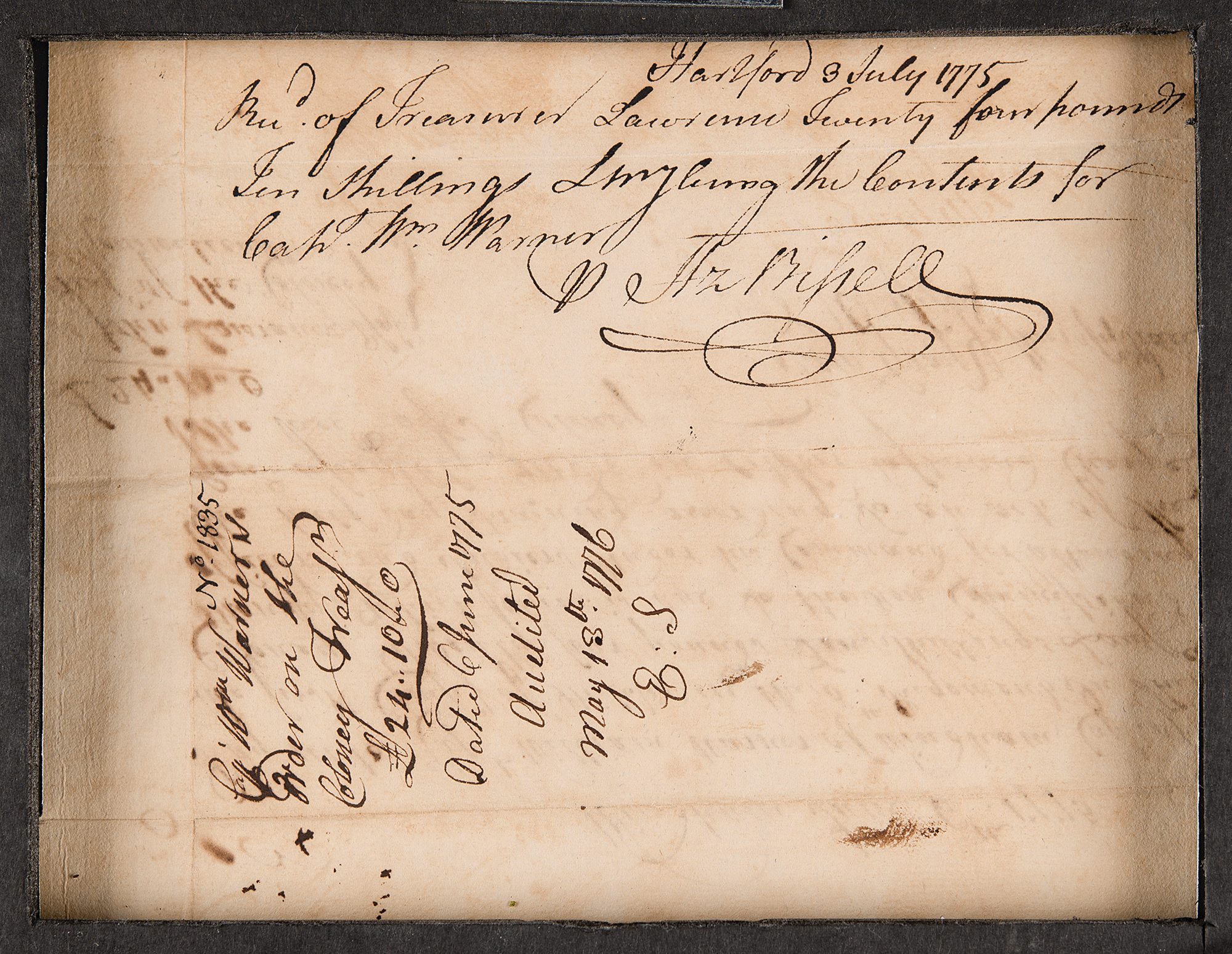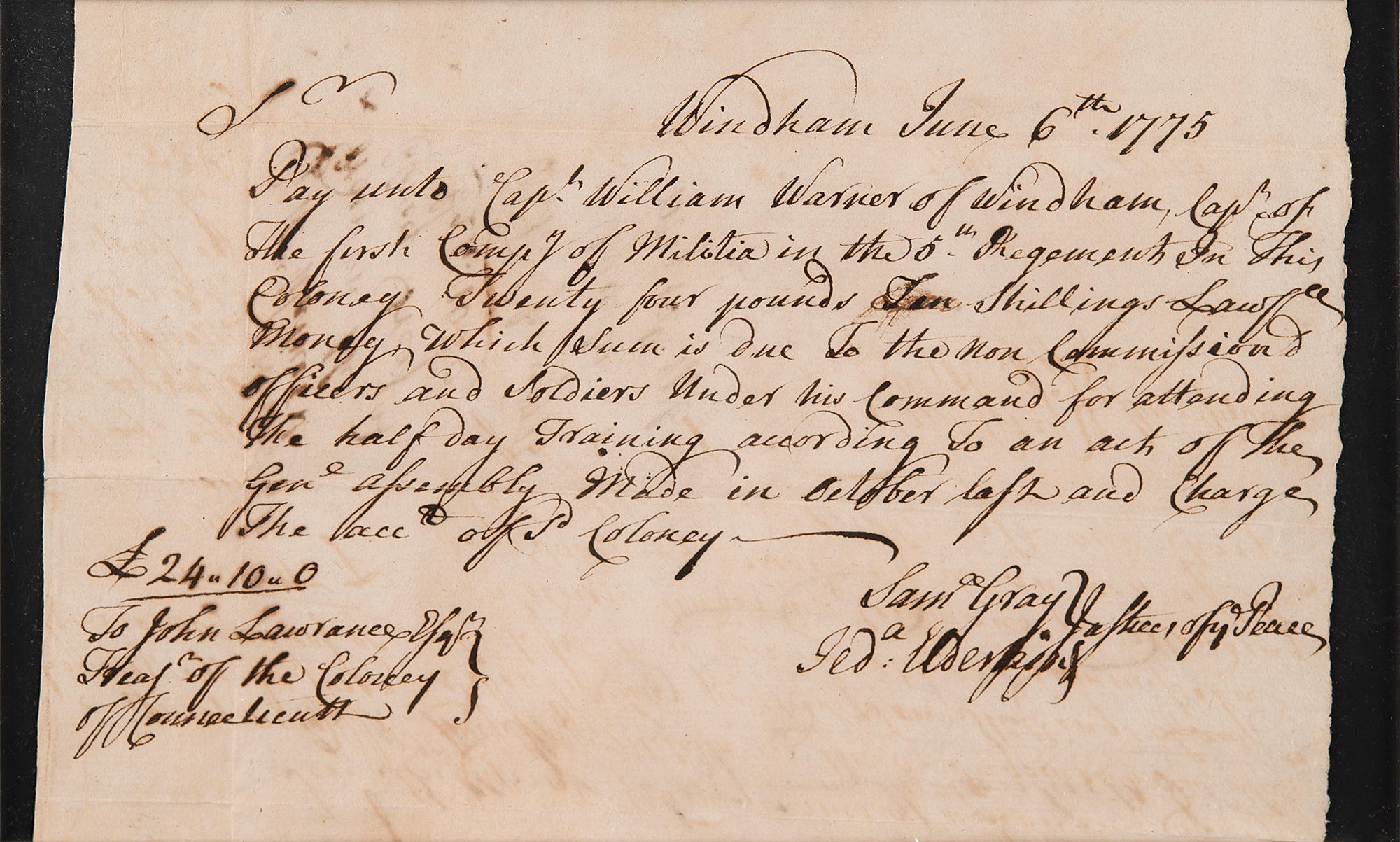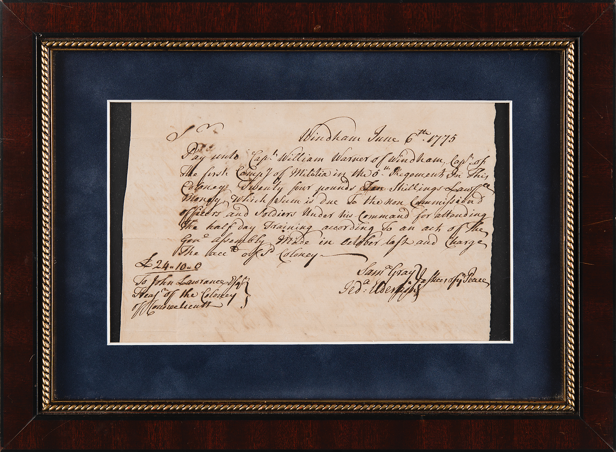 Early Revolutionary War-dated manuscript document, one page, 7.5 x 5, June 6, 1775, roughly a month-and-a-half after Paul Revere’s fateful ride and the Battles of Lexington and Concord. The document is a Connecticut Colony pay order issued to Treasurer John Lawrence, requesting him to pay “Cap’t William Warner of Windham, Cap’t of The first Comp’y of Militia in the 5th Regement In this Coloney Twenty four pounds Ten shillings Lawfull Money, which sum is due to the non commission officers and soldiers under his command for attending the half day training according to an act of the Gen’l Assembly made in October last and charge the acc’t of s’d Coloney.” Signed at the conclusion by two justices of the peace. Matted and framed to an overall size of 12.5 x 9.25; window to frame backing reveals reverse of document. In fine condition.