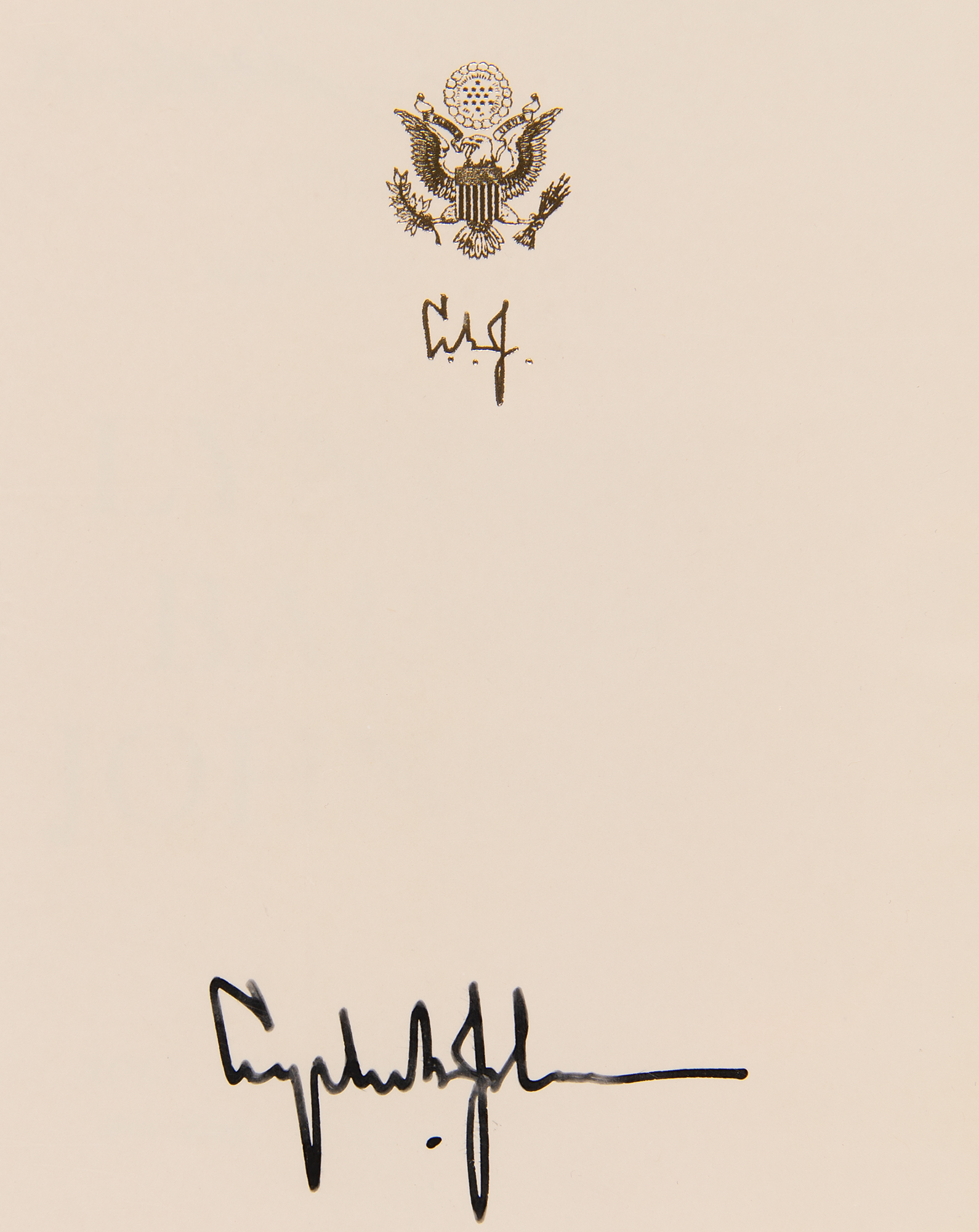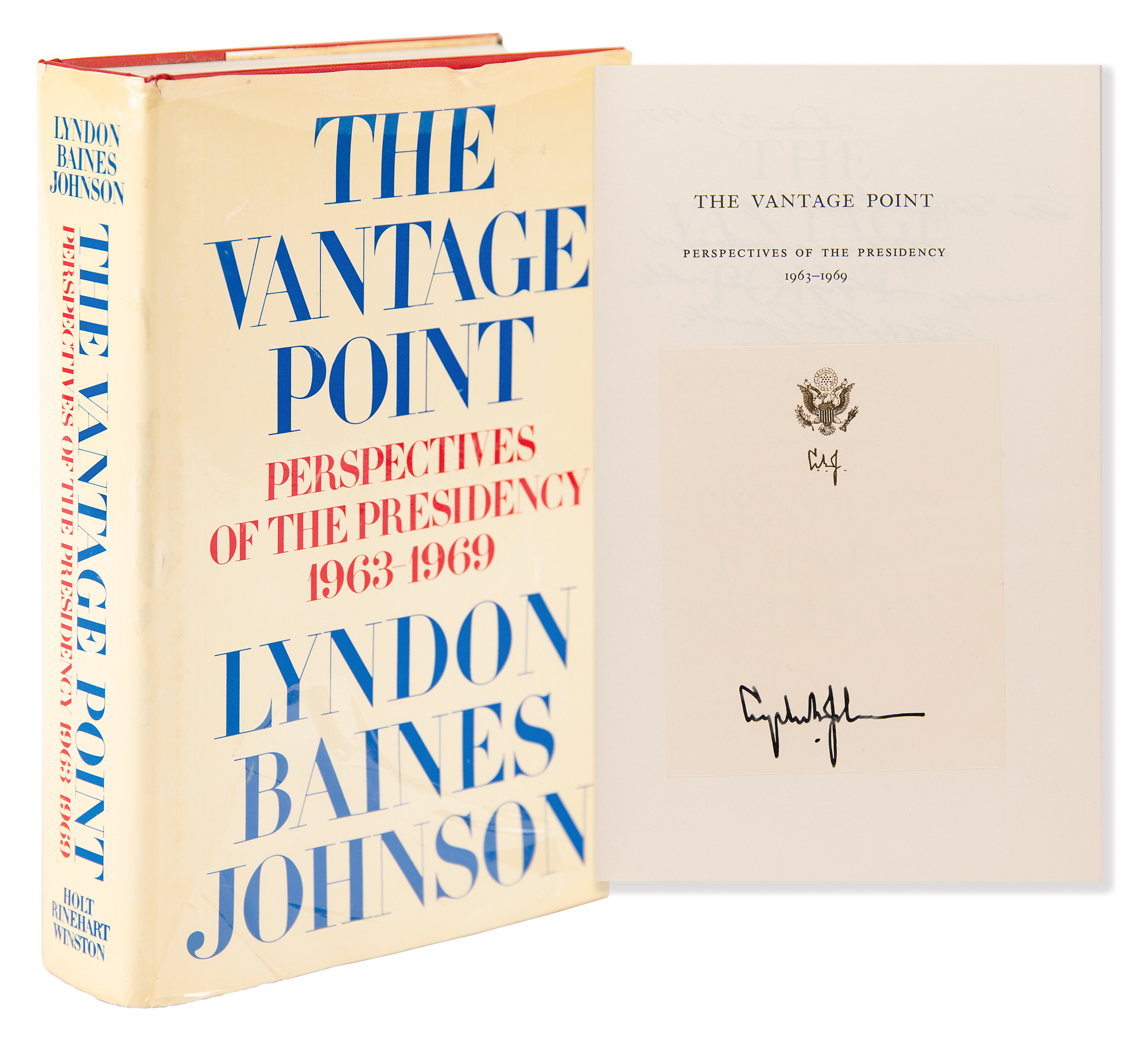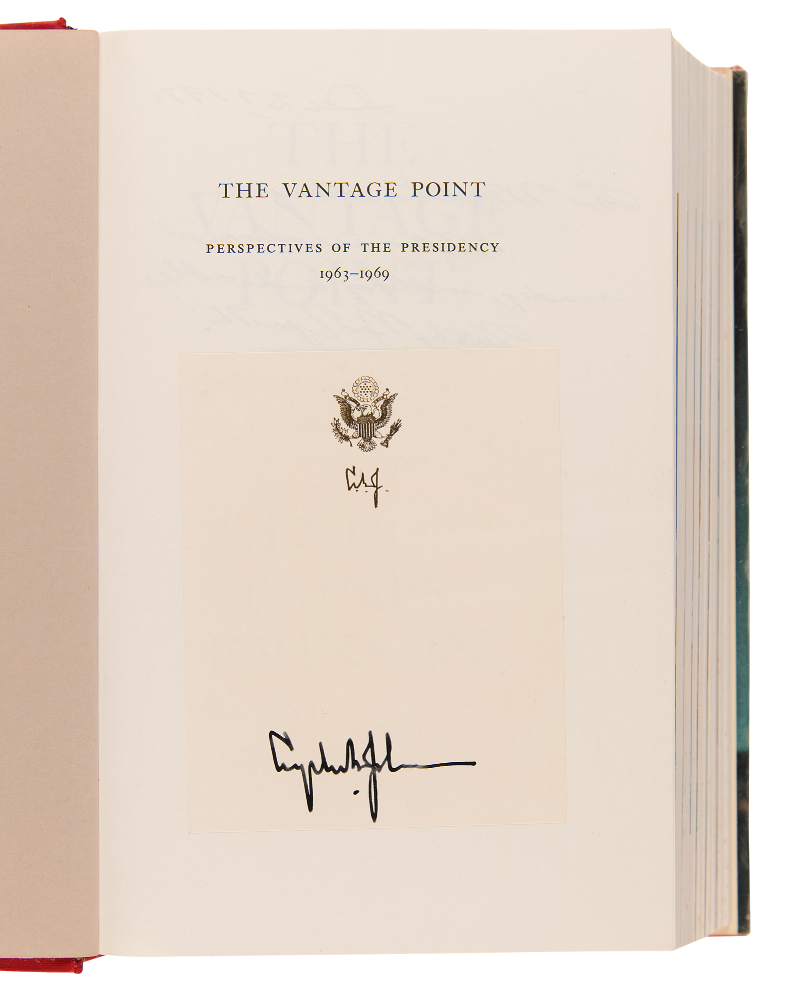 Signed book: The Vantage Point: Perspectives of the Presidency, 1963-1969. First edition. NY: Holt, Rinehart and Winston, 1971. Hardcover with dust jacket, 6.25 x 9.5, 636 pages. Signed in fountain pen by Lyndon B. Johnson on a bookplate affixed to the half-title page. In very good to fine condition, with typical delamination and peeling to the jacket, and a gift inscription opposite the title page.