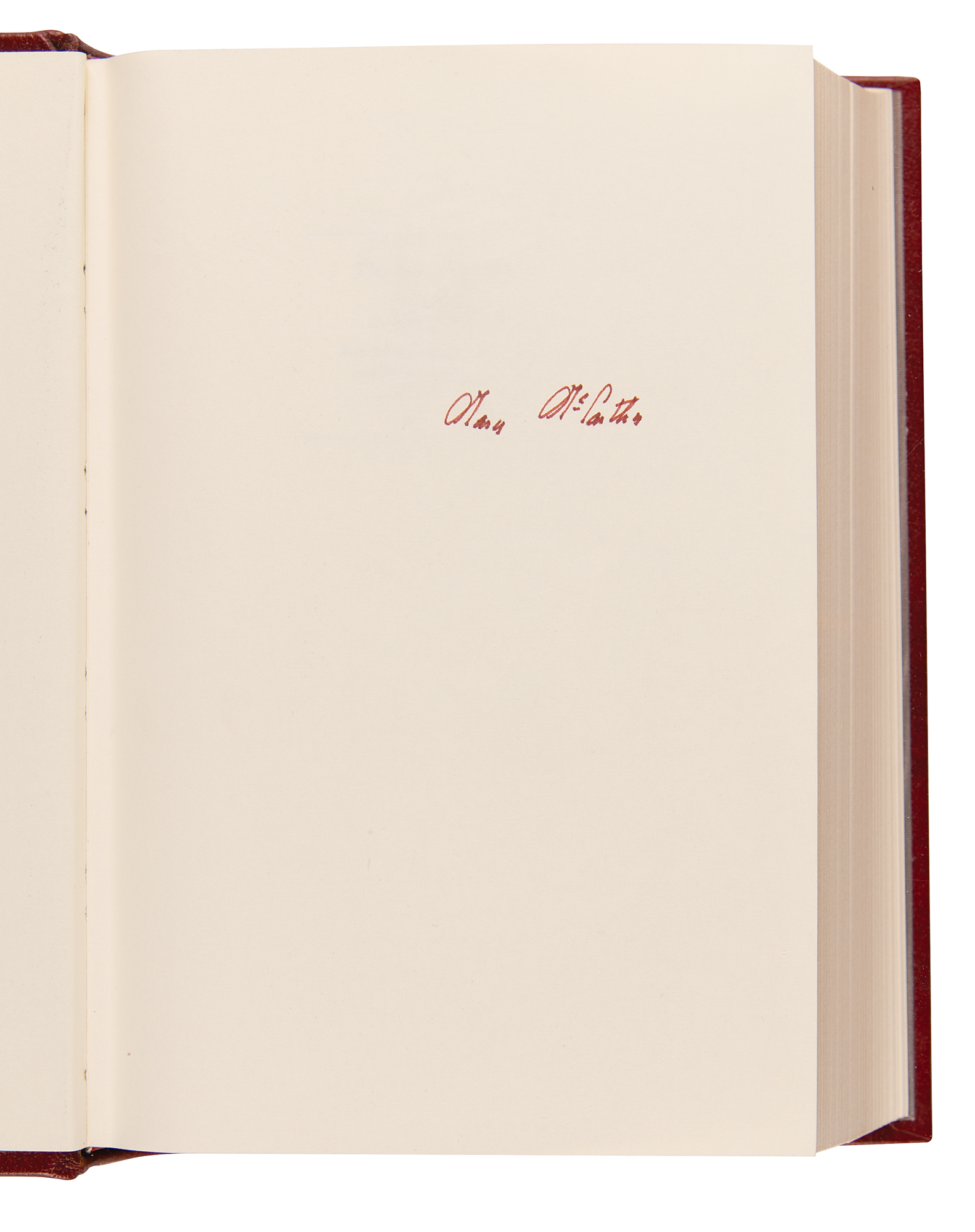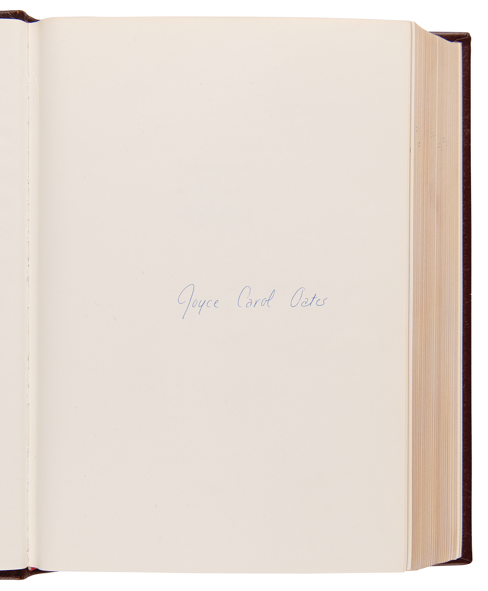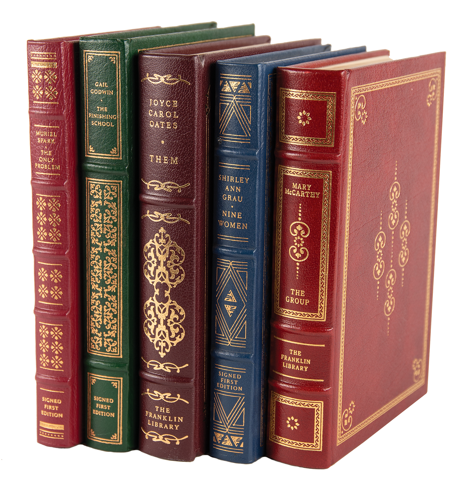 Five leatherbound hardcover limited edition books published by the Franklin Library, each signed inside in ink by the author. Includes: Joyce Carol Oates (Them), Shirley Ann Grau (Nine Women), Muriel Spark (The Only Problem), Gail Godwin (The Finishing School), and Mary McCarthy (The Group). In overall fine to very fine condition.