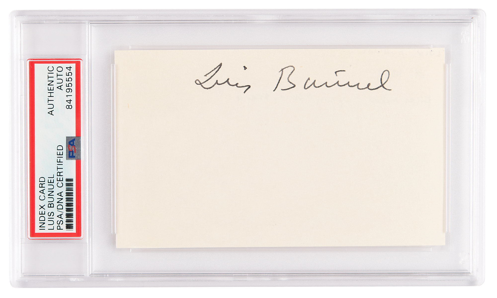 Highly influential Spanish-born filmmaker (1900-1983) remembered for making surrealism irresistible by mixing it with deft film-making techniques and suave direction of action. His Un Chien Andalou (1928) remains an icon of avant-garde cinema. Fountain pen signature, "Luis Bunuel,” on a white 5 x 3 card. In very fine condition. Encapsulated in a PSA/DNA authentication holder.