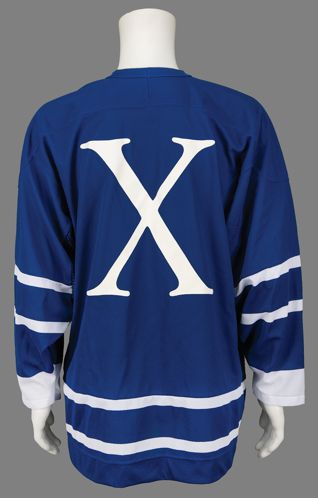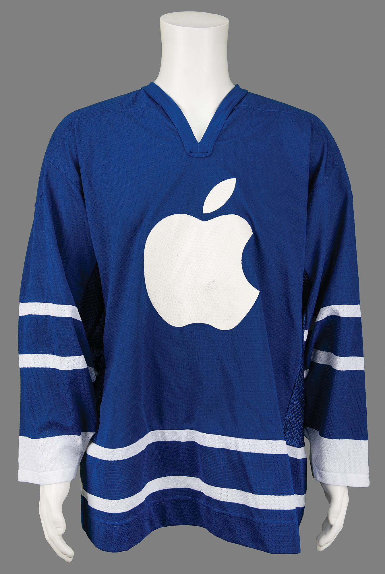 Rare promotional hockey jersey for Apple’s release of the Mac OS X, which became the primary operating system for Apple's Mac computers in March 2001. The blue jersey, size XL, features white stripes to the arms and waist, a large white Apple logo to the front, and a massive white “X” to the back. The jersey’s collar tag bears the Canadian flag. In fine condition, with a couple of small scuffs to the central logo. The consignor notes that this jersey was exclusively presented to Canadian Apple employees to celebrate the launch of OS X in their country.